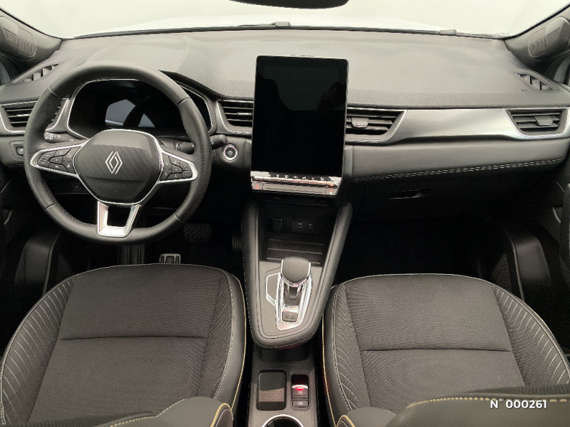 Miroirs de courtoisie rétroéclairés / My Safety switch (raccourci vers configuration personnalisée des aides à la conduite) / Notice d'utilisation digitale embarqué dans le système multimédia du véhicule / Parking mains-libres / Peinture opaque vernie / Poignées de portes ton caisse / Prédisposition éthylotest / Système multimédia openR link 10.4" avecGoogle intégré / Tableau de bord avec écran numérique et personnalisable 10" / Volant chauffant / Système ISOFIX (i-Size) aux places latérales AR et passager AV / Alerte de distance de sécurité / Alerte détection de fatigue / Alerte franchissement de ligne et assistant maintien dans la voie / Alerte sortie sécurisée des occupants / Antenne Requin / Avertisseur d'angle mort et détection AR avec centrage dans la voie / Avertisseur de sortie de stationnement en marche AR avec freinage d'urgence automatique / Boîte de vitesse automatique 4 rapports / Boitier connect AIVC / Caméra 3D vision 360° / Caméra 360° / Cartographie Standard / Ceinture centrale AR 3 points / Compartiment de coffre / Conduite hybride prédictive / Contrôle de la traction (TCS) / Eclairage AV et AR Full LED Pure Vision / Feux AR avec signature lumineuse Y / Feux AR 3D / Frein de parking électrique avec fonction Auto-Hold / Harmonie Ionic / Hayon motorisé mains libres / Indicateur de changement de vitesse / Jantes alliage 19'' diamantées Pulsar / Kit de gonflage / Renault Multi-sense / Répétiteurs latéraux de changement de direction / Rétroviseur intérieur chrome frameless / Sans pontets AR / Sièges AV à réglage électrique 6 voies et conducteur réglage manuel lombaire / Système de contrôle de trajectoire ESC avec aide au démarrage en côte