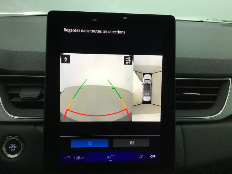 Aide au parking AV/AR et lateral / Alerte de distance de securite / Alerte detection de fatigue / Alerte franchissement de ligne et assistant maintien dans la voie / Antenne Requin / Boite de vitesse manuelle 6 rapports / Boitier connect AIVC / Console centrale AV avec accoudoir et rangement / Controle de la traction (TCS) / Eclairage AV et AR Full LED Pure Vision / Feux AR 3D / Feux AR avec signature lumineuse Y / Frein de parking electrique avec fonction Auto-Hold / Harmonie noire / Indicateur de changement de vitesse / Jantes alliage 18'' diamantees Gravity / Maintenance connectee, incluse pendant 8 ans / Miroirs de courtoisie retroeclaires / Mise a jour systeme (via firmware over the air FOTA), inclus pendant 5 ans / My Safety switch / Ouverture du hayon manuelle / Pack connected driving, inclus pendant 5 ans / Pack controle a distance (via lapplication My Renault), inclus pendant 5 ans / Peinture opaque vernie / Poignees de portes ton caisse / Renault Multi-sense / Repetiteurs lateraux de changement de direction / Retroviseur interieur chrome frameless / Sellerie Techno / Systeme de controle de trajectoire ESC avec aide au demarrage en cote / Systeme multimedia openR link 10.4" avecGoogle integre / Tableau de bord avec ecran numerique et personnalisable 10"