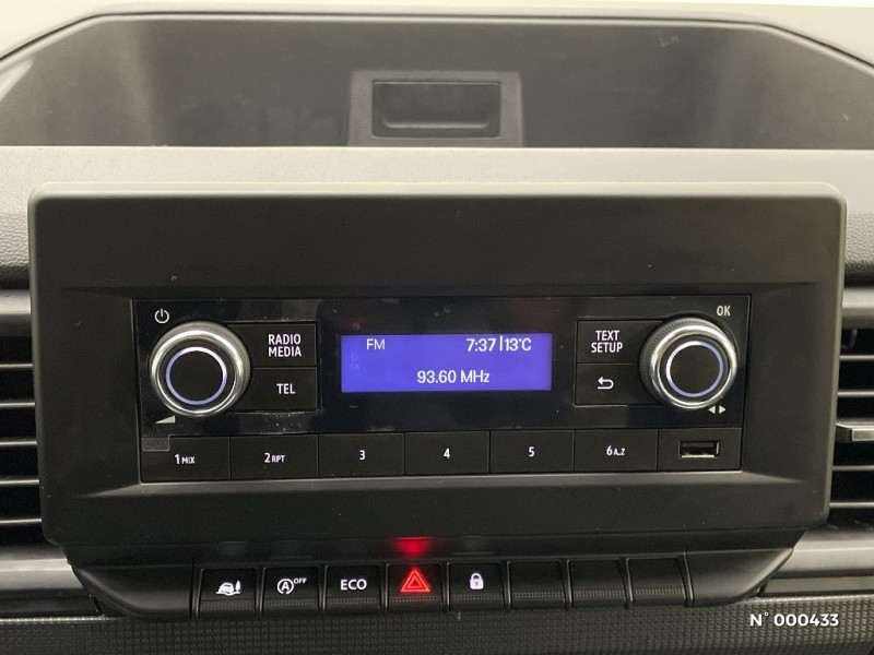 Portes AR 180° tôlées / Sans Crochet-porte manteau / Anneaux d'arrimage côtés de caisse / Côtés de caisse tôlés / Clé 3 boutons / Peinture opaque / Cloison complète tôlée / Loquet de blocage porte AR gauche / Roues tôlées 16" / ABS + EBV + AFU (ABS, Répartiteur Electronique de Freinage, Assistance au Freinage d'Urgence) / Bouclier AV semi-ton caisse +Bouclier AR,Protections latérales, Colonnes feux AR,Rétro "noir grainé" / Habillage latéral mi hauteur / Sans boitier connecté AIVC / Lève-vitres AV impulsionnel côté conducteur / Panneau latéral gauche tolé / Sellerie tissu Kompo / Alerte d'oubli ceinture de sécurité conducteur et passagers / Siège conduct avec réglage lombaires+accoudoir / Avec SCR / Harmonie noir titane grain géométrique / Alerte oubli de ceinture conducteur et passagers / Radio DAB R-20 avec USB, Bluetooth / Eclairage bulbe dans l'habitacle / Tableau de bord analogique couleur 3"5