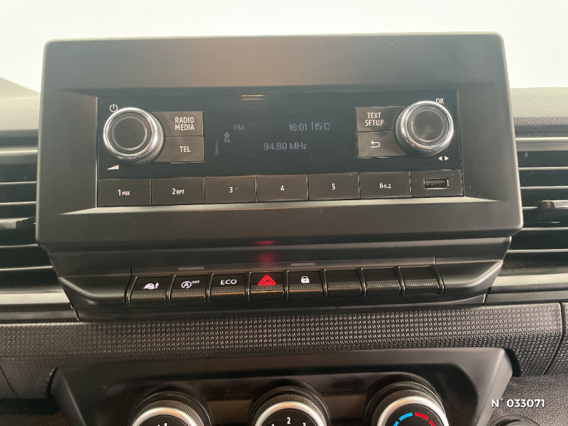 Côtés de caisse tôlés / Clé 3 boutons / Cloison complète tôlée / Loquet de blocage porte AR gauche / Panneau latéral gauche tolé / Sellerie tissu Kompo / Alerte d'oubli ceinture de sécurité conducteur et passagers / Siège conduct avec réglage lombaires+accoudoir / Avec SCR / Harmonie noir titane grain géométrique / Alerte oubli de ceinture conducteur et passagers / Radio DAB R-20 avec USB, Bluetooth / Eclairage bulbe dans l'habitacle / Tableau de bord analogique couleur 3"5 / Bouclier AV semi-ton caisse +Bouclier AR,Protections latérales, Colonnes feux AR,Rétro "noir grainé" / Habillage latéral mi hauteur / Sans boitier connecté AIVC / Lève-vitres AV impulsionnel côté conducteur / ABS + EBV + AFU (ABS, Répartiteur Electronique de Freinage, Assistance au Freinage d'Urgence) / Portes AR 180° tôlées / Sans Crochet-porte manteau / Anneaux d'arrimage côtés de caisse / Roues tôlées 16"