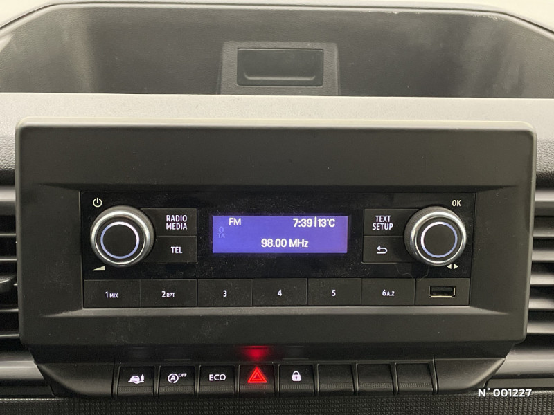 Sans boitier connecté AIVC / Lève-vitres AV impulsionnel côté conducteur / Roues tôlées 16" / ABS + EBV + AFU (ABS, Répartiteur Electronique de Freinage, Assistance au Freinage d'Urgence) / Portes AR 180° tôlées / Sans Crochet-porte manteau / Anneaux d'arrimage côtés de caisse / Côtés de caisse tôlés / Clé 3 boutons / Cloison complète tôlée / Loquet de blocage porte AR gauche / Panneau latéral gauche tolé / Sellerie tissu Kompo / Alerte d'oubli ceinture de sécurité conducteur et passagers / Prise 12V en zone de chargement / Siège conduct avec réglage lombaires+accoudoir / Avec SCR / Harmonie noir titane grain géométrique / Alerte oubli de ceinture conducteur et passagers / Radio DAB R-20 avec USB, Bluetooth / Eclairage bulbe dans l'habitacle / Tableau de bord analogique couleur 3"5 / Bouclier AV semi-ton caisse +Bouclier AR,Protections latérales, Colonnes feux AR,Rétro "noir grainé" / Habillage latéral mi hauteur