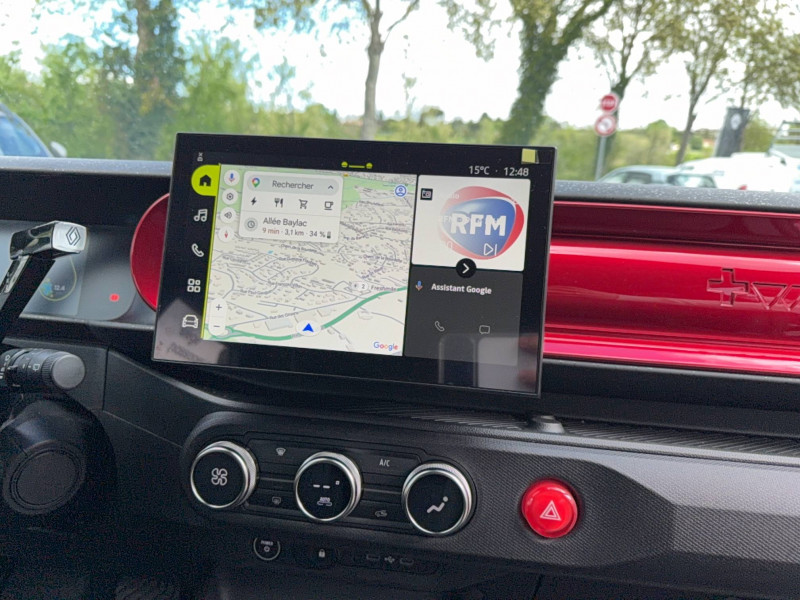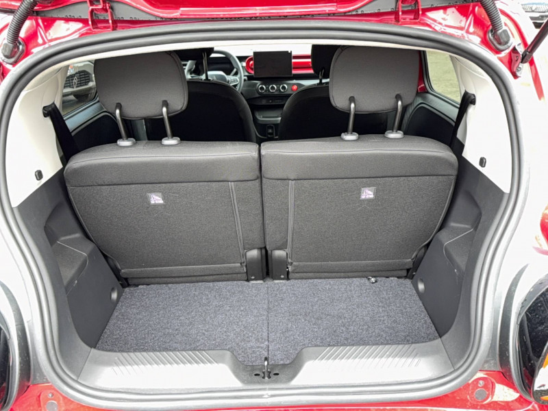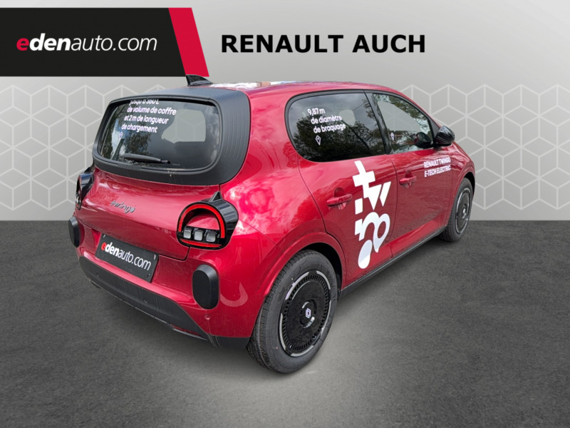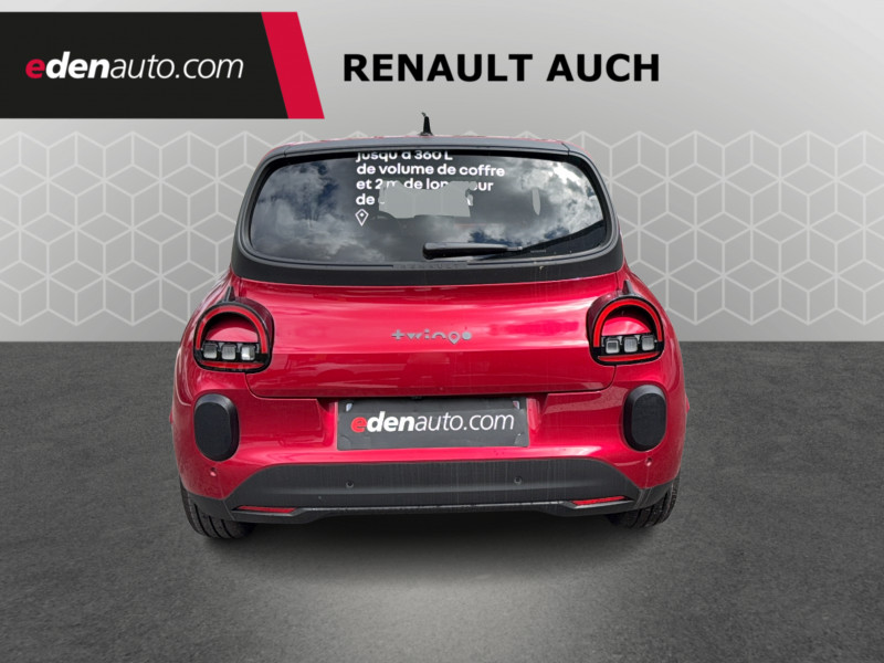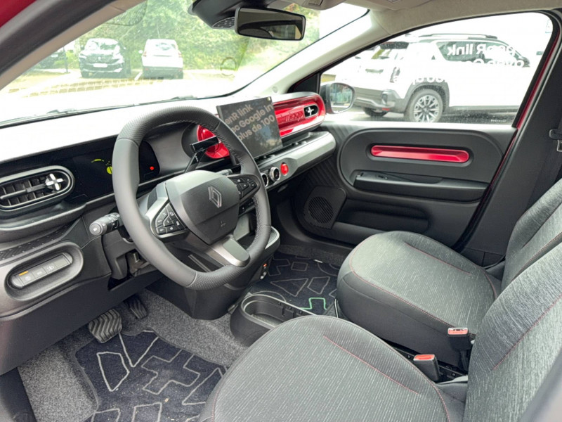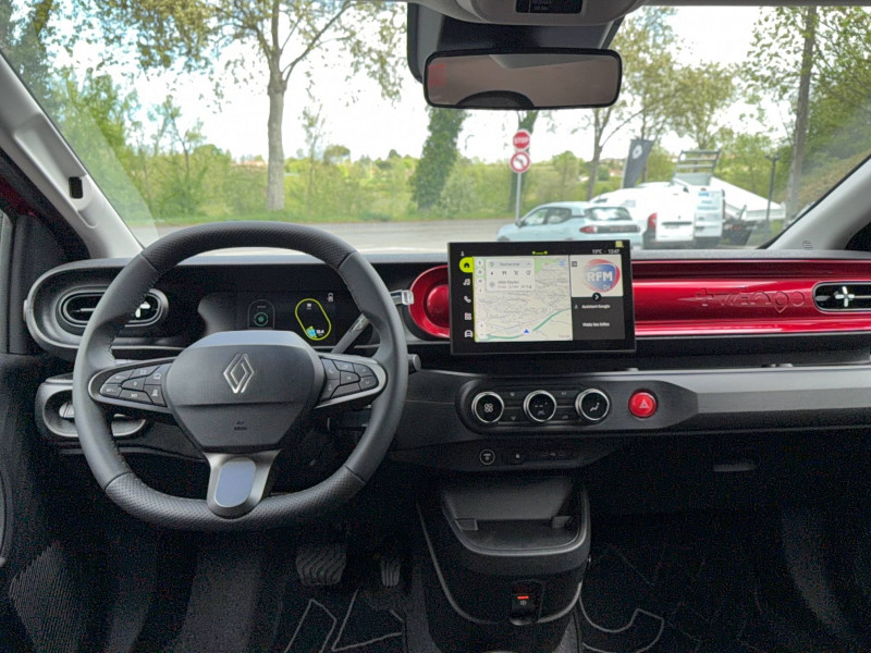 1 feu de recul / 2 prises USB-C et 1 prise 12V / 4 modes de freinage régénératif (dont fonction one pedal) réglables par palettes au volant / Antenne requin / Assistant maintien dans la voie et détection AV avec correction trajectoire d'urgence / Avertisseur de distance de sécurité (AV) / Boîte de vitesse automatisée à variation continue / Bouton my safety switch (désactivation des aides à la conduite) / Câble pour borne de recharge (mode 3 type 2 monophasé, 5m) / Carte mains-libres (accès et démarrage) / Ciel de toit gris clair chiné et embossé avec alphabet Twingo / Commutation automatique des feux de route/croisement / Contrôle de la traction (TCS) / Gestion automatique des essuie-glaces / Jantes acier avec enjoliveur 16" diabolo / Kit de réparation pour pneumatiques / Maintenance connectée, incluse pendant 8 ans / Mise a jour système à distance (via firmware over the air FOTA), inclus pour 5 ans / OpenR link 10,1'' : navigation, Google intégré, audio Arkamys® Auditorium, 6 haut-parleurs / Pack connectivité avancée / Pack standard connectivity, via l'app My Renault / Projecteurs et feux full LED / Reno, l'avatar officiel Renault / Réplication smartphone sans fil / Rétroviseur intérieur avec mode jour/nuit manuel / Sellerie textile chiné dégradé du gris au noir, surpiqûres rouges et jonc graphique noir et blanc / Siège conducteur réglable manuellement en hauteur et siège passager AV avec dossier rabattable / Sièges AR avec système ISOFIX / Sièges AR indépendants coulissants rabattables 50/50 / Son d'alerte piétons / Système de surveillance avancée du conducteur / Tableau de bord numérique 7" / Témoin et alerte de non-bouclage des ceintures de sécurité / Volant textile enduit grainé (TEP)