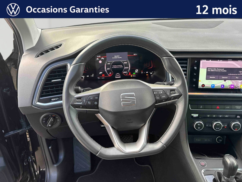 Activation automatique des feux de détresse lors d'un freinage d'urgence / Caméra de recul avec aide au stationnement AR / Climatisation automatique bi-zone Climatronic avec système Pure Air / pneus 215/55 R17 94V / Pack Drive Assist M / Feux de route intelligents / Lane Assist - Correcteur de trajectoire / Pommeau de levier de vitesse cuir véritable / Rétroviseurs extérieurs dégivrants et rabattables électriquement avec abaissement automatique du rétroviseur passager en marche AR / Système Start-Stop automatique et dispositif de récupération de l'énergie de freinage / 2 / Volant Sport multifonctions en cuir à méplat avec palettes / Welcome lights (Éclairage LED projetant Hola! au sol) / 2 Fixations Isofix + Top tether intégrées aux sièges AR pour ancrage de sièges enfant / 4 prises USB-C éclairées / ABS électronique (système antiblocage des roues) avec alerte de pression des pneumatiques / Accoudoir central AV réglable en hauteur et profondeur avec compartiment de rangement / Airbag de genoux (côté conducteur) / Airbags frontaux conducteur et passager (passager déconnectable) / Airbags latéraux tête/thorax AV / Anti-patinage électronique (ASR) / Aumônières de rangement au dos sièges AV / Banquette AR rabattable 2/3-1/3 avec accoudoir et trappe à skis / Connectivity Box avec chargeur à induction / Contour de calandre chromé / Contre-portes en textile Olot / Couvre-coffre rabattable / Différentiel électronique XDS / Digital Cockpit 8 / Détecteur de fatigue / Détecteur de pluie et luminosité / Frein à main électrique / Front Assist : système de surveillance périmétrique avec fonction de freinage de secours en ville / Full Link sans fil (Android Auto + Apple CarPlay) / Inserts de pare-chocs AV/AR chromés / Keyless Access (accès et démarrage mains-libres) avec 2 télécommandes / Poignées de portes couleur carrosserie / Porte-documents sous le siège conducteur / Protections de passages de roues noires / Rails de toit et entourages des vitres latérales chromés / Rétroviseur intérieur électrochrome / Rétroviseurs extérieurs couleur carrosserie / Rétroviseurs réglables électriquement avec rappels latéraux de clignotant intégrés / SEAT Connect Media & Internet / Sièges conducteur et passager réglables en hauteur avec réglage lombaire / Spots de lecture AV/AR / Tableau de bord noir Titane avec insert Gris Atome / Vitres AV/AR électriques à impulsion avec verrouillage