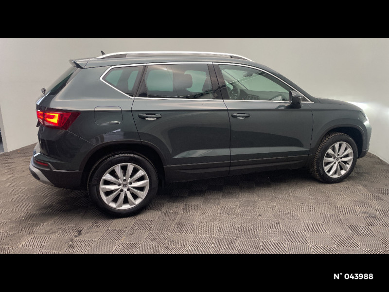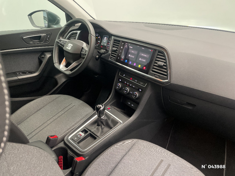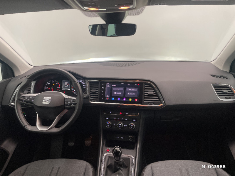 ABS électronique (système antiblocage des roues) avec alerte de pression des pneumatiques / Accoudoir central à l'AV avec compartiment de rangement / Activation automatique des feux de détresse lors d'un freinage d'urgence / Affichage de la périodicité d'entretien / Airbag de genoux (côté conducteur) / Airbags frontaux conducteur et passager (passager déconnectable) / Antenne de toit type "requin" / Anti-patinage électronique (ASR), assistance au freinage d'urgence (EBA) / Aumônières de rangement au dos sièges AV / Banquette AR rabattable en 2 parties asymétriques / Climatisation automatique bi-zone Climatronic avec système Pure Air / Connectivity Box avec chargeur à induction / Console centrale, volant et aérations avec applications noires satinées / Contour de calandre chromé / Rétroviseur intérieur électrochrome sans contour / Différentiel XDS / Frein à main électrique / Front Assist : système de surveillance périmétrique avec fonction de freinage de secours en ville / Full Link (MirrorLink + Android Auto + Apple CarPlay) / Inserts de pare-chocs AV/AR chromés / Jantes alliage 17" Dynamic pneumatiques 215/55 R17 94V / Keyless Access (accès et démarrage mains-libres) / Keyless Access (accès et démarrage mains-libres) avec 2 clefs radiocommandées / Kit anti-crevaison / Lampes de lecture AV/AR / Molette Driving Experience avec SEAT Drive Profile et direction progressive / Oeilletons de fixation (4) dans le coffre / Ordinateur de bord 3,5'' avec affichage de la température extérieure / Pack Drive Assist M Light / Pack Reference / Pare-chocs couleur carrosserie / Peinture vernie Bleu Energy / Pneumatiques à ultra-basse résistance au roulement / Pommeau de levier de vitesse cuir / Pommeau de levier de vitesse cuir synthétique / Porte-documents sous le siège conducteur / Rails de toit et entourages des vitres latérales chromés / Réglage en hauteur et réglage lombaire du siège conducteur / Contre-portes en textile Olot / Couvre-coffre rabattable / Rétroviseur intérieur jour/nuit automatique / Rétroviseurs extérieurs dégivrants et rabattables électriquement avec abaissement automatique du rétroviseur passager en marche AR / Rétroviseurs extérieurs et poignées de portes couleur carrosserie / Rétroviseurs réglables électriquement avec rappels latéraux de clignotant intégrés / SEAT Connect Media & Internet / Sellerie en tissu noir Dallas / tissu Olot avec inserts Noir Titan / Siège conducteur réglable en hauteur manuellement avec réglage lombaire / Siège passager réglable en hauteur manuellement avec réglage lombaire / Sièges conducteur et passager réglables manuellement en hauteur et réglage des lombaires / Spots de lecture AV / Système audio à 4 haut-parleurs avec prise USB-C / Système d'info-divertissement MediaSystem+ avec écran tactile 8,25'' / Système "Start-Stop" automatique et dispositif de récupération de l'énergie de freinage / Tableau de bord noir Titane avec insert gris ATOM / Tapis de sol textile AV/AR / Vide-poches sous siège AV / Vide-poches sous siège passager AV / Welcome lights (à?clairage LED projetant "Hola!" au sol) / 2 Fixations Isofix + Top tether intégrées aux sièges AR pour ancrage de sièges enfant / 2 prises USB-C éclairées / 2 prises USB-C éclairées AR avec filet de rangement pour téléphone mobile