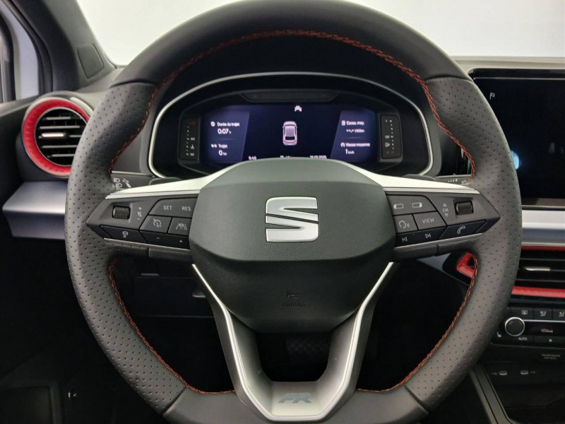 Eclairage d'ambiance intérieur LED paramétrable (rouge ou blanc) / Eclairage de plaque d'immatriculation à LED / Feux AR LED avec signature lumineuse triangulaire / Jantes alliage 17" FR DYNAMIC / Lane Assist - aide au maintien dans la voie / Pack Easy / Pack Rangement / Pack Vision Plus caméra de recul avec aide au stationnement AV et AR / Projecteurs Full LED avec signature lumineuse triangulaire / Système de navigation NaviSystem+ 9,2'' avec SEAT Connect Plus 3 ans / Volant sport multifonctions à méplat en cuir Nappa perforé avec surpiqûres rouges et logo FR / 2 Fixations ISOFIX + Top tether intégrées aux sièges AR / 2 lampes de lecture AV / 4 vitres électriques à impulsion avec sécurité enfant / Airbags frontaux, latéraux et rideaux (passager déconnectable) / Alerte de non-bouclage des ceintures AV/AR / Anti-blocage des roues (ABS) et contrôle de stabilitéélectronique (ESC) / Calandre spécifique Noir Piano avec contour chromé / Connectivité 2x USB-C et Bluetooth / Contre-portes AV en finition textile / Coques de rétroviseurs Noir Piano / Couvre-coffre rabattable / Digital Cockpit 10" / Détection de fatigue et somnolence / Détection de sous-gonflage des pneumatiques / Eclairage d'accompagnement / Entourages d'aérateurs centraux et latéraux gris satinés avec inserts Rouge Laser / Front Assist avec détection des piétons et des cyclistes / Full Link sans fil (MirrorLink + Android Auto + Apple CarPlay) / Garantie 2 ans, kilométrage illimité / Kit anti-crevaison / Logos "SEAT" satinés AV/AR et sur le volant / Pare-chocs couleur carrosserie / Pare-soleil avec miroir de courtoisie éclairé, avec porte-carte côté conducteur / Poignées de portes couleur carrosserie / Rétroviseurs extérieurs couleur carrosserie / Rétroviseurs extérieurs réglables électriquement intégrant les répétiteurs de clignotants latéraux / SEAT Connect / SEAT Drive Profile-sélection du mode de conduite / Signature "Ibiza" manuscrite sur le hayon / Système d'info-divertissement MediaSystem+ avec écran tactile 8,25'' / Tapis de sol textile AV/AR
