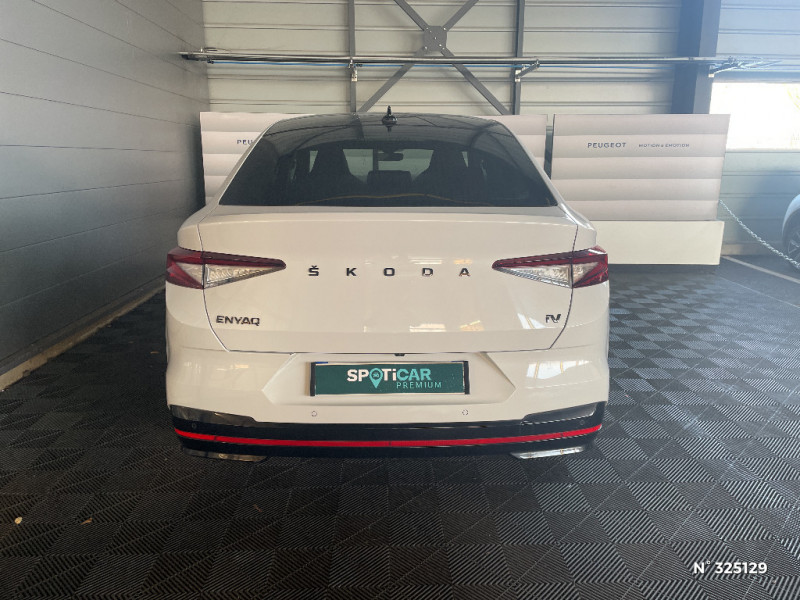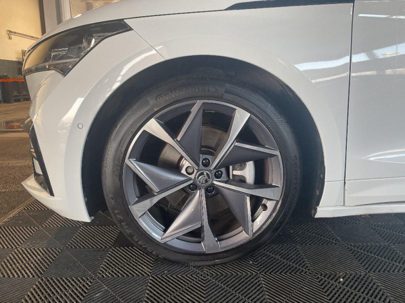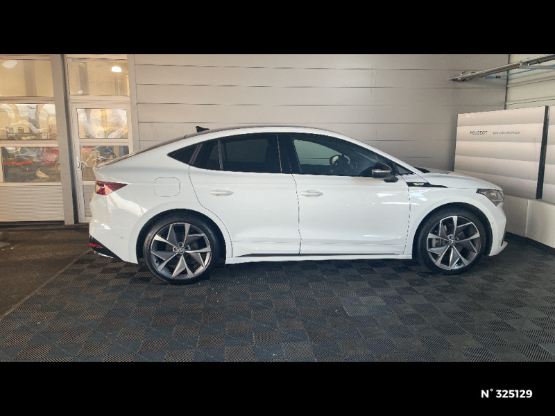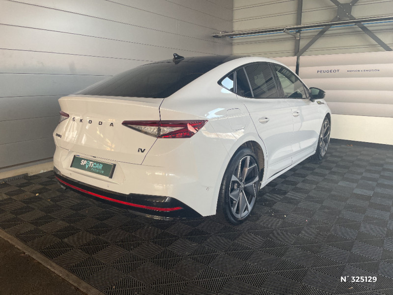 Insonorisation renforcée / Side Assist (détecteur d'angles-morts jusqu'à 70 m) + Rear Traffic Alert + Exit Warning / Siège conducteur à réglage électrique et à mémoire avec réglage lombaire électrique / Signal acoustique et visuel d'oubli de ceinture de sécurité / Smartlink (Mirrorlink, Carplay, Android Auto) / Support tablette sous l'accoudoir central / Système de navigation + Infotainment Online 3 ans SKODA Connect / Système de récuperation d'énergie au freinage / Tapis de sol AV/AR / Volant 3 branches en cuir chauffant multifonctions avec détection des mains / 2 Fixations ISOFIX aux places AR extérieures pour sièges enfants / ancrage pour siège enfant à l'AV / 2 liseuses AV/AR / 2 lumières dans le coffre / 2 ports USB Type-C AR / 2 ports USB Type-C AV / 4 Crochets de fixation dans le coffre / 8 HP / 2 Porte-boissons sur la console centrale / Jantes alliage 20" TAURUS anthracite, Pneumatiques AV: 235/50 R20 AR: 255/45 R20 avec techno SEAL / Jantes alliage 20" TAURUS, Pneumatiques AV: 235/50 R20 AR: 255/45 R20 avec techno SEAL / Kessy Full : système d'accès, de démarrage et arrêt du moteur sans clé (fonctionne sur les 4 portes) / Kit anti-crevaison / Lane Assist (assistant de maintien dans la voie) / Lave-phares haute pression / Radio numérique DAB (Digital Audio Broadcasting) / Range-parapluie dans les portes AV (incluant un parapluie côté conducteur) / Rétroviseur intérieur électrochromatique automatique / Rétroviseurs extérieurs à réglage électrique, dégivrants, rabattables électriquement et électrochromatiques côté conducteur / Sécurité enfants aux portes AR (manuelle) / Services à distance iV (à vie) / Préparation pour attelage / Prise 12 V dans le coffre / Palettes au volant pour sélection du freinage régénératif / Pare-brise chauffant / Pares-soleil avec miroirs de courtoisie et porte tickets / Pédalier aluminium / Peintures unies / Phares AV Full Crystal LED avec technologie Matrix LED (système d'allumage et réglage dynamique des feux de route à LED) / Phares avant Full Crystal LED avec technologie Matrix LED (système d'allumage et réglage dynamique des feux de route à LED) et éclairage auto-adaptatif AFS / Pneumatiques avec technologie Seal / Poignées de maintien / Porte bouteilles (1,5L) dans les portières AV et AR / Porte tickets sur le pare-brise / Porte-gobelet / Porte-stylo et emplacements pour ticket de parking et pièces de monnaie dans la boîte à gants et dans un vide-poche côté conducteur / Porte-ticket sur le montant A du conducteur / Logo d'accueil SKODA projeté sous les portes AV / Pack Black / Intérieur RS LOUNGE - Sellerie cuir/suédine et tissu microfibre avec surpiqures Lime Inserts décoratifs effet carbone, Console centrale noir laqué, Tableau de bord : suédine avec surpiqûres, Eclairage d'ambiance : tableau de bord (10 couleurs), intérieurs de portes, poignées de porte et pieds AV/AR (blanc uniquement) / Accoudoir rabattable avec deux porte-bouteilles de 0.5 l / Accoudoir rabattable utilisable comme table / Airbag central AV entre les 2 sièges / Airbags frontaux (conducteur et passager AV) et latéraux (dans les sièges AV) avec désactivation de l'airbag passager / Appel d'urgence et service pro-actif / Appuie-tête AV non réglable en hauteur - sièges sport avec appuie-tête intégré / Assistance 24 /24 H pendant 7 ans / Aumônières au dos des sièges AV avec emplacement pour smartphone / Avertisseur sonore 1 ton / Bacs de rangement dans les portes AV (pour bouteille de 1,5 l. ) et AR (pour bouteille de 1,5 l) / Badge VRS sur le volant et sur les ailes AV / Banquette AR rabattable 2/3 - 1/3 avec accoudoir central / Bas de caisse peints couleur carrosserie / Batterie garantie 8 ans ou 160000 km (à au moins 70 % de sa capacité d'origine) / Boîte à gants inférieure côte passager fermée et éclairée avec porte stylo / Bouclier AV spécifique à la version RS / Câble de recharge Mode 3 -Type 2 pour borne de recharge (32 A) / Caméra de recul avec buse lavante / Capacité de puissance de recharge maximale sur prise CCS: 135 kW DC / Capacité de puissance maximale du chargeur embarqué pour prise Type 2 : 11 kW AC / Catadioptres dans les portes AV / Climatisation à régulation automatique Climatronic tri-zone / Commande vocale / Compartiment de rangement incluant un parapluie dans la porte conducteur / Compartiments de rangement à gauche et à droite du coffre / Compartiments de rangement à gauche sous le volant / Compartiments de rangement sous la console centrale / Contours de buses de ventilation chromés / Contrôle par le geste et par la voix de l'infodivertissement / Coques de rétroviseurs extérieurs noir glossy / Couvre coffre (planche) / Crochets pour sac dans le coffre (2 à droite, 2 à gauche) / Intérieur Cuir/Suédine RS LOUNGE / Crystal Face - calandre iluminée / Accoudoir central AV et AR avec porte-gobelet et trappe pour le transport d'objets longs AR / Digital Cockpit: tableau de bord numérique personalisable avec écran couleur 5,3'' / Dispositif Phonebox refrigérée avec recharge du téléphone par induction / Driving Mode Select : Sélection du mode de conduite / Eclairage d'ambiance LED / Ecran multimédia 13'' / ESC incluant ABS, EBD, MSR, ASR, EDL, HBA, DSR, RBS, ESBS, TSA, MKB et XDS+ / Feux AR full LED avec clignotants à défilement et fonctions animations des feux / Frein à main électrique / Freinage anti-multicollisions / Freins à disques AV / Freins à tambours AR / Front Assist : freinage automatique d'urgence incluant la protection des piétons et des cyclistes / Garantie 2 ans / kilométrage illimité / Génerateur de son e-noise / Gratte-givre dans le hayon de coffre avec témoin d'usure des pneus / Hayon de coffre électrique incluant ouverture mains-libres (Virtual Pedal) / Inserts décoratifs aluminium brossé / Inserts décoratifs faà§on carbone