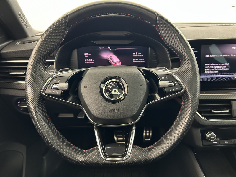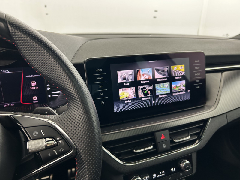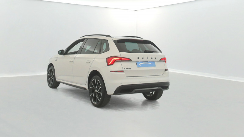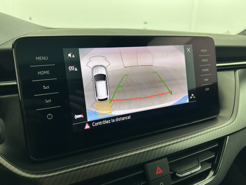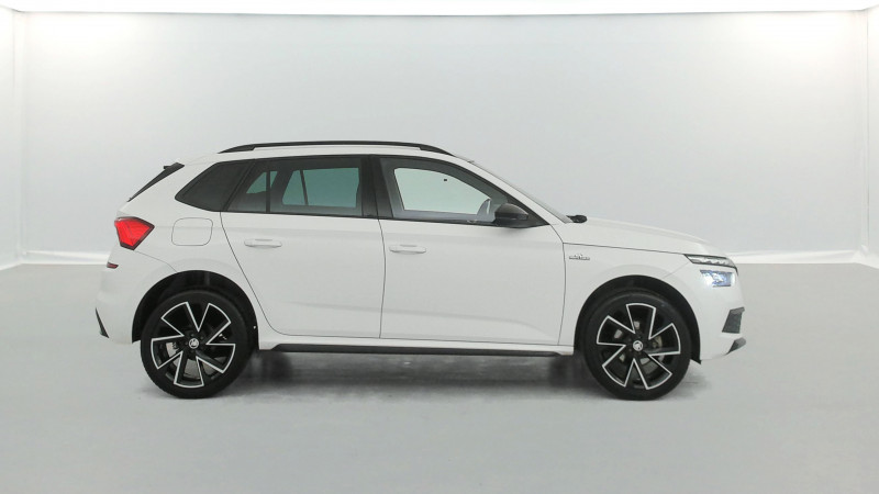 Commandes de climatisation chromées / Airbags frontaux conducteur et passager AV (dont passager déconnectable) / Allumage automatique des feux avec fonctions Coming Home / Leaving Home / Assistance 24 /24 H pendant 7 ans / Aumônières au dos des sièges passagers AV / Avertisseur de ceinture de sécurité non-bouclée / Bacs de rangement dans les portes AV et AR / Blocage de l'arrivée de carburant en cas d'accident / Cache-bagages / Calandre AV noire / Care Connect 1 an / Console centrale avec porte-bouteille et prise 12 V / Correcteur électronique de trajectoire ESC, incl. ABS, MSR, ASR, XDS+, HBA, DSR, MKB, EBV, EDL, RBS, ESBS, TSA / Crochets dans le coffre à bagage / Déblocage automatique des portes et activation des feux de détresse en cas d'accident / Diffuseur AR noir laqué / Digital Cockpit 10" compteurs digitaux personnalisables / Disques de frein AV/AR / Driving Mode Select : sélection des profils de conduite / Eclairage d'ambiance à LED - Blanc / Eclairage de plaque AR à LED / Eclairage du coffre à bagages / Essuie-glace AV type "aéro" avec contrôle d'intermittence / Fixations ISOFIX sur banquette AR incluant 2 Top-Tether / Front Assist: aide au freinage d'urgence incluant détection des piétons / Garantie 2 ans / kilométrage illimité / Infotainment Online 1 an / Insert de bas de caisse noir laqué / Inserts décoratifs sur planche de bord look Carbone avec liseré chromé et insert décoratif de bas de console centrale Noir Piano / Jantes alliage 17" Volans noires cerclées de chrome / Kessy Full : système d'ouverture et de démarrage sans clé / Kit carrosserie spécifique : sabots AV et AR noir laqué, inserts de bas de caisse noir laqué, grille de calandre noire, coques de rétroviseurs noires / Klaxon mono-ton / Lampes de lecture supplémentaires pour conducteur et passager / Lane Assist : système d'aide au maintien dans la voie / Lettrage noir à l'AR du véhicule / Parapluie intégré dans la portière conducteur / Pare-chocs AV avec sabot noir / Pare-chocs couleur carrosserie / Pare-soleil AV conducteur et passager avec miroirs de courtoisie / Pédalier en aluminium / Peinture opaque Bleu Energie / Personnalisation 2.0 / Planche de bord en plastique moussé / Poignées de porte couleur carrosserie / Poignées de portes intérieures chromées / Poignées intérieures de maintien à l'AV et à l'AR avec crochet à l'AR / Pommeau de levier de vitesse et poignée de frein de parking en cuir / Porte bouteilles (0,5L) dans les portières AR / Porte bouteilles (1,5L) dans les portières AV / Porte gilet de sécurité / Porte-ticket sur côté gauche du pare-brise / Préparation pour dispositif d'attelage / Projecteurs AR Full LED avec clignotants à défilement / Projecteurs AV Full LED incluant clignotants à défilement feux antibrouillard avec système d'éclairage auto-adaptatif AFS et éclairage dynamique des angles / Radio numérique DAB (Digital Audio Broadcasting) / Rampes de pavillon noire laqué / Rangement dans le coffre derrière les passages de roues / Réglage lombaire manuel des sièges AV / Rétroviseur intérieur électrochromatique / Sellerie tissu/simili-cuir carbone Monte-Carlo / Services Proactifs incluant e-call / Seuils de portes KAMIQ à l'AV / Smartlink + avec fil (compatible Apple Car Play, Androïd Auto & MirrorLink) et sans fil avec la navigation / Système de navigation Amundsen avec écran couleur tactile 9,2" et Web Radio incluant Digital Cockpit / Système de navigation Amundsen glass design écran tactile capacitif couleur tactile 9,2" (1280x640), 8 hauts-parleurs, 2 ports USB compatibles Apple, affichage 3D, cartographie sur disque dur, disque dur SSD 64 GB, navigateur internet, lecture des SMS, gesture control, mise à jour gratuite de la cartographie / Système téléphone mobile Bluetooth / Tapis de sol AV/AR / Tapis de sol textile AV, AR / Toit vitré panoramique fixe avec store électrique incluant rampes de pavillon noir laqué / Traffic Sign Recognition - Système de reconnaissance automatiques des panneaux de signalisation / Volant sport 3 branches en cuir avec palettes /