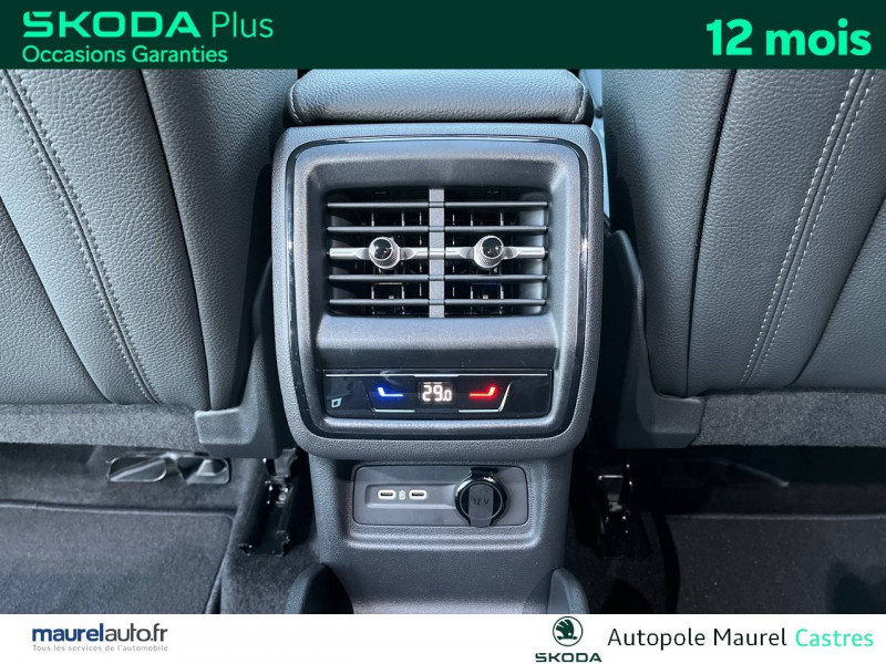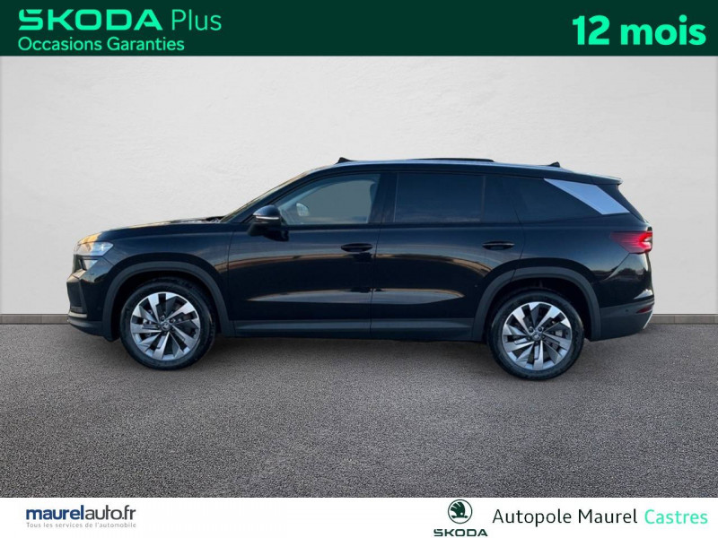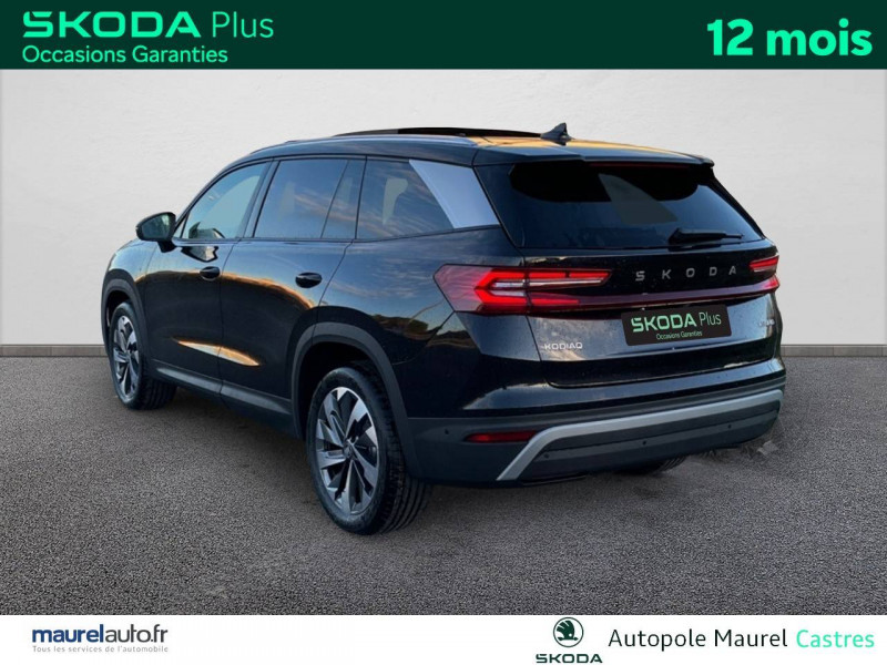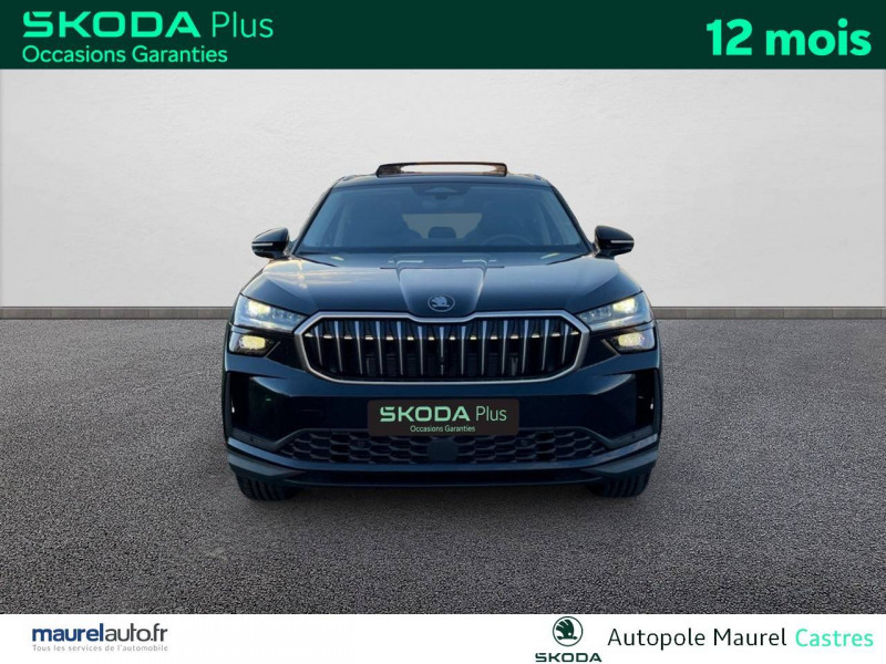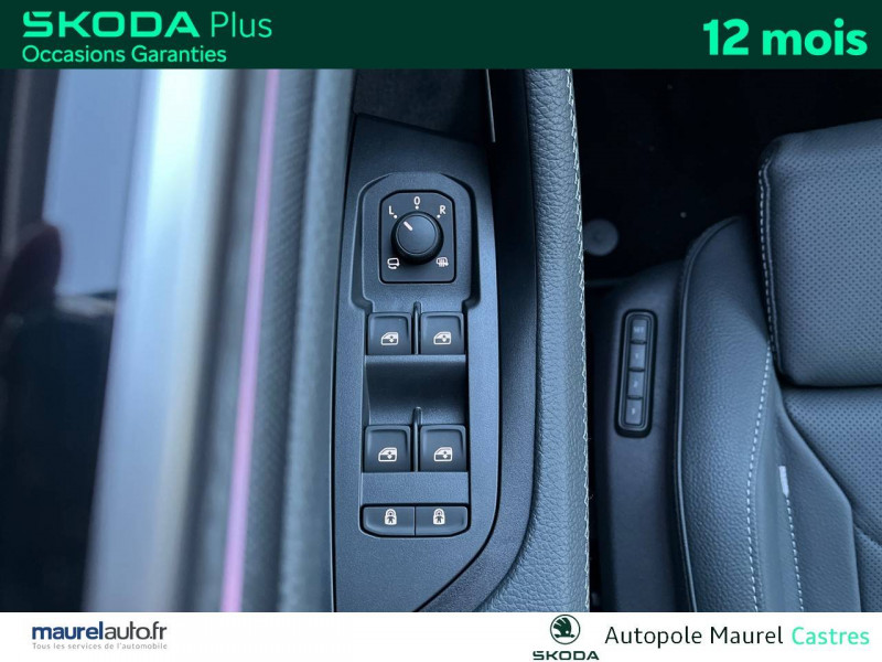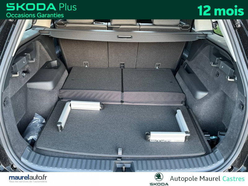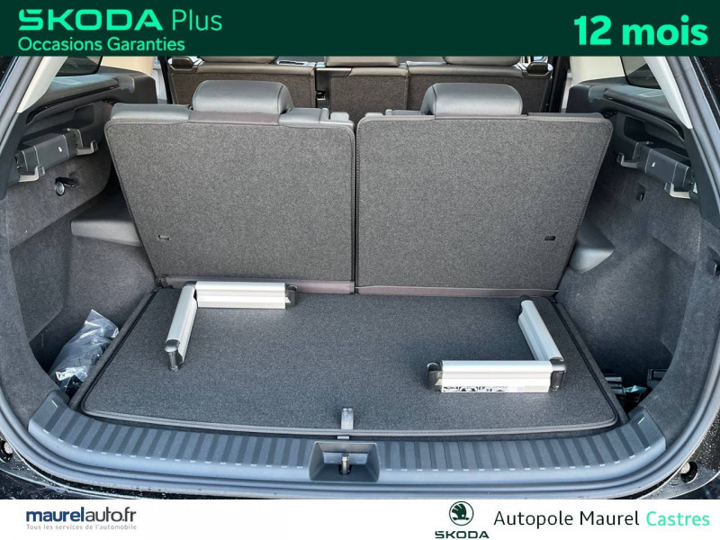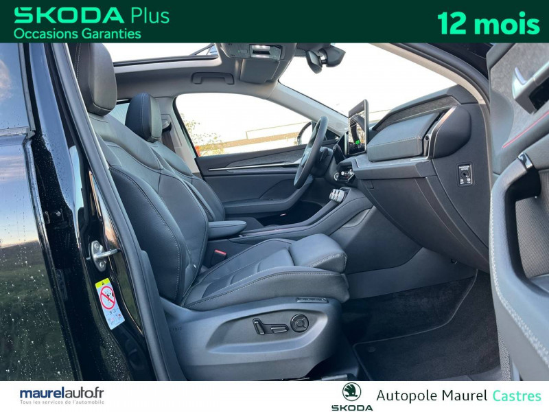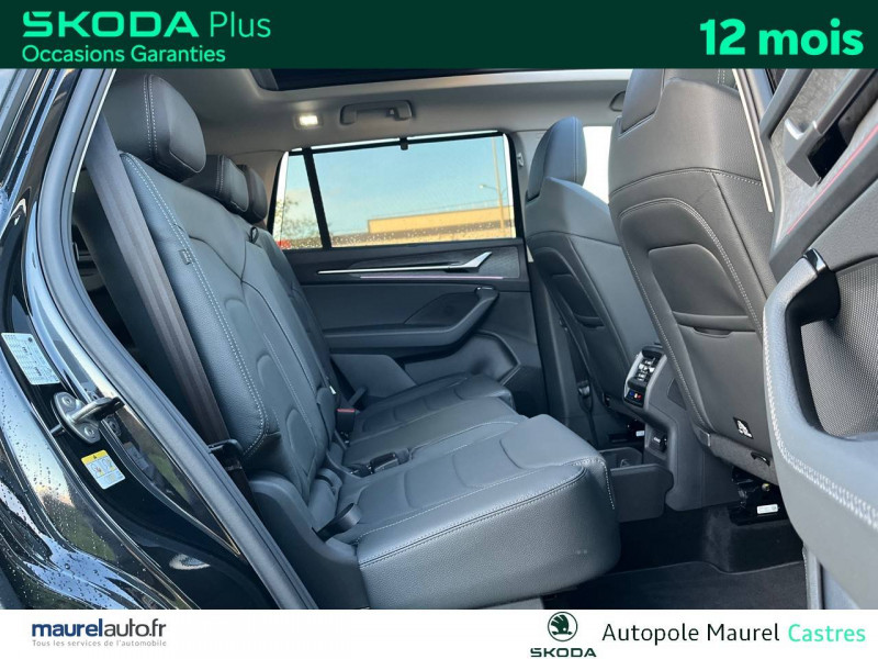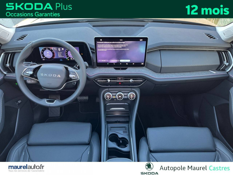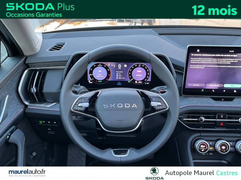 Banquette AR rabattable automatiquement depuis le coffre à bagages / Boîte de vitesse automatique à 7 vitesses / Diffuseur AR noir avec insert Unique Dark Chrome (rendu alu mat) / Ecran d'info-divertissement 13'' avec système de navigation et nettoyeur d'écran / Entourage des vitres noir glossy et pillier montant AR en Unique Dark Chrome (rendu alu mat) / Feux AR full LED avec bandeau décoratif rouge entre les feux (incluant clignotants à défilement et fonction welcome effect) / Feux de jour avec allumage automatique des projecteurs, fonction ''Coming Home'' et ''Leaving Home'' / Front Assist - système de sécurité anti-collision, avertissement et aide au freinage d'urgence pour véhicules, piétons et cyclistes / Grille de calandre noire avec contour Unique Dark Chrome (rendu alu mat) / HHC : Hill Hold Control (aide au démarrage en côte) / Insert décoratif gris design cygne sur planche de bord / contreportes inserts en continuité de la poignée de porte Unique Dark Chrome (rendu alu mat), Habillage matériau synthétique noir ou cognac sur planche de bord / contreportes / poignée de maintien de porte / Intelligent Park Assist (assistant aux manoeuvres de stationnement) / Jantes alliage 19'' Halti antracite Pneus 235/50 R19 / Lettrage Unique Dark Chrome (rendu alu mat) à l'AR du véhicule / Pack Acoustique - Vitrage acoustique sur les vitres AV - Vitres et lunette AR surteintées / Pack Assistance de Conduite Plus - Caméra 360° - Intelligent Park Assist : assistant aux manoeuvres de stationnement - Trained Parking : mémorisation du stationnement - Remote Park Assist : stationnement à distance via Smartphone / Pack Confort Plus Double plancher de coffre, Roue de secours tôle à encombrement réduit, Sièges AV à réglage électrique avec fonction mémoire, et supports lombaire à réglage électrique, Système son CANTON, Fonction Virtual Pedal sur le hayon de coffre: ouverture mains libres / Pack d'Ambiance Intérieur à LED incluant le logo d'accueil SKODA projeté sous les portes AV / Pack KODIAQ 7 places / Pack Look - Entourage des vitres noir glossy - Montant AR en Unique Dark Chrome (rendu alu mat) - Rampes de pavillon Unique Dark Chrome (rendu alu mat) - Seuils de porte AV / Pack Simply Clever Family Airbags latéraux AR, Compartiment de rangement sur le tunnel AR, Pare-soleil pour vitres AR intégrés dans les portières, Poubelle de porte, Protection des arêtes de portes, Support pour tablette / Pack Visibilité Plus Calandre avec bandeau horizontal illuminé reliant les deux phares AV, Phares AV Full Matrix LED ("Welcome effect" effet bienvenu au dévérouillage du véhicule, système d'éclairage auto-adaptatif AFS), Feux AR full LED avec bandeau décoratif rouge entre les feux (incluant clignotants à défilement et fonction welcome effect) / Poignées de portes intérieures Unique Dark Chrome (rendu alu mat) / Préparation pour dispositif d'attelage / Radars de stationnement AV/AR avec assistance à la manoeuvre (stoppe la voiture pour eviter une collision lors d'une manoeuvre) / Rear Cross Traffic Alert (inclus avec le Side Assist) assistant de sortie de stationnement et changement de file via un signal visuel et sonore / Remote Park Assist : stationnement à distance via Smartphone / Toit panoramique ouvrant électrique en verre / Trained Parking :mémorisation du stationnement / 1 ports USB type C de 15kW à l'AV, situé sur le rétroviseur intérieur / 3 Commandes intelligentes SKODA SMART DIALS boutons-poussoirs rotatifs personnalisables avec affichage numérique / 4 crochets porte-sacs rabattables situés dans le coffre + 2 compartiments de rangement dans le coffre / 4 ports USB type C de 45kW (2 dans la console centrale à l'AV et 2 dans la console centrale à l'AR) / 8 HP + 1 HP central (également pour Ecall) / Airbags frontaux conducteur et passager, déconnectable côté passager / Airbags latéraux (thorax) dans les sièges AV / Assistance 24 /24 H pendant 7 ans / Aumônières au dos des sièges AV / Avertisseur de ceinture de sécurité non-bouclée / Banquette AR rabattable 40/20/40, rabattable et coulissante sur 180 mm / Boîte à gants côté passager en partie supérieure du tableau de bord avec surpiqûres / Boîte à gants éclairée côté passager en partie inférieure du tableau de bord / Cargo-éléments flexible pour compartimenter le coffre / Ciel de pavillon gris orage / Commande vocale / Compartiment de rangement central fermé et éclairé sous le système d'info-divertissement incluant la Phonebox / Console centrale AV intégrant un espace de rangement, porte-gobelets et prise 12V / Crew Protect Assist (système de protection proactive des passagers AV et AR) / Crossroad Assist (inclus avec le Front Assist) assistant d'intersection lorsque l'on s'engage sur une route où la vue est obstruée par des obstacles (clôtures, voitures stationnées). L'assistant réagit en cas de danger imminent, si des véhicules ou cyclistes arrivent de côté, en déclenchant une alerte sonore et visuelle, et en activant le freinage d'urgence / Digital Cockpit 10,25": compteurs digitaux personnalisables / Direction assistée asservie à la vitesse / Dispositif Phonebox et recharge par induction réfrigérée pour 2 téléphones délivrant une puissance de 15W par téléphone / Door Opening Alert (inclus avec le Side Assist) : assistant de descente de véhicule via un signal visuel et sonore / Eclairage dans le coffre (2 lampes) / Eclairage de l'espace aux pieds AR / Eclairage de l'espace aux pieds AV / Eclairages dans le ciel de toit à AV / Emergency Assist: réduit le risque d'accident, en cas de malaise du conducteur la voiture le détecte et l'assistant d'urgence s'active en faisant décélérer la voiture jusqu'à son arrêt complet, en la maintenant sur sa voie avec les feux de détresse, le klaxon et l'éclarage intérieur, tout en prévenant les secours avec le système eCall / ESC (incl. ABS+MSR+ASR+EDS+HBA+DSR+RBS+MKB) / Essuie-glace 