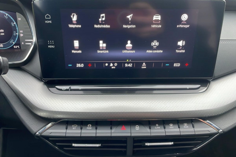 Système Start & Stop déconnectable / Réglage lombaire manuel des sièges AV / Régulateur de vitesse + Limiteur de vitesse / Frein à main électrique / Rétroviseur intérieur électrochromatique (automatique jour/nuit) / Lane Assistant: Assistant de maintien dans la voie / Radio numérique DAB (Digital Audio Broadcasting) / Câble de recharge mode 2 / Câble de recharge mode 3 / Kit de réparation de pneu / Volant 2 branches en cuir, multifonctions et intégrant les palettes au volant / Accoudoir central AR avec porte-gobelets + trappe à ski / Digital Cockpit : tableau de bord numérique personnalisable avec écran couleur 10,2" / 2 ports USB Type-C à l'AV (données et recharge) / Téléphonie mobile Bluetooth / Sellerie Tissu "Ambition" Noire / Rampes de pavillon noires / Front Assistant : freinage automatique d'urgence incluant la protection des piétons et des cyclistes / Smartlink (Mirrorlink, Carplay, Android Auto) sans fil / Sécurité enfant manuelle / Driving Mode Select / Fixations ISOFIX pour siège enfant aux places AR extérieures et sur le siège passager AV / Essuie-glace AV automatique avec détécteur de pluie / Prise 12 V dans le coffre /