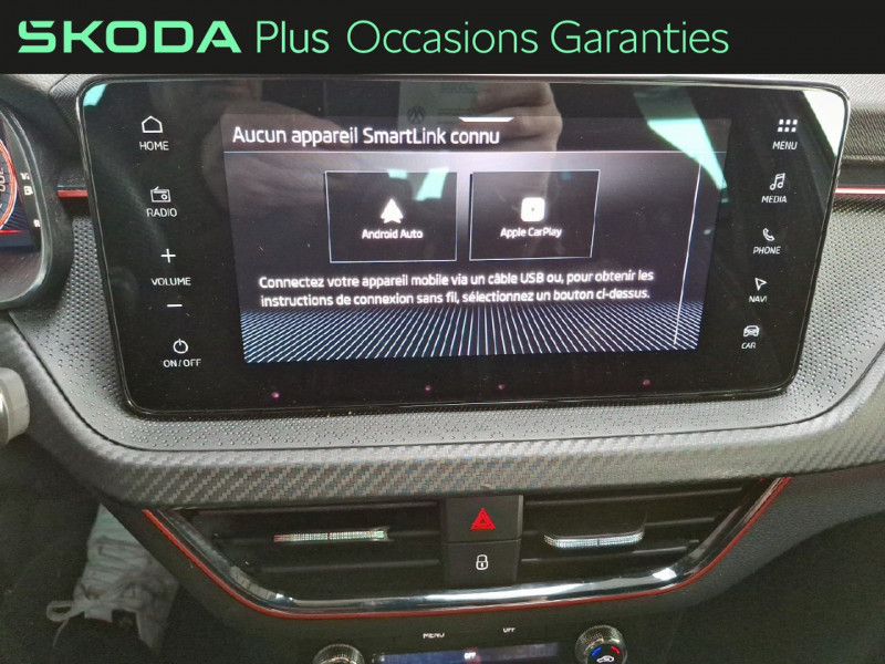 Allumage automatique des feux avec fonctions Coming Home / Leaving Home / Climatronic : climatisation automatique bi-zones + fonction Air Care / Commandes de climatisation chromées / Déblocage automatique des portes et activation des feux de détresse en cas d'accident / Eclairage d'ambiance à LED (blanc/rouge) / Eclairage de plaque AR à LED / Feux AR Full LED avec clignotants à défilement / Feux AV antibrouillard à LED avec fonction corner light, éclairage des angles dans les virages / Front Assist: aide au freinage d'urgence incluant détection des piétons / Jantes alliage 17" Kajam Aero noires / Lane Assist : système d'aide au maintien dans la voie / Pommeau de levier de vitesse et poignée de frein de parking en cuir / Préparation pour dispositif d'attelage / Pédalier look aluminium / Volant multifonctions 3 branches sport en cuir avec palettes / 3ème appuie-tête AR à la place centrale / Accoudoir AV Jumbobox avec surpiqûres / Airbags frontaux conducteur et passager, déconnectable côté passager / Airbags latéraux AV avec airbags rideau / Assistance 24 /24 H pendant 7 ans / Aumônières au dos des sièges AV incluant des rangements pour téléphone / Avertisseur de ceinture de sécurité non-bouclée / Bacs de rangement dans les portes AV et AR / Blocage de l'arrivée de carburant en cas d'accident / Cache-bagages / Care connect + Infotainment Online 3 ans / Console centrale avec porte-bouteille et prise 12 V / Correcteur électronique de trajectoire ESC, incl. ABS, MSR, ASR, XDS+, HBA, DSR, MKB, EBV, EDL, RBS, ESBS, TSA / Crochets dans le coffre à bagage / Diffuseur AR noir glossy / Disques de frein AV/AR / Eclairage du coffre à bagages / Entourage de calandre AV noire / Essuie-glace AV aéro à intermittence,avec capteur de lumière / Fixations ISOFIX sur banquette AR incluant 2 Top-Tether / Gratte-givre intégré dans la trappe à carburant / Infotainment Online 3 ans / Insert de bas de caisse noir glossy / Insert décoratif sur la planche de bord effet carbone avec liseré rouge et inserts de porte matériau synthétique effet carbone / Klaxon mono-ton / Lampes de lecture supplémentaires pour conducteur et passager / Lettrage noir à l'AR du véhicule / Parapluie intégré dans la portière conducteur / Pare-chocs AV couleur carrosserie / Pare-soleil AV conducteur et passager avec miroirs de courtoisie / Planche de bord en plastique moussé / Poignées de porte couleur carrosserie / Poignées de portes intérieures chromées / Poignées intérieures de maintien à l'AV et à l'AR avec crochet à l'AR / Porte bouteilles (0,5L) dans les portières AR / Porte bouteilles (1,5L) dans les portières AV / Porte gilet de sécurité / Porte-ticket sur côté gauche du pare-brise / Radio numérique DAB (Digital Audio Broadcasting) / Rangement dans le coffre derrière les passages de roues / Réglage lombaire manuel des sièges AV / Rétroviseur intérieur électrochromatique / Rétroviseurs extérieurs noirs glossy / Seuils de portes SCALA à l'AV / Système de téléphonie Bluetooth / Tapis de sol textile