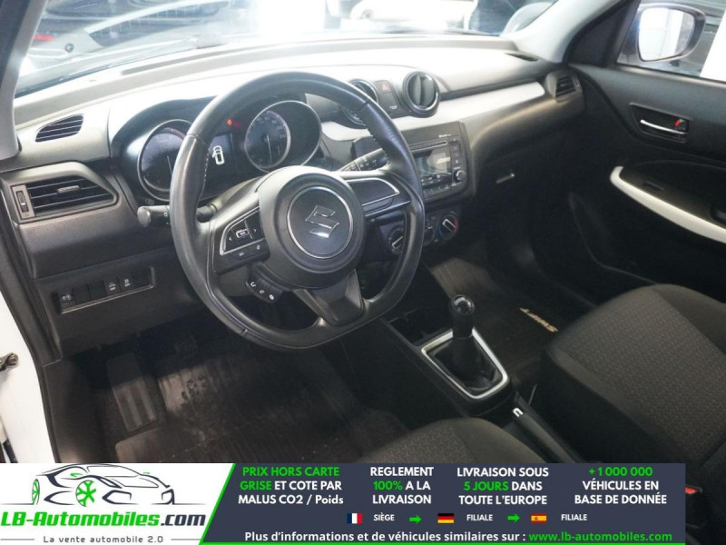Référence : 1149113 Vos Avantages chez LB-AUTOMOBILES.com / Prix affiché TTC Livré hors carte grise / Livraison sous 10 jours dans toute la France hors 31 / Pas d?avance de frais paiement du véhicule 100% à la livraison par virement. Suzuki Swift Neuf remisée, Suzuki Swift Occasion Toulouse Beaupuy 31850, Suzuki Swift Véhicule sorti de réseau collaborateur, Suzuki Swift import, Suzuki Swift importateur, Suzuki Swift Livraison possible dans toute la France sous 5 jours, Suzuki Swift, Suzuki Swift Location Option Achat, Suzuki Swift LLD, Suzuki Swift Longue Durée, Suzuki Swift TVA récupérable. Possibilité d'extension de garantie 12, 24,36 mois, Pour tout autres voitures import neufs ou occasions collaborateur fortement remisée, Mandataire Audi, Mandataire BMW, Mandataire Volkswagen, Mandataire Mercedes, Mandataire Peugeot Espagne, Mandataire Renault Espagne, Porsche import, Mandataire Citroën Espagne, Mandataire Seat Espagne, n'hésitez pas à nous contacter. « Sous réserve de vente préalable et erreur de saisie » Principaux équipements : - ABS - Accoudoir - Antidémarrage - Assistance de démarrage en côte - Assistant d'angle mort - Assistant feux de route - Bluetooth - Carnet d'entretien - Cockpit numérique - Contrôle de la pression des pneus - Direction assistée - ESP - Fermeture centralisée - Feux de jour - Grille de protection pour coffre - Isofix - Jantes alliage - Kit mains libres - Ordinateur de bord - Phare antibrouillard - Phares LED - Pneus été - Port USB - Régulateur de vitesse - Rétroviseur extérieur électrique - Rétroviseurs extérieurs rabattables électriquement - Sièges chauffants - Sièges sport - Suspension sport - Système de détection de la fatigue - Système de reconnaissance des panneaux de signalisation - Système Stop & Start - Traction avant - Tuner/radio - Vitres électriques - Vitres teintées - Volant en cuir - Volant multifonction