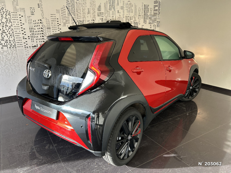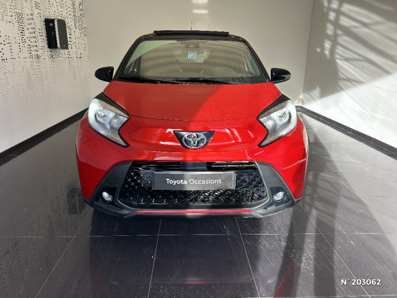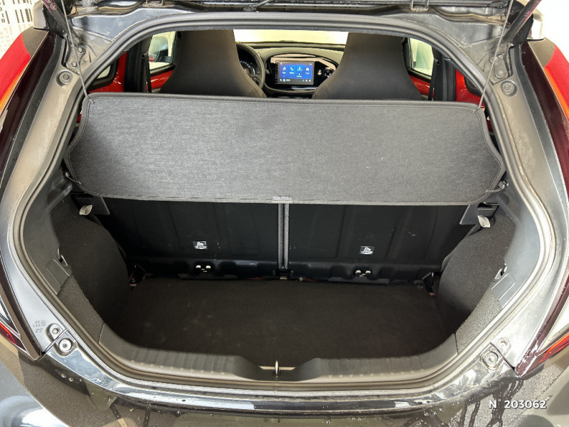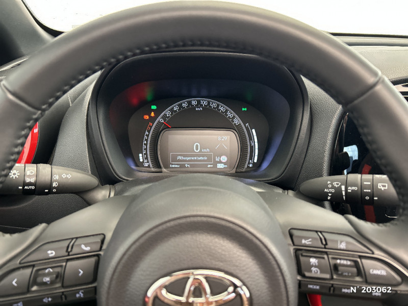 Capote en toile découvrable electriquement / Carrosserie bi-ton avec toit et piliers peints en noir / Ciel de toit noir / Combiné d'instrumentation avec écran couleur TFT multifonction 4,2" / Compte-tours / Connectivité smartphone Apple CarPlay et Android Auto avec câble USB / Contour de console centrale couleur carrosserie / Contour de l'écran tactile noir laqué / Contours d'aérateurs couleur carrosserie / Coques de rétroviseurs extérieurs peintes en noir / Eclairage de coffre / Entourage d'antibrouillards noir laqué / Fermeture centralisée avec commande à distance / Indicateur de perte de pression des pneus / Branche centrale du volant noir laqué / Calandre noir laqué / Insert de pare-chocs AR couleur carrosserie / Kit anti-crevaison / Kit de sécurité / Levier de vitesse en cuir avec surpiqûres couleur carrosserie / Ornements latéraux noirs (partie supérieure du bas de caisse) / Passages de roues et bas de caisse latéraux noirs / Poignées de portes extérieures couleur carroserie / Pommeau de levier de vitesses avec contour chromé / Porte-gobelet / Projecteurs AV et clignotants halogènes / Rétroviseurs dégivrants et réglables électriquement (rabattables manuellement) / Services connectés MyT (Niveau de carburant, trouver mon véhicule, données de conduite, voyants d'avertissements, service et entretien) / Système d'appel d'urgence automatique "E-Call" / Système de freinage antiblocage ABS / Système multimédia Toyota Touch avec écran couleur tactile 8'', radio digitale (DAB), système téléphonique Bluetooth / Systèmes de contrôle de stabilité (VSC) et de motricité (TRC) / Tapis de sol AV/AR / Toyota Safety Sense : Système de sécurité précollision avec détection des véhicules, des piétons et des cyclistes, actif également dans les intersections, Alerte de franchissement de ligne avec aide au maintien dans la voie et assistant de trajectoire, Régulateur de vitesse adaptatif intelligent, Lecture des panneaux de signalisation et Commutation automatique des feux de route / 1 Port USB de type A sur console centrale / 4 HP