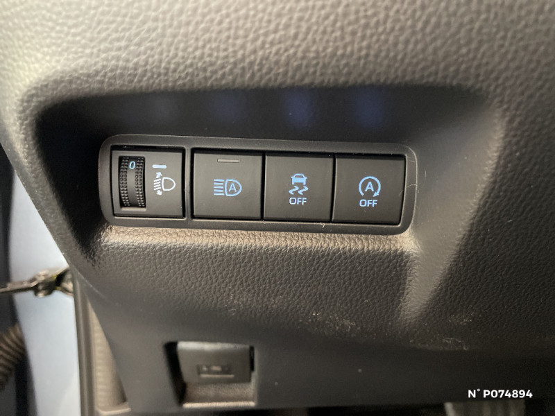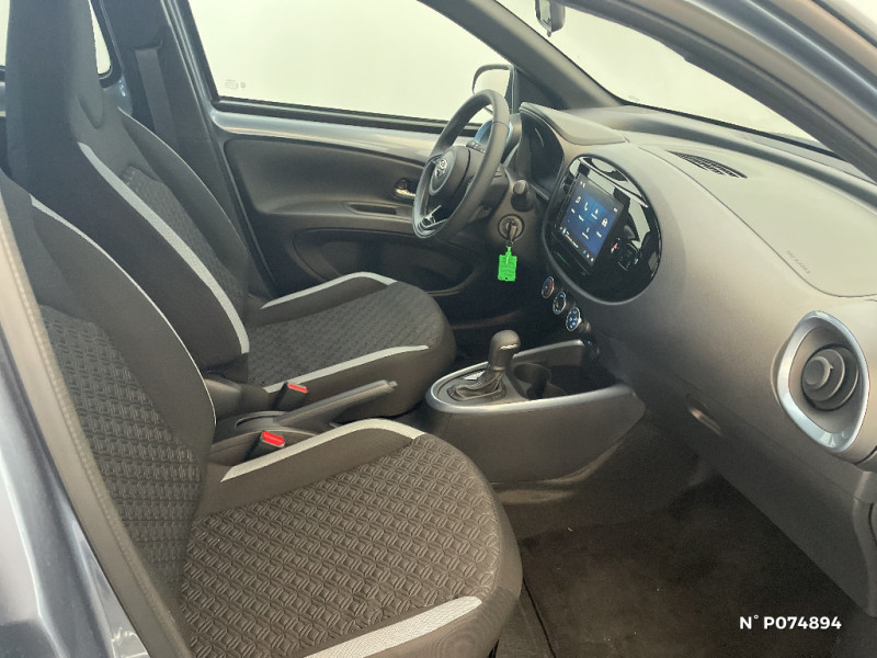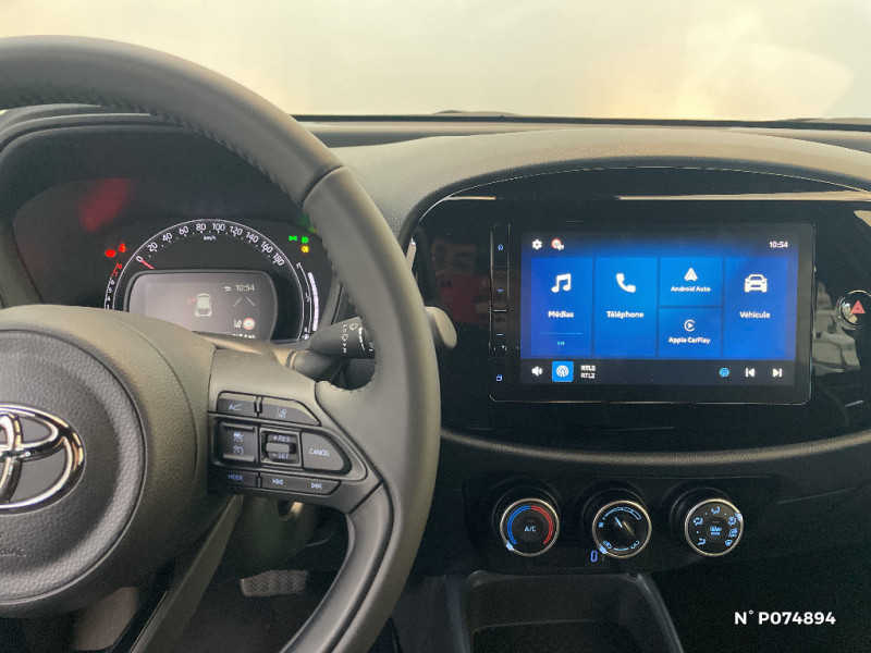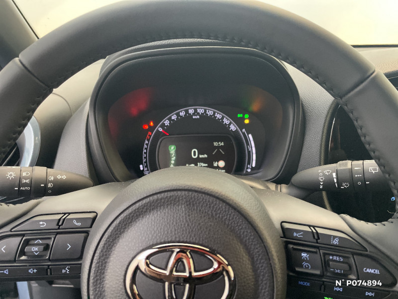 Services connectés standards MyToyota (inclus 10 ans) / Système d'appel d'urgence automatique "E-Call" / Système de contrôle de stabilité (VSC) + Système de contrôle de motricité (TRC) / Système de freinage antiblocage ABS / Système multimédia Toyota Touch 3 avec écran couleur tactile 9" haute définition, Bluetooth, USB, Radio FM et DAB (digitale), Système de connectivité smartphone Apple CarPlay et Android Auto (sans fil) / Insert de pare-chocs AR couleur carrosserie / Jantes en alliage 17" noir usiné avec centre de roue avec logo Toyota noir / Kit anti-crevaison / Indicateur de perte de pression des pneus / Branche centrale du volant noir laqué / Calandre noir laqué / Carrosserie bi-ton avec toit et piliers peints en noir / Ciel de toit noir / Combiné d'instrumentation avec écran couleur TFT multifonction 4,2" / Compte-tours / Connectivité smartphone Apple CarPlay et Android Auto sans fil / Contour d'aérateurs couleur carrosserie / Contour de console centrale couleur carrosserie / Contour de l'écran tactile noir laqué / Coques de rétroviseurs noires / Eclairage de coffre / Fermeture centralisée avec commande à distance / Kit de sécurité / Levier de vitesse en cuir avec surpiqûres couleur carrosserie / Ornements latéraux noirs (partie supérieure du bas de caisse) / Passages de roues et bas de caisse latéraux noirs / Poignées de portes extérieurs couleur carroserie / Porte-gobelets (2) / Projecteurs AV et clignotants halogènes / Rétroviseurs extérieurs électriques, dégivrants et rabattables manuellement / Sellerie tissu avec contour d'assise et de dossier couleur carrosserie / Système multimédia Toyota Touch 3 avec écran couleur tactile 9", radio digitale (DAB) et système de téléphonie Bluetooth / Tapis de sol AV/AR / Toyota Safety Sense Système de sécurité précollision avec détection des véhicules, des piétons et des cyclistes, actif également dans les intersections, Alerte de franchissement de ligne avec aide au maintien dans la voie et assistant de trajectoire, Régulateur de vitesse adaptatif intelligent, Lecture des panneaux de signalisation, Gestion automatique des feux de route / Toyota Safety Sense Système de sécurité précollision avec détection des véhicules, piétons et cyclistes, actif également dans les intersections. Alerte de franchissement de ligne avec aide au maintien dans la file, assistant de trajectoire et détecteur de fatigue, Lecture des panneaux de signalisation avec limiteur de vitesse, Gestion automatique des feux de route, Régulateur de vitesse adaptatif intelligent / Transmission automatique S-CVT avec commande de boîte de vitesses séquentielle / Volant cuir avec commandes au volant / 1 Port USB de type C sur console centrale / 1 prise 12V AV sur console centrale / 4 HP