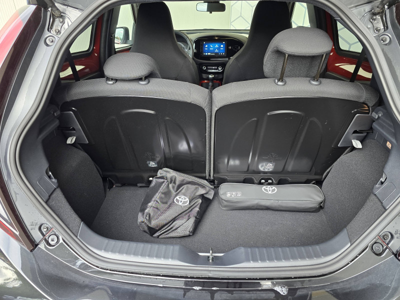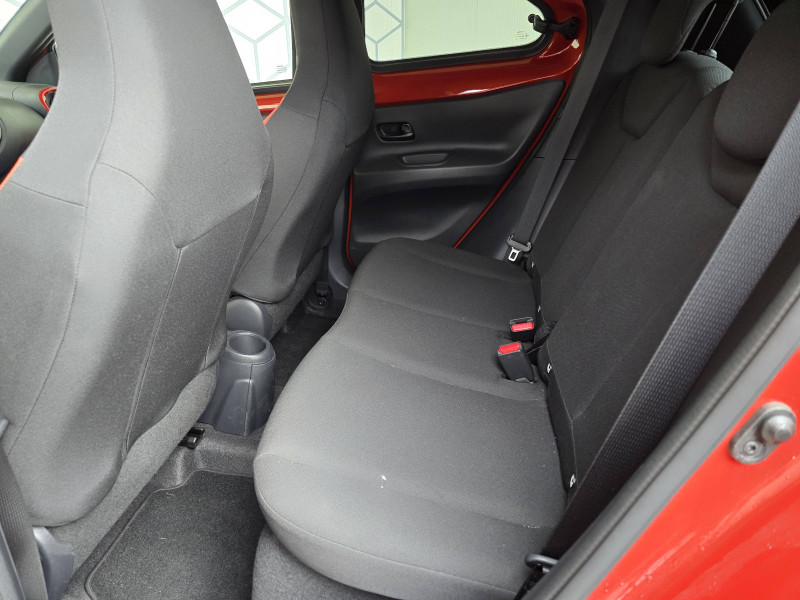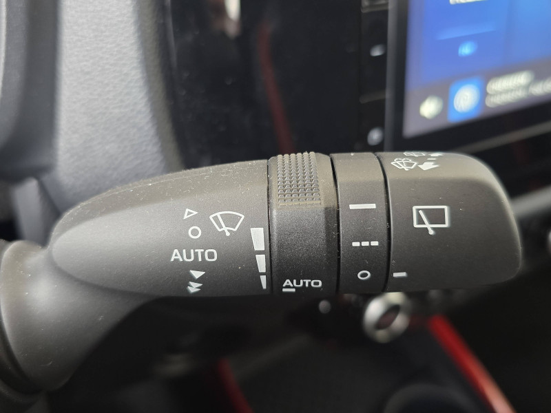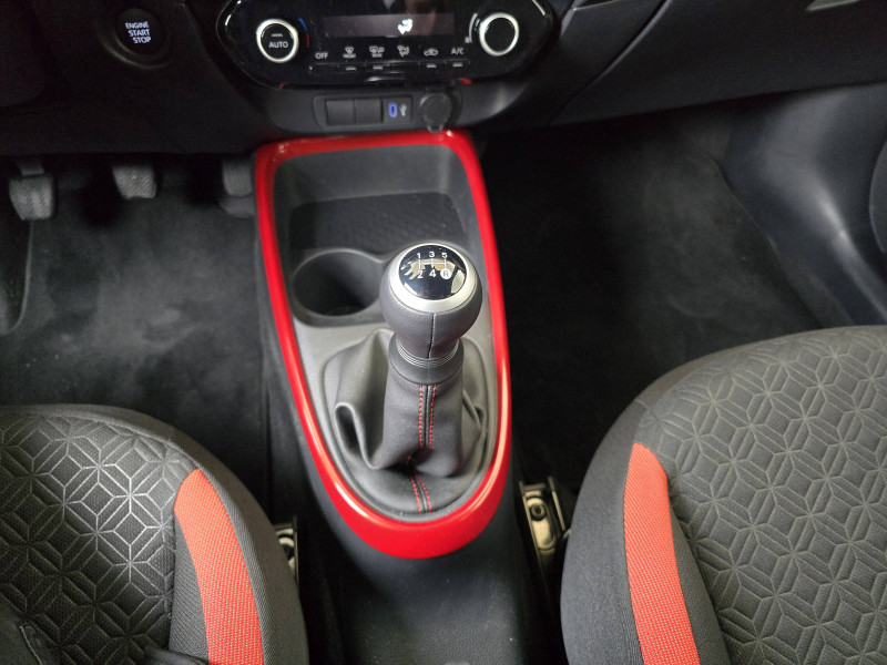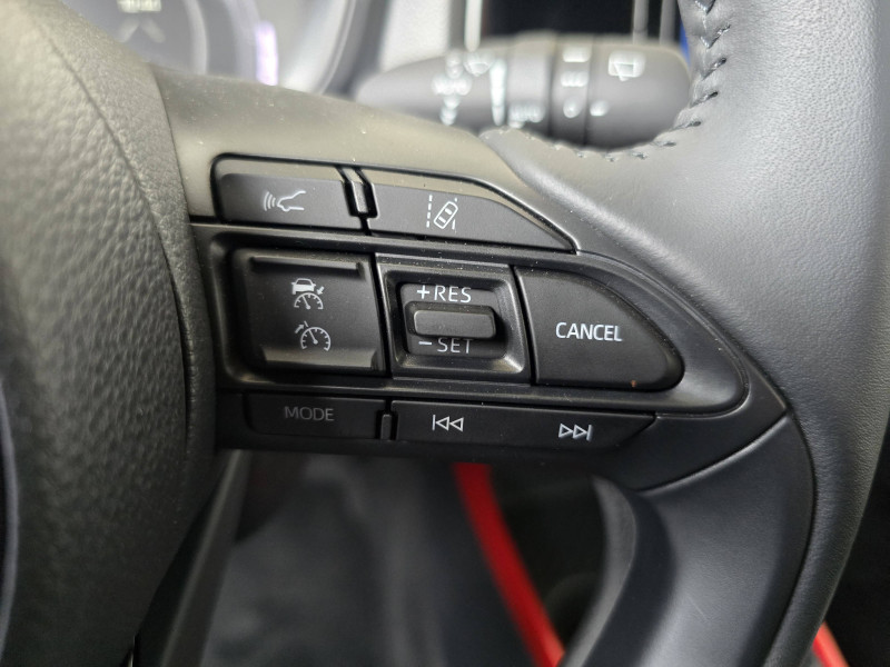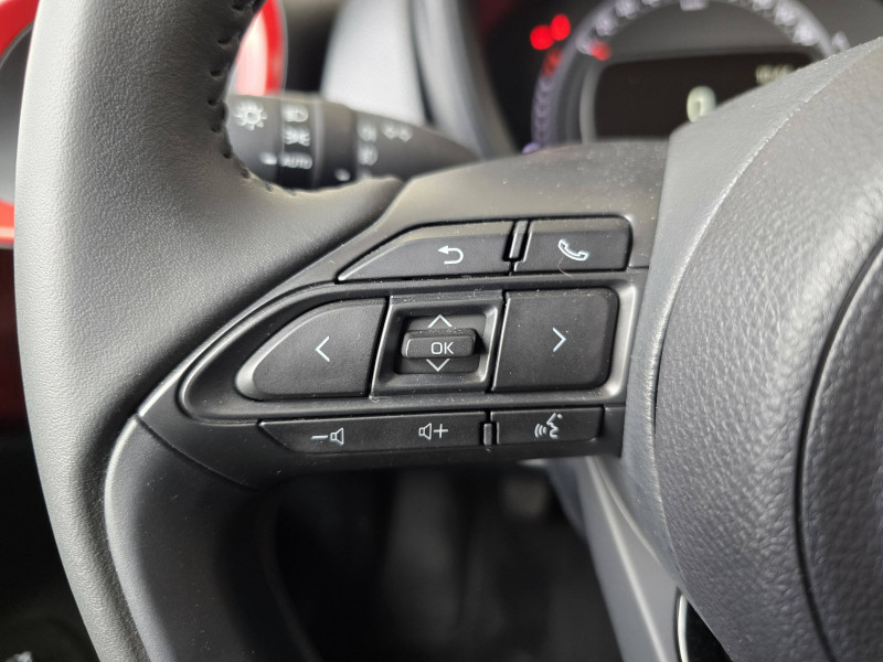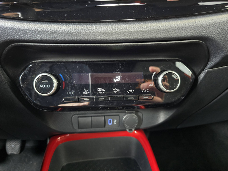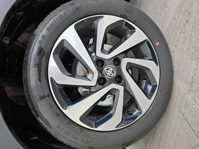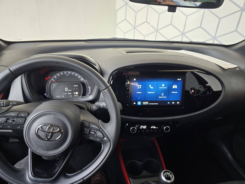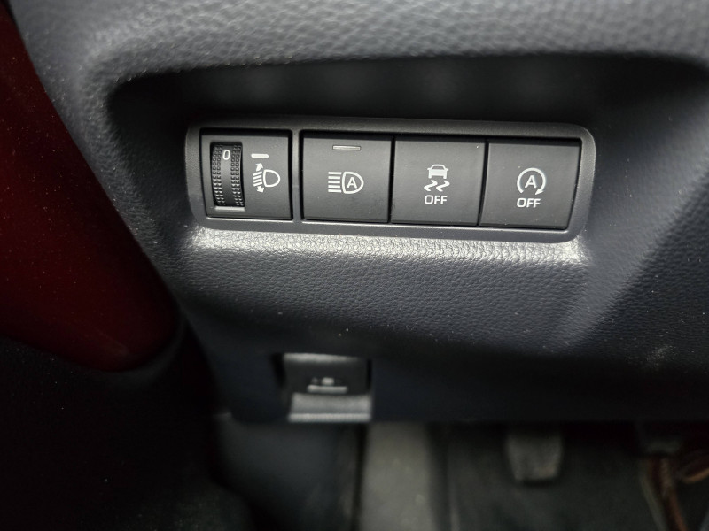 1 Port USB de type C sur console centrale / 1 prise 12V AV sur console centrale / 4 HP / Branche centrale du volant noir laqué / Calandre noir laqué / Carrosserie bi-ton avec toit et piliers peints en noir / Ciel de toit noir / Combiné d'instrumentation avec écran couleur TFT multifonction 4,2" / Compte-tours / Connectivité smartphone Apple CarPlay et Android Auto sans fil / Contour d'aérateurs couleur carrosserie / Contour de console centrale couleur carrosserie / Contour de l'écran tactile noir laqué / Coques de rétroviseurs noires / Eclairage de coffre / Fermeture centralisée avec commande à distance / Indicateur de perte de pression des pneus / Insert de pare-chocs AR couleur carrosserie / Jantes en alliage 17" noir usiné avec centre de roue avec logo Toyota noir / Kit anti-crevaison / Kit de sécurité / Levier de vitesse en cuir avec surpiqûres couleur carrosserie / Ornements latéraux noirs (partie supérieure du bas de caisse) / Passages de roues et bas de caisse latéraux noirs / Poignées de portes extérieurs couleur carroserie / Pommeau de levier de vitesse avec contour chromé / Porte-gobelets (2) / Projecteurs AV et clignotants halogènes / Rétroviseurs extérieurs électriques, dégivrants et rabattables manuellement / Sellerie tissu avec contour d'assise et de dossier couleur carrosserie / Services connectés standards MyToyota (inclus 10 ans) / Système d'appel d'urgence automatique "E-Call" / Système de contrôle de stabilité (VSC) + Système de contrôle de motricité (TRC) / Système de freinage antiblocage ABS / Système multimédia Toyota Touch 3 avec écran couleur tactile 9" haute définition, Bluetooth, USB, Radio FM et DAB (digitale), Système de connectivité smartphone Apple CarPlay et Android Auto (sans fil) / Tapis de sol AV/AR / Toyota Safety Sense Système de sécurité précollision avec détection des véhicules, des piétons et des cyclistes, actif également dans les intersections, Alerte de franchissement de ligne avec aide au maintien dans la voie et assistant de trajectoire, Régulateur de vitesse adaptatif intelligent, Lecture des panneaux de signalisation, Gestion automatique des feux de route / Volant cuir avec commandes au volant