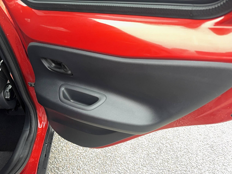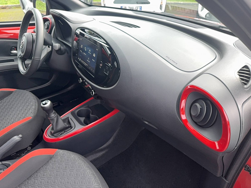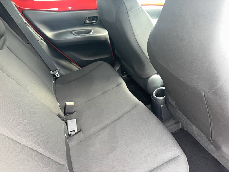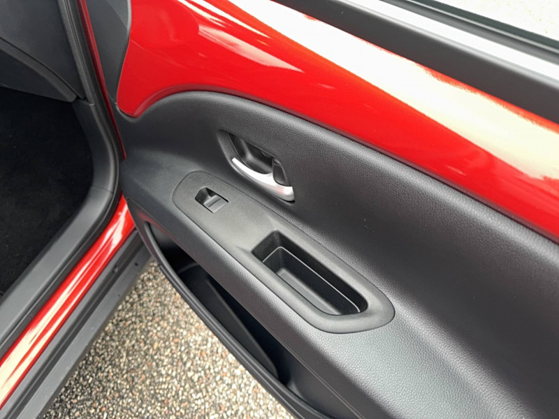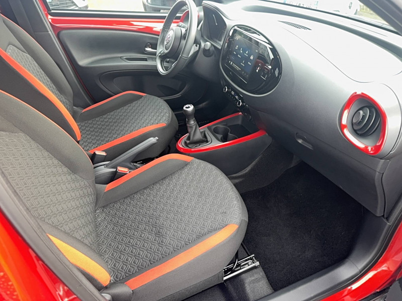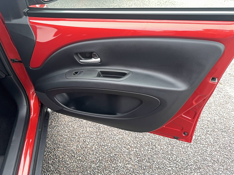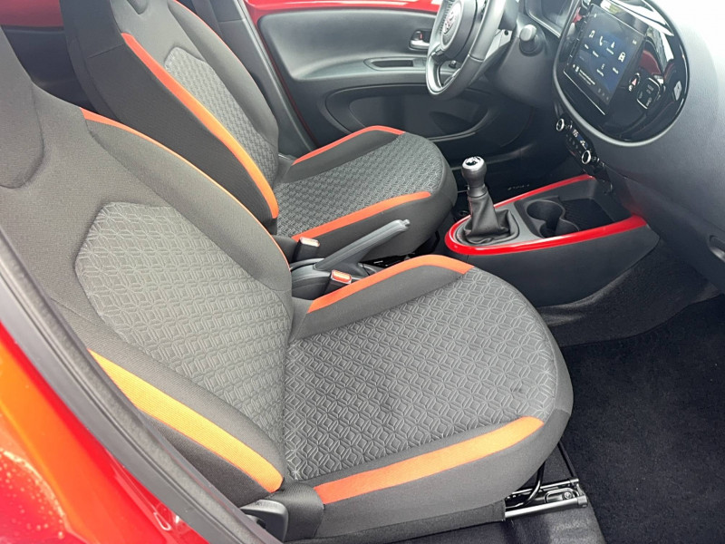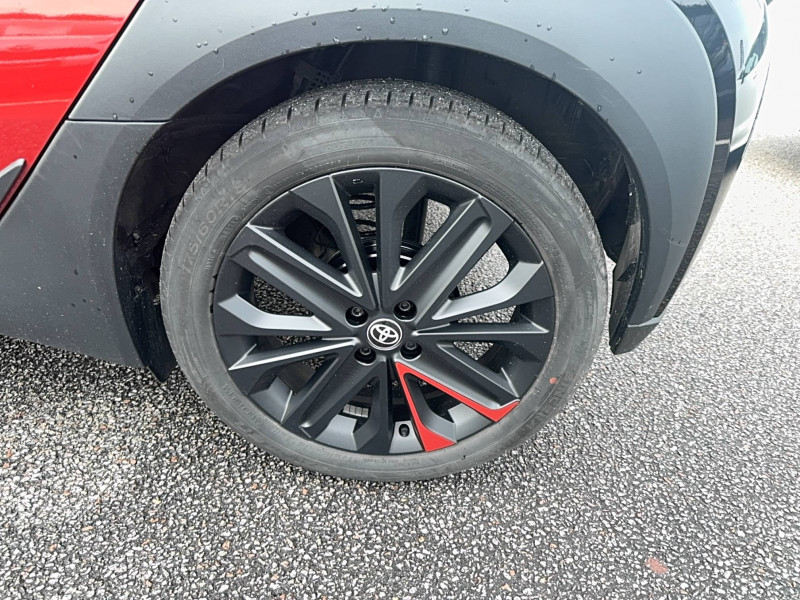 1 Port USB de type C sur console centrale / 1 prise 12V AV sur console centrale / 4 HP / Branche centrale du volant noir laqué / Calandre noir laqué / Capote en toile découvrable electriquement / Carrosserie bi-ton avec toit et piliers peints en noir / Ciel de toit noir / Combiné d'instrumentation avec écran couleur TFT multifonction 4,2" / Compte-tours / Connectivité smartphone Apple CarPlay et Android Auto sans fil / Contour d'aérateurs couleur carrosserie / Contour de console centrale couleur carrosserie / Contour de l'écran tactile noir laqué / Coques de rétroviseurs noires / Eclairage de coffre / Entourage d'antibrouillards noir laqué / Fermeture centralisée avec commande à distance / Indicateur de perte de pression des pneus / Insert de pare-chocs AR couleur carrosserie / Inserts sur contours et bas de caisse AV/AR (selon couleur carrosserie) : Noir laqué / Jantes en alliage 18" noir mat avec, selon couleur carrosserie, inserts Rouge Piment / Kit anti-crevaison / Kit de sécurité / Levier de vitesse en cuir avec surpiqûres couleur carrosserie / Ornements latéraux noirs (partie supérieure du bas de caisse) / Passages de roues et bas de caisse latéraux noirs / Poignées de portes extérieurs couleur carroserie / Porte-gobelets (2) / Projecteurs AV et clignotants halogènes / Rétroviseurs extérieurs électriques, dégivrants et rabattables manuellement / Sellerie tissu avec contour d'assise et de dossier couleur carrosserie / Services connectés standards MyToyota (inclus 10 ans) / Système d'appel d'urgence automatique "E-Call" / Système de contrôle de stabilité (VSC) + Système de contrôle de motricité (TRC) / Système de freinage antiblocage ABS / Système multimédia Toyota Touch 3 avec écran couleur tactile 9" haute définition, Bluetooth, USB, Radio FM et DAB (digitale), Système de connectivité smartphone Apple CarPlay et Android Auto (sans fil) / Tapis de sol AV/AR / Toyota Safety Sense Système de sécurité précollision avec détection des véhicules, piétons et cyclistes, actif également dans les intersections. Alerte de franchissement de ligne avec aide au maintien dans la file, assistant de trajectoire et détecteur de fatigue, Lecture des panneaux de signalisation avec limiteur de vitesse, Gestion automatique des feux de route, Régulateur de vitesse adaptatif intelligent / Volant cuir avec commandes au volant