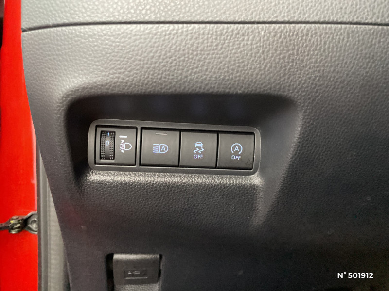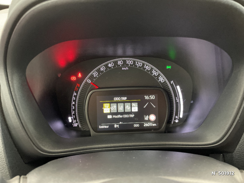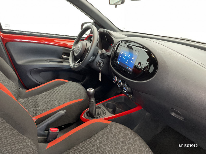 Jantes en alliage 17" noir usiné avec centre de roue avec logo Toyota noir / Insert de pare-chocs AR couleur carrosserie / Kit de sécurité / Levier de vitesse en cuir avec surpiqûres couleur carrosserie / Ornements latéraux noirs (partie supérieure du bas de caisse) / Passages de roues et bas de caisse latéraux noirs / Poignées de portes extérieurs couleur carroserie / Pommeau de levier de vitesse avec contour chromé / Porte-gobelets (2) / Projecteurs AV et clignotants halogènes / Rétroviseurs extérieurs électriques, dégivrants et rabattables manuellement / Sellerie tissu avec contour d'assise et de dossier couleur carrosserie / Services connectés standards MyToyota (inclus 10 ans) / Système d'appel d'urgence automatique "E-Call" / Branche centrale du volant noir laqué / Calandre noir laqué / Carrosserie bi-ton avec toit et piliers peints en noir / Système de contrôle de stabilité (VSC) + Système de contrôle de motricité (TRC) / Système de freinage antiblocage ABS / Système multimédia Toyota Touch 3 avec écran couleur tactile 9" haute définition, Bluetooth, USB, Radio FM et DAB (digitale), Système de connectivité smartphone Apple CarPlay et Android Auto (sans fil) / Système multimédia Toyota Touch 3 avec écran couleur tactile 9", radio digitale (DAB) et système de téléphonie Bluetooth / Tapis de sol AV/AR / Toyota Safety Sense Système de sécurité précollision avec détection des véhicules, des piétons et des cyclistes, actif également dans les intersections, Alerte de franchissement de ligne avec aide au maintien dans la voie et assistant de trajectoire, Régulateur de vitesse adaptatif intelligent, Lecture des panneaux de signalisation, Gestion automatique des feux de route / Toyota Safety Sense Système de sécurité précollision avec détection des véhicules, piétons et cyclistes, actif également dans les intersections. Alerte de franchissement de ligne avec aide au maintien dans la file, assistant de trajectoire et détecteur de fatigue, Lecture des panneaux de signalisation avec limiteur de vitesse, Gestion automatique des feux de route, Régulateur de vitesse adaptatif intelligent / Volant cuir avec commandes au volant / 1 Port USB de type C sur console centrale / 1 prise 12V AV sur console centrale / 4 HP / Ciel de toit noir / Combiné d'instrumentation avec écran couleur TFT multifonction 4,2" / Compte-tours / Connectivité smartphone Apple CarPlay et Android Auto sans fil / Contour d'aérateurs couleur carrosserie / Contour de console centrale couleur carrosserie / Contour de l'écran tactile noir laqué / Coques de rétroviseurs noires / Eclairage de coffre / Fermeture centralisée avec commande à distance / Indicateur de perte de pression des pneus / Kit anti-crevaison