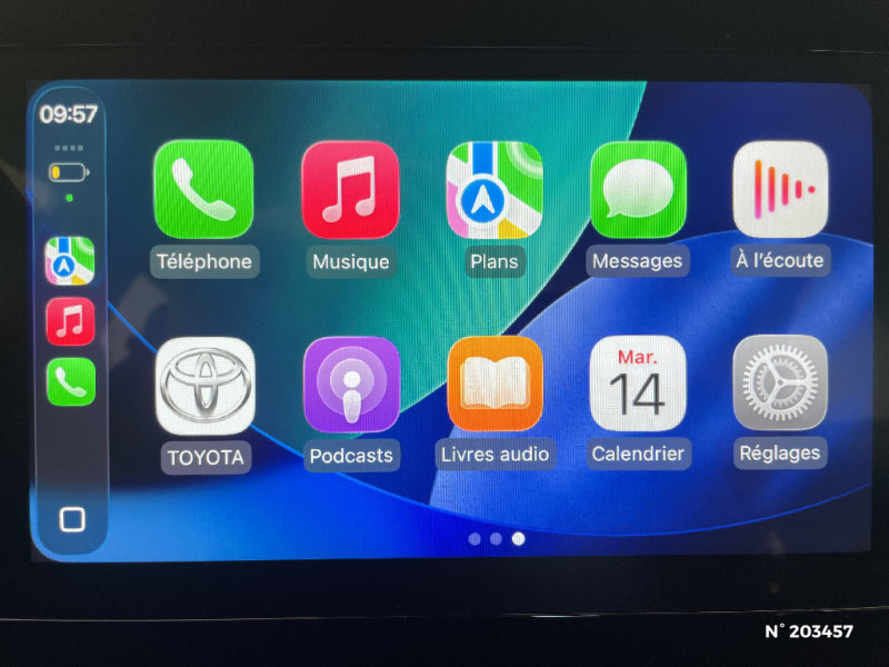 Connectivité smartphone Apple CarPlay et Android Auto sans fil / Coques de rétroviseurs noires / Eclairage de coffre / Fermeture centralisée avec commande à distance / Indicateur de perte de pression des pneus / Jantes en acier 17" avec enjoliveurs et centre de roue avec logo Toyota / Kit anti-crevaison / Kit de sécurité / Levier de vitesse en cuir avec surpiqûres / Passages de roues et bas de caisse latéraux noirs / Poignées de portes extérieurs couleur carroserie / Pommeau de levier de vitesse avec contour chromé / Porte-gobelets (2) / Projecteurs AV et clignotants halogènes / Rétroviseurs extérieurs électriques, dégivrants et rabattables manuellement / Services connectés standards MyToyota (inclus 10 ans) / Système d'appel d'urgence automatique "E-Call" / Système de contrôle de stabilité (VSC) + Système de contrôle de motricité (TRC) / Système de freinage antiblocage ABS / Système multimédia Toyota Touch 3 avec écran couleur tactile 9" haute définition, Bluetooth, USB, Radio FM et DAB (digitale), Système de connectivité smartphone Apple CarPlay et Android Auto (sans fil) / Système multimédia Toyota Touch 3 avec écran couleur tactile 9", radio digitale (DAB) et système de téléphonie Bluetooth / Tapis de sol AV/AR / Toyota Safety Sense Système de sécurité précollision avec détection des véhicules, des piétons et des cyclistes, actif également dans les intersections, Alerte de franchissement de ligne avec aide au maintien dans la voie et assistant de trajectoire, Régulateur de vitesse adaptatif intelligent, Lecture des panneaux de signalisation, Gestion automatique des feux de route / Toyota Safety Sense Système de sécurité précollision avec détection des véhicules, piétons et cyclistes, actif également dans les intersections. Alerte de franchissement de ligne avec aide au maintien dans la file, assistant de trajectoire et détecteur de fatigue, Lecture des panneaux de signalisation avec limiteur de vitesse, Gestion automatique des feux de route, Régulateur de vitesse adaptatif intelligent / Volant cuir avec commandes au volant / 1 Port USB de type C sur console centrale / 1 prise 12V AV sur console centrale / 4 HP / Branche centrale du volant noir laqué / Ciel de toit gris clair / Combiné d'instrumentation avec écran couleur TFT multifonction 4,2" / Compte-tours