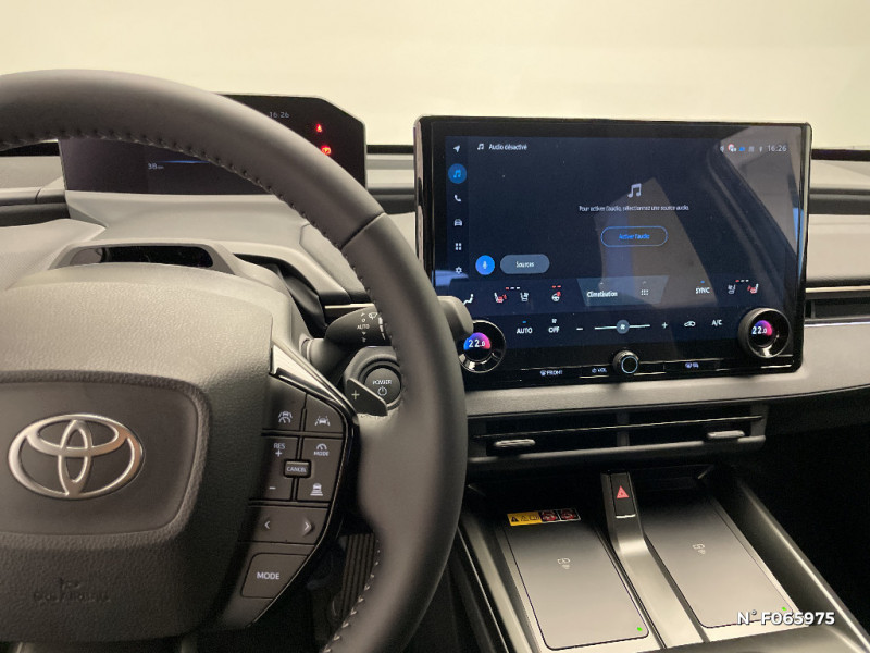 Système Multimédia Smart Connect Plus de 14" / Système multimédia Toyota Smart Connect Plus - Ecran 14" - Connectivité Bluetooth, USB, radio FM et DAB (digitale) - Système de connectivité smartphone sans fil Apple CarPlay et Android Auto - Services intelligents dont navigation connectée avec infotrafic en temps réel, mises à jour cartographiques, assistant vocal "Hey Toyota" et recherche de bornes de recharge et de points d'intérêt (inclus 4 ans) / Tableau de bord au design épuré / Tapis de sol / Signature lumineuse avec bandeau LED / Système audio JBL Premium avec 9HP / Système d'alarme avec fonction double verrouillage / Système de préconditionnement de la batterie / Système de préconditionnement de la batterie / Système de sécurité précollision (PCS) / Système de stationnement semi-autonome (Toyota Teammate Advanced Park) / Système d'ouverture/fermeture et démarrage sans clé "Smart Entry & Start" / Aide active au changement de voie liée à l'activation des feux clignotants (LCA) / Antenne de toit type requin / Assistant visuel de conduite (DMC) / Avertisseur d'angles morts (BSM) / Avertisseur de circulation AV et freinage d'urgence (FCTA) / Becquet AR aérodynamique / Boîte de vitesse avec fonction continu / Buses de lave-glace dégivrantes / Câble de recharge Mode 3 (Type 2) - Borne de recharge (32 A) - 7,5 m / Carrosserie monoton / Chargeur embarqué 22 kW / Chauffage radiant AV / Clé digitale / Coffre à ouverture et fermeture électriques / Combiné d'instrumentation 7'' / Console centrale plus pratique / Toyota Safety Sense 3 - Alerte de franchissement de ligne (LTA) - Assistant visuel de conduite (DMC) - Lecture des panneaux de signalisation avec limiteur de vitesse (RSA) - Régulateur de vitesse adaptatif intelligent avec détection de fortes courbes et allant jusqu'à l'arrêt (ACC) - Système de feux de route adaptatif (AHS) - Système de sécurité précollision (PCS) / Volant chauffant / 4 prises USB Type-C (2 à l'AV et 2 à l'AR) / Système de contrôle de trajectoire (VSC) / Système de feux de route adaptatifs (AHS) / Contrôle de traction (TCS) / Double chargeur à induction / Eclairage d'accueil / Eclairage d'ambiance intérieur personnalisable et interactif (64 couleurs) / Essuie-glace AV à détecteur de pluie / Feux AV, AR, clignotants et antibrouillard à LED / Lecture des panneaux de signalisation avec limiteur de vitesse (RSA) / Palettes au volant avec 4 niveaux de régénération / Aide à la sortie sécurisée (SEA) / Pare-brise AV dégrivant / Passage de roues noir laqué / Planificateur d'itinéraire électrique intégré au système de navigation / Poignées de portes extérieures couleur carroserie / Pompe à chaleur / Programme "Toyota Experience" / Purificateur d'air Nanoe / Radars de stationnement AV/AR anticollision (ICS) / Rails de toit longitudinaux / Rétroviseur intérieur intelligent / Rétroviseurs extérieurs à mémoire et inclinables en marche AR / Sellerie Premium / Seuils de portes en aluminium / Siège conducteur à réglage lombaire électrique / Siège conducteur avec mémoire / Siège passager à réglages électriques 8 positions