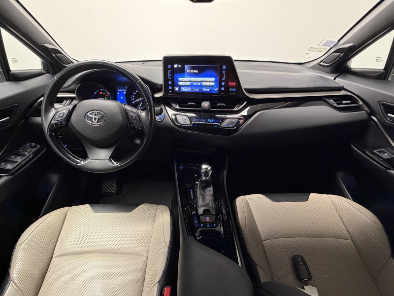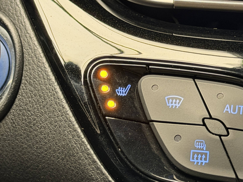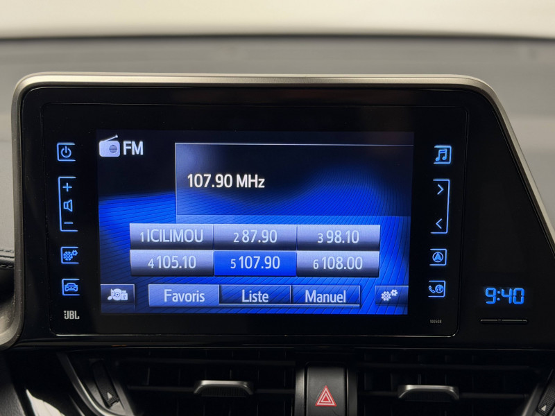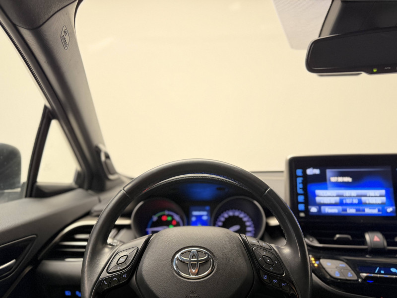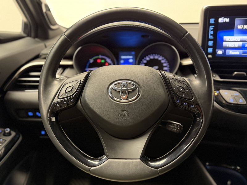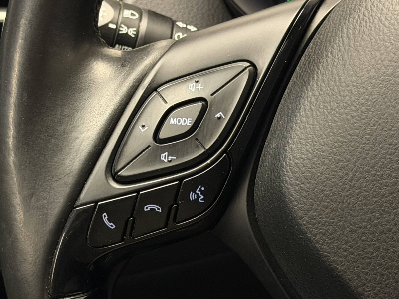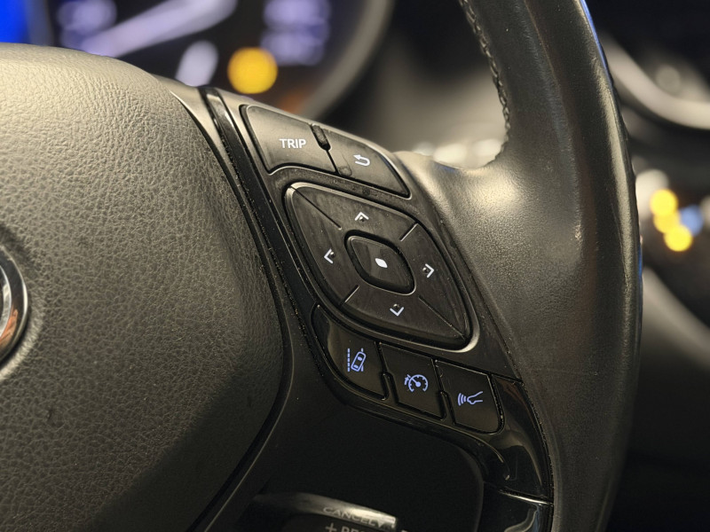 6 HP / 7 Airbags (frontaux et latéraux pour conducteur et passager AV, rideaux AV et AR et protège-genoux conducteur) / Antenne de toit type requin / Avertisseur d'angles morts (BSM) / Avertisseur de circulation AR (RCTA) / Console centrale noir laqué / Contre-portes avec inserts noirs laqués / Déconnection de l'airbag passager / Follow me home (feux AV à extinction différée) / Illumination des contre-portes / Indicateur de perte de pression des pneus / Jantes alliage 18" Distinctive / Kit de réparation anti-crevaison / Lignes de vitres chromées / Montant central (pilier B) noir laqué / Ordinateur de bord avec écran TFT couleur 4.2" multifonctions / Ornements intérieurs chocolat / Poches aumonières au dos des sièges AV / Prises auxiliaire et USB / Purificateur d'air ionique Nanoe / Réglages manuels du siège conducteur / Rétroviseur intérieur anti-éblouissement / Rétroviseurs extérieurs rabattables automatiquement avec projection au sol du logo Toyota C-HR / Sellerie mi-cuir chocolat et noir / Sièges AV type sport avec maintiens latéraux / Support lombaire du siège conducteur (électrique) / Système d'aide au stationnement intelligent IPA / Système de téléphone Bluetooth / Système d'ouverture/fermeture sans clé "Smart Entry" (conducteur, passager et coffre) / Système multimédia Toyota Touch 2 (Système audio avec radio) / Systèmes de contrôle de stabilité (VSC), de motricité (TRC) et direction assistée (EPS) / Systèmes de freinage antiblocage (ABS) et d'amplification de freinage d'urgence (BA) / Toyota Safety Sense Système de sécurité précollision avec détection des piétons, Alerte de franchissement de ligne et détecteur de fatigue, gestion automatique des feux de route, lecture des panneaux de signalisation, régulateur de vitesse adaptatif. / Toyota Touch & Go Plus 2 : système de navigation à écran tactile avec info trafic et cartographie européenne, reconnaissance vocale et vue 3D