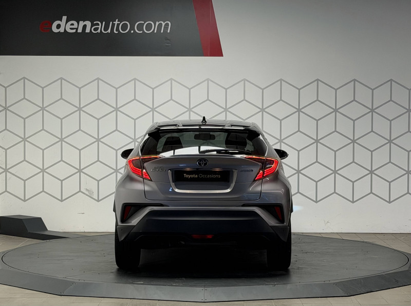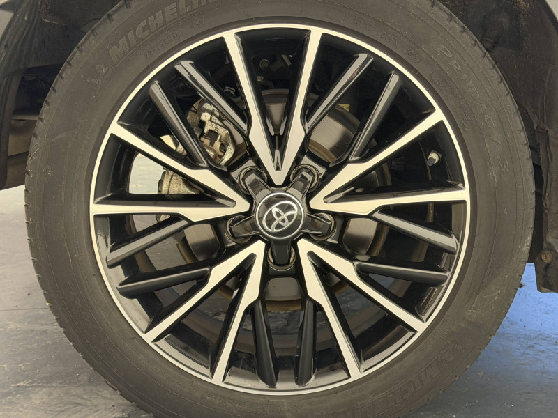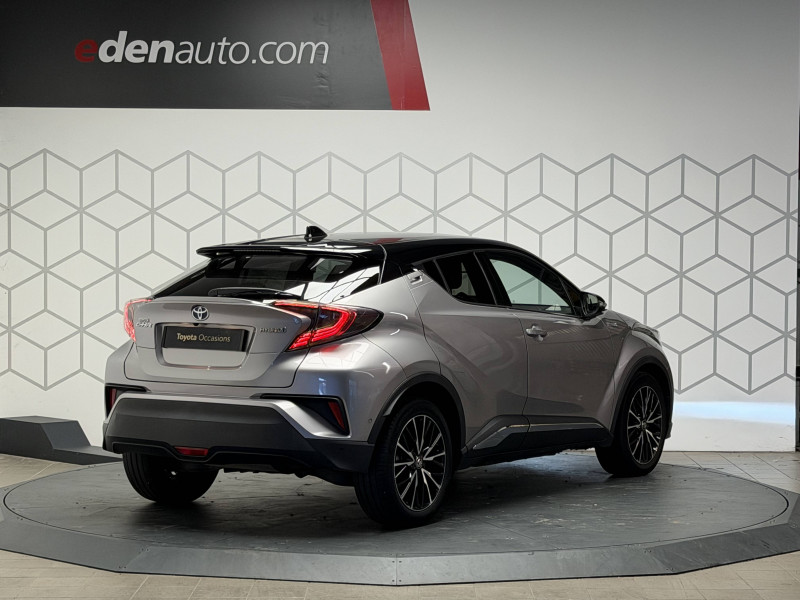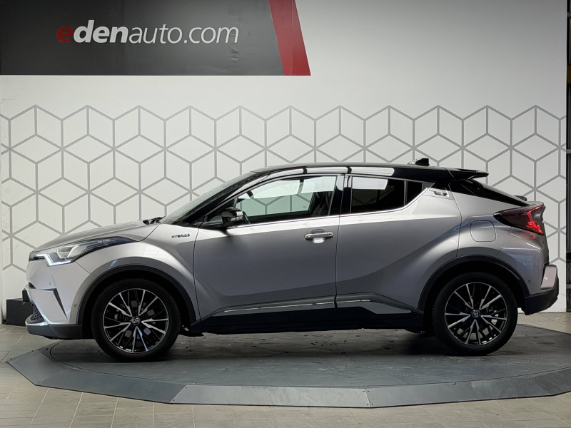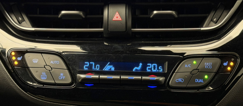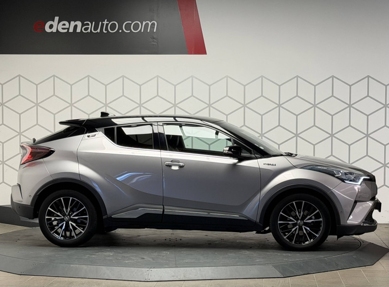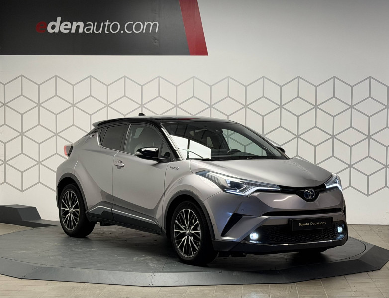 6 HP / 7 Airbags (frontaux et latéraux pour conducteur et passager AV, rideaux AV et AR et protège-genoux conducteur) / Antenne de toit type requin / Avertisseur d'angles morts (BSM) / Avertisseur de circulation AR (RCTA) / Console centrale noir laqué / Contre-portes avec inserts noirs laqués / Déconnection de l'airbag passager / Follow me home (feux AV à extinction différée) / Illumination des contre-portes / Indicateur de perte de pression des pneus / Jantes alliage 18" Distinctive / Kit de réparation anti-crevaison / Lignes de vitres chromées / Montant central (pilier B) noir laqué / Ordinateur de bord avec écran TFT couleur 4.2" multifonctions / Ornements intérieurs chocolat / Poches aumonières au dos des sièges AV / Prises auxiliaire et USB / Purificateur d'air ionique Nanoe / Réglages manuels du siège conducteur / Rétroviseur intérieur anti-éblouissement / Rétroviseurs extérieurs rabattables automatiquement avec projection au sol du logo Toyota C-HR / Sellerie mi-cuir chocolat et noir / Sièges AV type sport avec maintiens latéraux / Support lombaire du siège conducteur (électrique) / Système d'aide au stationnement intelligent IPA / Système de téléphone Bluetooth / Système d'ouverture/fermeture sans clé "Smart Entry" (conducteur, passager et coffre) / Système multimédia Toyota Touch 2 (Système audio avec radio) / Systèmes de contrôle de stabilité (VSC), de motricité (TRC) et direction assistée (EPS) / Systèmes de freinage antiblocage (ABS) et d'amplification de freinage d'urgence (BA) / Toyota Safety Sense Système de sécurité précollision avec détection des piétons, Alerte de franchissement de ligne et détecteur de fatigue, gestion automatique des feux de route, lecture des panneaux de signalisation, régulateur de vitesse adaptatif. / Toyota Touch & Go Plus 2 : système de navigation à écran tactile avec info trafic et cartographie européenne, reconnaissance vocale et vue 3D
