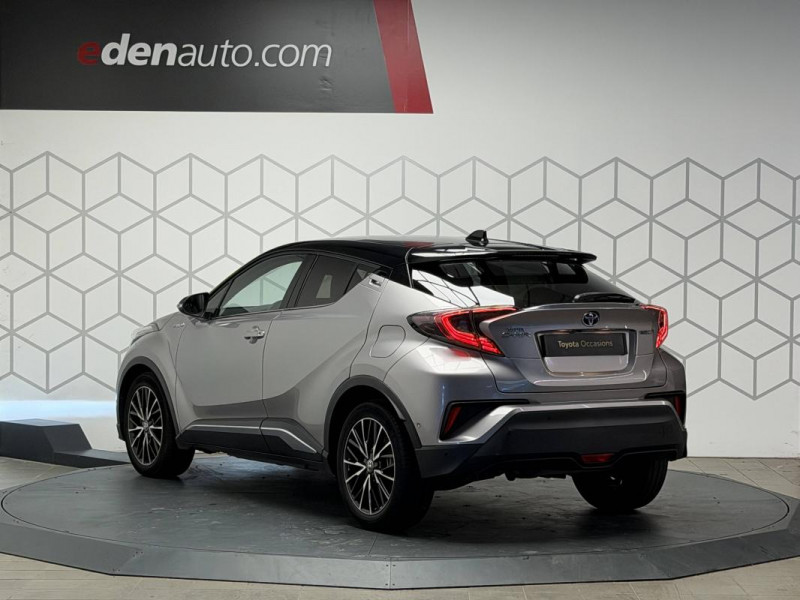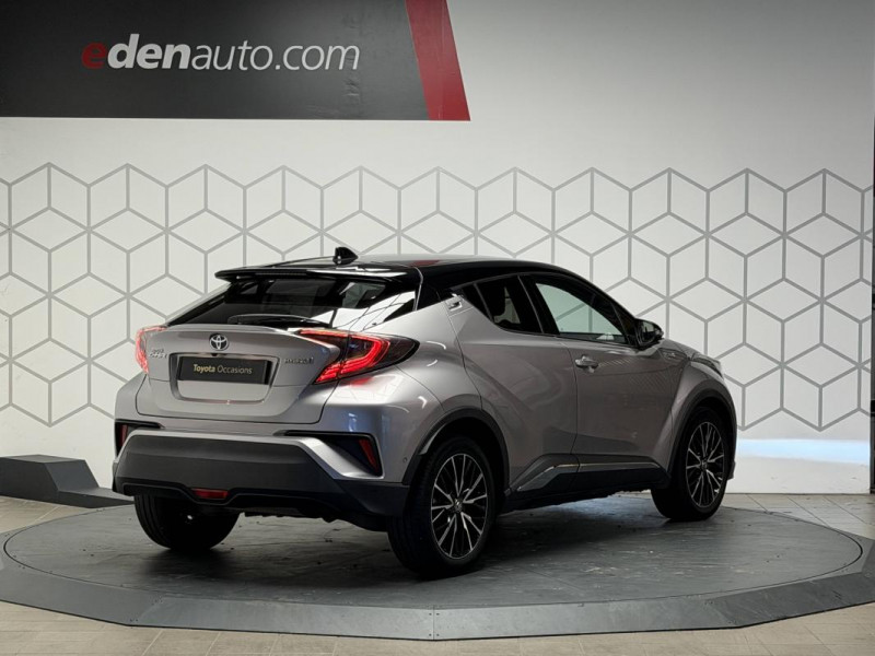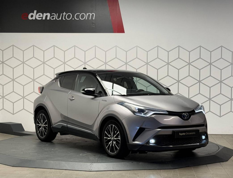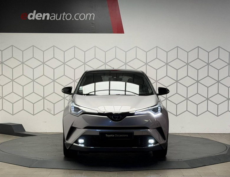6 HP / rideaux AV et AR et protège-genoux conducteur) / Antenne de toit type requin / Avertisseur d'angles morts (BSM) / Avertisseur de circulation AR (RCTA) / Console centrale noir laqué / Contre-portes avec inserts noirs laqués / Déconnection de l'airbag passager / Follow me home (feux AV à extinction différée) / Illumination des contre-portes / Indicateur de perte de pression des pneus / Kit de réparation anti-crevaison / Lignes de vitres chromées / Montant central (pilier B) noir laqué / Ordinateur de bord avec écran TFT couleur 4.2 multifonctions / Ornements intérieurs chocolat / Poches aumonières au dos des sièges AV / Prises auxiliaire et USB / Purificateur d'air ionique Nanoe / Réglages manuels du siège conducteur / Rétroviseur intérieur anti-éblouissement / Rétroviseurs extérieurs chauffants / Rétroviseurs extérieurs rabattables automatiquement avec projection au sol du logo Toyota C-HR / Sellerie mi-cuir chocolat et noir / Sièges AV type sport avec maintiens latéraux / Support lombaire du siège conducteur (électrique) / Système d'aide au stationnement intelligent IPA / Système de démarrage sans clé Smart Start / Système de téléphone Bluetooth / Système d'ouverture/fermeture sans clé Smart Entry (conducteur / passager et coffre) / Système multimédia Toyota Touch 2 (Système audio avec radio) / Systèmes de contrôle de stabilité (VSC) / de motricité (TRC) et direction assistée (EPS) / Systèmes de freinage antiblocage (ABS) et d'amplification de freinage d'urgence (BA) / Toyota Safety Sense Système de sécurité précollision avec détection des piétons / gestion automatique des feux de route / Toyota Touch & Go Plus 2 : système de navigation à écran tactile avec info trafic et cartographie européenne / reconnaissance vocale et vue 3D /