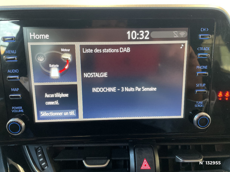 Fermeture centralisée avec commande à distance / Filet coffre / Follow me home (feux AV à extinction différée) / Frein de stationnement électrique / Indicateur de sous-gonflage des pneus / Lignes de vitres chromées / Montant central (pilier B) noir laqué / Optiques AV et AR à LED / Ornements de console centrale et de portières Gris Célestine / Poches aumonières au dos des sièges AV / Poignées de portes couleur carrosserie / Poignées de portes et pare-chocs AV couleur carrosserie / Projecteurs AV et clignotants et feux halogènes / Rétroviseur intérieur anti-éblouissement / Rétroviseur intérieur électrochromatique / Rétroviseurs extérieurs électriques et dégivrants avec rappels de clignotants / Sellerie en tissu gris sombre avec surpiqûres bleues et embossage faà§on diamant / Sellerie en tissu sport noir et bleu avec embossage faà§on diamant / Sellerie mi-cuir chocolat et noir avec surpiqûres faà§on diamant / Seuils de portes en aluminium / Siège passager AV ajustable manuellement en hauteur / Sièges AV type sport avec maintiens latéraux / Système AVAS (Acoustic Vehicle Alerting System) / Système d'accès (conducteur, passager et coffre) et de démarrage sans clé "Smart Entry & Start" / Système d'appel d'urgence automatique "E-Call" / Système de connectivité smartphone Apple CarPlay / Android Auto / Système de contrôle de motricité (TRC) / Système de contrôle de trajectoire (VSC) / Système de freinage antiblocage (ABS), BA et EBD / Système multimédia Toyota Touch avec radio DAB, écran couleur tactile 8'', bluetooth, USB / Tapis de sol en velours AV/AR / Toyota Safety Sense Système de sécurité précollision avec détection des piétons, Alerte de franchissement de ligne et détecteur de fatigue, gestion automatique des feux de route, lecture des panneaux de signalisation, régulateur de vitesse adaptatif. / Toyota Touch (système audio, écran tactile, Bluetooth et caméra de recul) / 6 HP / 7 Airbags (frontaux, lateraux, rideaux et un protège-genoux conducteur) / Kit de réparation anti-crevaison / Kit de sécurité / Accoudoir central avec compartiment de rangement / Ajustement manuel de la hauteur des phares / Alarme avec fonction antidémarrage / Antenne de toit type requin / "ATTENTION" - Equipements non communiqués / Becquet AV couleur carrosserie / Calculateur de temps de conduite en électrique / Ciel de pavillon noir / Combiné d'instrumentation avec écran couleur TFT multifonction 4" / Coques de rétroviseur couleur carrosserie / Eclairage d'accueil / Ecrous antivol