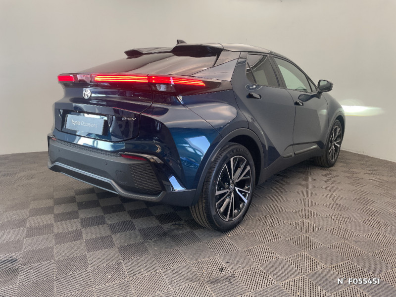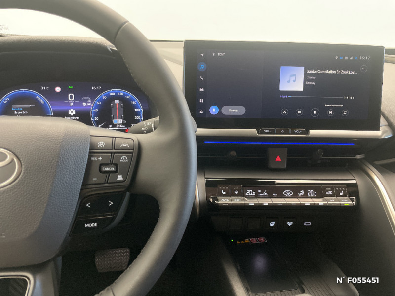 Radars de stationnement AV et AR (PKSB) Lorsque vous roulez à basse vitesse ou en marche AR, les radars permettent de détecter des objets statiques (obstacles, murs...) ou en mouvement (véhicules traversant à l'AR), le système de freinage de l'aide au stationnement fournit alors une assistance pour réduire l'impact. / Contrôle de traction (TCS) / Rétroviseurs extérieurs avec éclairage au sol / Sellerie Premium suédine et tissu avec surpiqûres bleues et blanches / Services connectés de contrôle à distance MyToyota (inclus 4 ans) / Services connectés standards MyToyota (inclus 10 ans) / Seuils de portes en aluminium / Siège conducteur à réglages électriques avec mémorisation / Siège conducteur avec support lombaire électrique / Siège passager réglable manuellement en hauteur / Sièges AV contours enveloppants / Système audio premium JBL 9 HP / Système d'appel d'urgence automatique "E-Call" / Système de rappel pour les sièges AR (RSRS) / Système d'ouverture/fermeture et démarrage sans clé "Smart Entry & Start" / Système multimédia Toyota Smart Connect Plus : Ecran couleur tactile 12,3" haute définition, Connectivité Bluetooth, USB et radio FM et DAB (digitale) , Système de connectivité smartphone Apple CarPlay et Android Auto (sans fil), Navigation satellitaire embarquée, Services intelligents dont navigation connectée avec infotrafic en temps réel, mises à jour cartographiques, Assistant vocal "Hey Toyota", recherche de points d'intérêts, zones de danger (fixes) / Toyota Safety Sense : Système de sécurité précollision avec détection des véhicules, piétons (jour/nuit) et cyclistes, actif également dans les intersections (PCS), Alerte de franchissement de ligne avec aide au maintien dans la file, assistant de trajectoire et détecteur de fatigue (LTA), Régulateur de vitesse adaptatif intelligent allant jusqu'à l'arrêt (ACC), Lecture des panneaux de signalisation avec limiteur de vitesse (RSA) et Gestion automatique des feux de route (AHB), Système d'arrêt d'urgence autonome (EDSS) / Vitrage feuilleté insonorisé / Volant chauffant / Volant gainé de matière synthétique / Activation automatique des feux de détresse AR (FHL) / Eclairage d'ambiance intérieur personnalisable et interactif 64 couleurs sous l'écran et panneaux de porte) / Ecrous antivol / Electrostabilisateur programmé (ESP) / Essuie-glaces AV avec détecteur de pluie / Filet coffre / Jantes en alliage 19" bi-ton noir et aluminium / Kit de réparation anti-crevaison / Kit de sécurité / Montants B de portes noir laqué / Optiques AV LED avec signature lumineuse Premium / Ornements latéraux noirs laqués / Pare-brise chauffant (sous les essuie-glaces uniquement) / Poches aumonières au dos du siège passager AV / Poignées de portes affleurantes / Purificateur d'air ionique Nanoe / Aide à la sortie sécurisée (SEA) Le système vous aide à prévenir les accidents en surveillant les autres usagers de la route qui s'approchent par l'arrière. Lorsqu'il détecte la présence d'un cycliste ou d'un véhicule, un indicateur lumineux s'affiche dans les rétroviseurs extérieurs et sur l'écran multi-informations et une alarme sonore alerte les occupants. / Alarme avec fonction antidémarrage / Assistant visuel de conduite (DMC) Ce système utilise une caméra située audessus du volant pour surveiller le niveau d'alerte et l'état du conducteur. Le système envoie un avertissement s'il détecte un état anormal, comme de la fatigue. Ces activités sont utilisées pour améliorer la performance du système d'arrêt d'urgence autonome (EDSS) à travers la détection précoce de la distraction. / "ATTENTION" - Equipements en cours de saisie / Avertisseur d'angles morts (BSM) Lorsque les capteurs détectent un véhicule dans votre angle mort latéral, un indicateur lumineux s'éclaire sur le rétroviseur extérieur correspondant. Si vous mettez votre clignotant afin d'indiquer un changement de voie alors qu'un véhicule est dans votre angle mort, un indicateur lumineux apparaît dans le rétroviseur correspondant pour vous avertir du danger. / Avertisseur de circulation AR (RCTA) Cet avertisseur vous permet grâce aux capteurs d'angles morts de repérer un véhicule arrivant de côté quand vous sortez en marche AR d'une place de parking. S'il détecte un risque de collision, le système freine automatiquement et stoppe le véhicule. / Boîte automatique à variation continue / Carrosserie bi-ton / Clé digitale / Compteur numérique personnalisable 12,3" / Rétroviseur intérieur électrochromatique