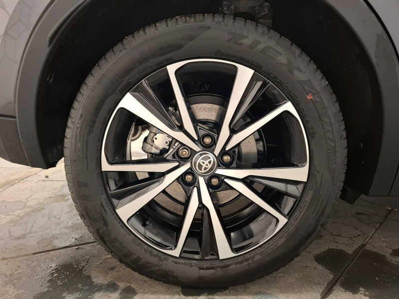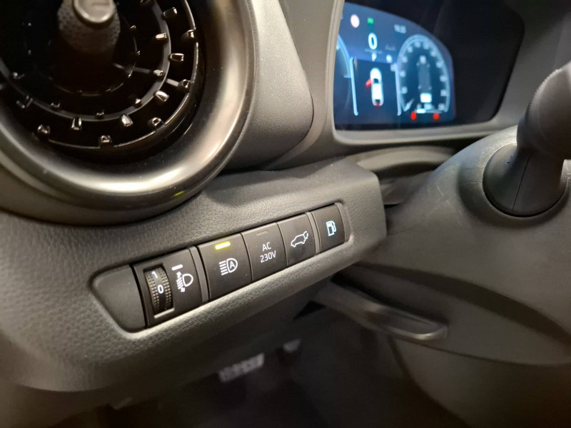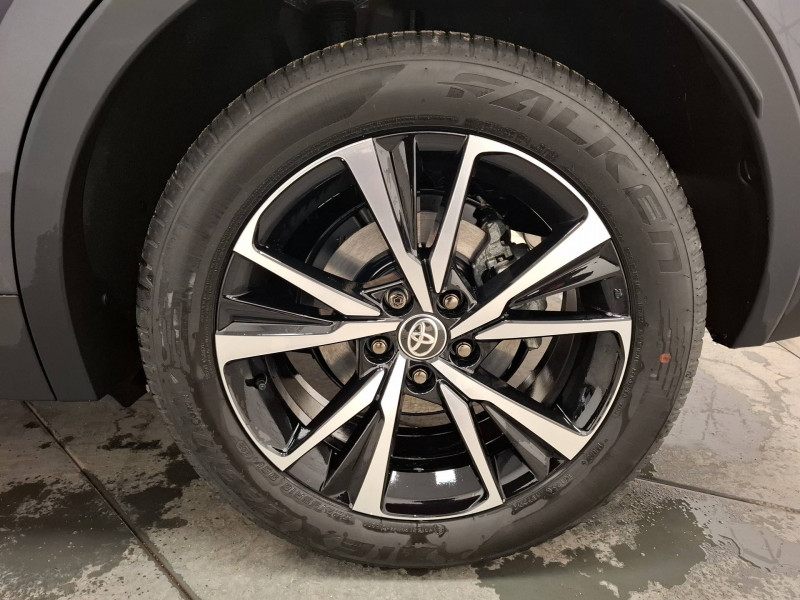 6 HP / Activation automatique des feux de détresse AR (FHL) / Aide à la sortie sécurisée (SEA) Le système vous aide à prévenir les accidents en surveillant les autres usagers de la route qui s'approchent par l'arrière. Lorsqu'il détecte la présence d'un cycliste ou d'un véhicule, un indicateur lumineux s'affiche dans les rétroviseurs extérieurs et sur l'écran multi-informations et une alarme sonore alerte les occupants. / Alarme avec fonction antidémarrage / Assistant visuel de conduite (DMC) Ce système utilise une caméra située audessus du volant pour surveiller le niveau d'alerte et l'état du conducteur. Le système envoie un avertissement s'il détecte un état anormal, comme de la fatigue. Ces activités sont utilisées pour améliorer la performance du système d'arrêt d'urgence autonome (EDSS) à travers la détection précoce de la distraction. / Avertisseur d'angles morts (BSM) Lorsque les capteurs détectent un véhicule dans votre angle mort latéral, un indicateur lumineux s'éclaire sur le rétroviseur extérieur correspondant. Si vous mettez votre clignotant afin d'indiquer un changement de voie alors qu'un véhicule est dans votre angle mort, un indicateur lumineux apparaît dans le rétroviseur correspondant pour vous avertir du danger. / Avertisseur de circulation AR (RCTA) Cet avertisseur vous permet grâce aux capteurs d'angles morts de repérer un véhicule arrivant de côté quand vous sortez en marche AR d'une place de parking. S'il détecte un risque de collision, le système freine automatiquement et stoppe le véhicule. / Boîte automatique à variation continue / Câble de recharge Mode 2 (Type 2) 1,8 kW / 6 mètres (domestique) / Câble de recharge Mode 3 (Type 2) 22kW / 7,5 mètres (Wallbox) / Carrosserie monoton / Coffre avec plancher surélevé / Compteur numérique personnalisable 12,3" / Contrôle de traction (TCS) / Eclairage d'ambiance intérieur monochrome éclairage non personnalisable et non interactif : cave à pieds / rangement passager / Ecrous antivol / Electrostabilisateur programmé (ESP) / Essuie-glaces AV avec détecteur de pluie / Feux Full LED (AV/AR et antibrouillard) / Filet coffre / Jantes en alliage 18" bi-ton gris anthracite mat et aluminium / Kit de réparation anti-crevaison / Kit de sécurité / Montants B de portes noir laqué / Optiques AV full-LED / Pare-brise chauffant (sous les essuie-glaces uniquement) / Poignées de portes affleurantes / Prise 230 V dans le coffre / Programme "Toyota Experience" / Radars de stationnement AV et AR (PKSB) Lorsque vous roulez à basse vitesse ou en marche AR, les radars permettent de détecter des objets statiques (obstacles, murs...) ou en mouvement (véhicules traversant à l'AR), le système de freinage de l'aide au stationnement fournit alors une assistance pour réduire l'impact. / Rétroviseur intérieur électrochromatique / Rétroviseurs extérieurs avec éclairage au sol / Sacoche de rangement pour le câble de recharge / Sellerie tissu bi-ton gris anthracite avec surpiqûres blanches / Services connectés de contrôle à distance MyToyota (inclus 4 ans) / Services connectés standards MyToyota (inclus 10 ans) / Seuils de portes en aluminium / Siège conducteur avec support lombaire électrique / Siège passager réglable manuellement en hauteur / Système d'appel d'urgence automatique "E-Call" / Système de rappel pour les sièges AR (RSRS) / Système d'ouverture/fermeture et démarrage sans clé "Smart Entry & Start" / Système multimédia Toyota Smart Connect : Écran couleur tactile 8 haute définition, Connectivité Bluetooth, USB et radio, FM et DAB (digitale), Système de connectivité smartphone Apple CarPlay et Android Auto (sans fil), Services intelligents dont navigation connectée avec infotrafic en temps réel, mises à jour cartographiques, assitant vocal Hey Toyota et recherche de points d'intérêts (inclus 4 ans) / Toyota Safety Sense : Système de sécurité précollision avec détection des véhicules, piétons (jour/nuit) et cyclistes, actif également dans les intersections (PCS), Alerte de franchissement de ligne avec aide au maintien dans la file, assistant de trajectoire et détecteur de fatigue (LTA), Régulateur de vitesse adaptatif intelligent allant jusqu'à l'arrêt (ACC), Lecture des panneaux de signalisation avec limiteur de vitesse (RSA) et Gestion automatique des feux de route (AHB), Système d'arrêt d'urgence autonome (EDSS) / Vitrage feuilleté insonorisé / Volant chauffant / Volant gainé de matière synthétique