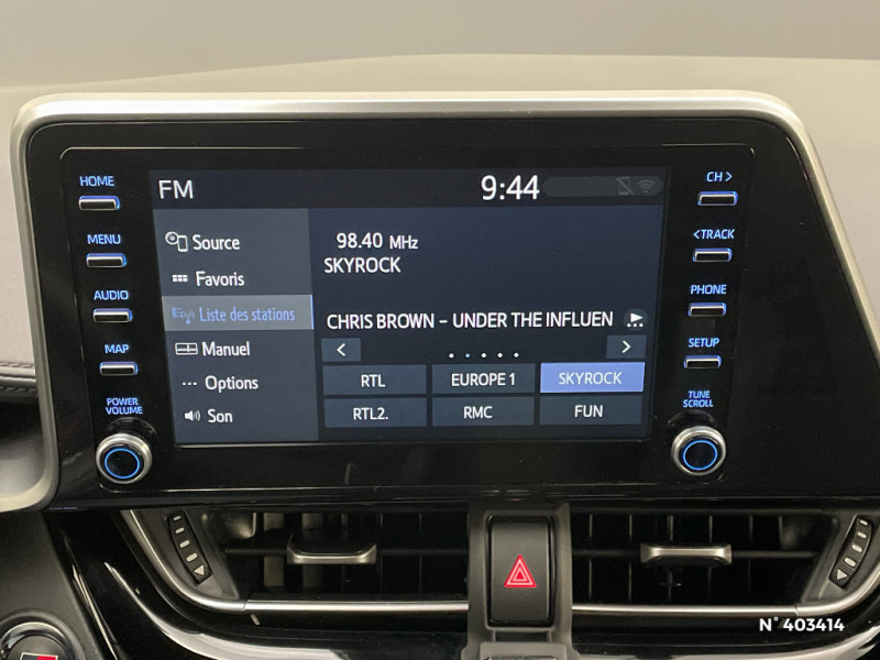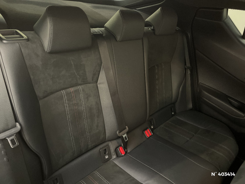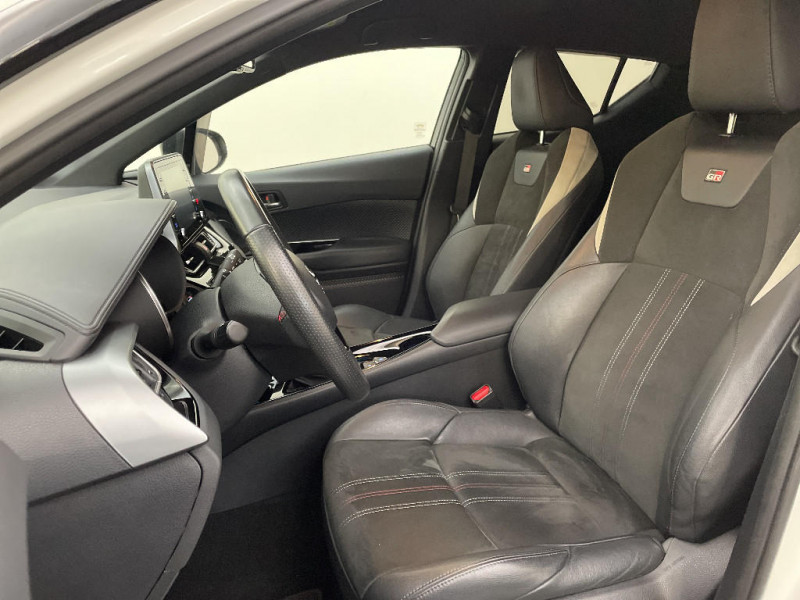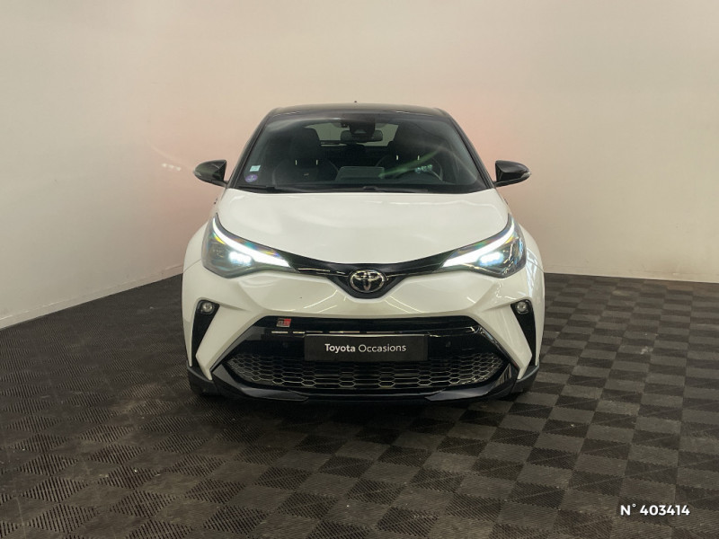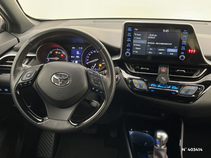 Seuils de portes GR Sport / Siège conducteur à réglage lombaire électrique / Siège passager AV ajustable manuellement en hauteur / Sièges AV type sport avec maintiens latéraux / Système AVAS (Acoustic Vehicle Alerting System) / Antenne de toit type requin / Système d'accès (conducteur, passager et coffre) et de démarrage sans clé "Smart Entry & Start" / Système d'appel d'urgence automatique "E-Call" / Système de connectivité smartphone Apple CarPlay / Android Auto / Système de contrôle de motricité (TRC) / Système de contrôle de trajectoire (VSC) / Système de freinage antiblocage (ABS), BA et EBD / Système multimédia Toyota Touch avec radio DAB, écran couleur tactile 8'', bluetooth, USB / Accoudoir central avec compartiment de rangement / Ajustement manuel de la hauteur des phares / Alarme avec fonction antidémarrage / Avertisseurs d'angles morts et de circulation AR avec freinage d'urgence auto / Tapis de sol en velours AV/AR / Toyota Safety Sense Système de sécurité précollision avec détection des piétons, Alerte de franchissement de ligne et détecteur de fatigue, gestion automatique des feux de route, lecture des panneaux de signalisation, régulateur de vitesse adaptatif. / Traitement spécifique des optiques AV / Volant et pommeau de levier de vitesse gainé cuir avec surpiqûres rouges / 6 HP / 7 Airbags (frontaux, lateraux, rideaux et un protège-genoux conducteur) / Bouton de démarrage spécifique "GR SPORT" / Calculateur de temps de conduite en électrique / Carrosserie bi-ton avec toit noir / Ciel de pavillon noir / Combiné d'instrumentation avec écran couleur TFT multifonction 4" / Coques de rétroviseurs extérieurs noires / Eclairage d'accueil / Ecrous antivol / Fermeture centralisée avec commande à distance / Feu de recul central à LED sur bouclier AR / Feux AR à LED avec clignotants séquentiels / Filet coffre / Frein de stationnement électrique / Indicateur de sous-gonflage des pneus / Kit de réparation anti-crevaison / Kit de sécurité / Lignes de vitres noir laqué / Montant central (pilier B) noir laqué / Optiques AV LED avec signature lumineuse Premium / Ornements latéraux noirs / Poches aumonières au dos des sièges AV / Poignées de portes et pare-chocs AV couleur carrosserie / Purificateur d'air ionique Nanoe / Rétroviseur intérieur électrochromatique / Rétroviseurs extérieurs avec projection au sol du logo Toyota C-HR / Rétroviseurs extérieurs électriques et dégivrants avec rappels de clignotants / Revêtement supérieur de planche de bord et d'accoudoir central noir / Sellerie cuir et Alcantara noir avec surpiqûres grises et rouges et logo GR Sport