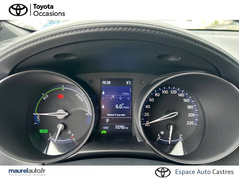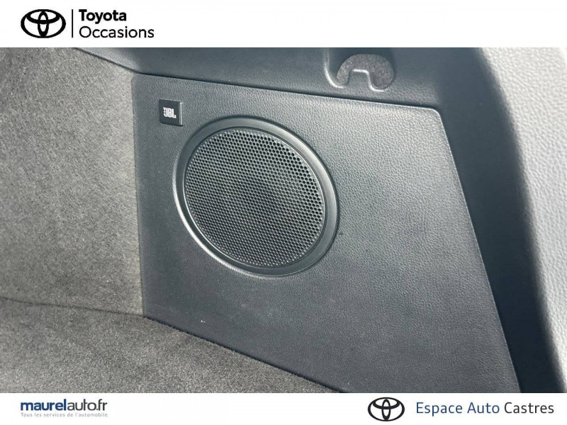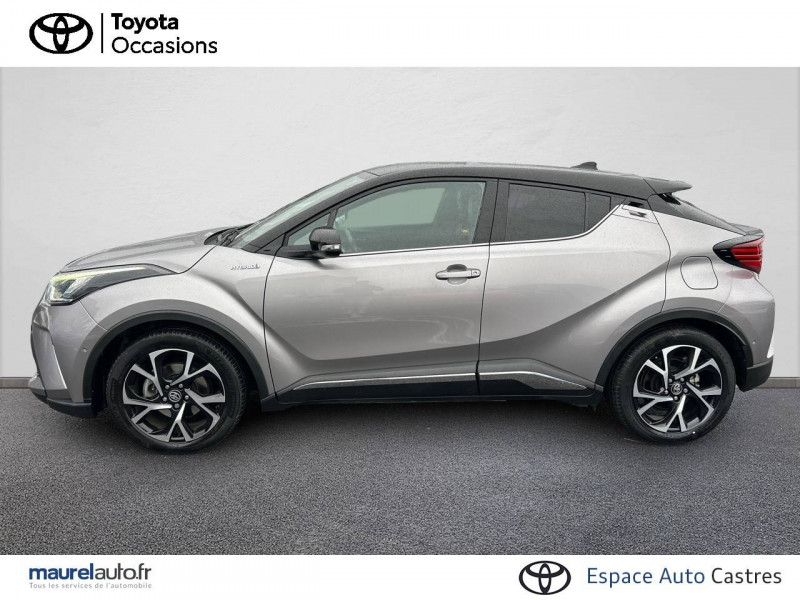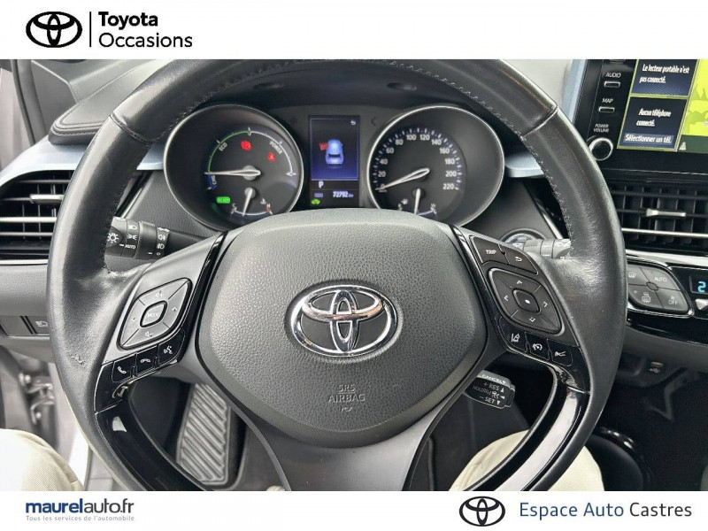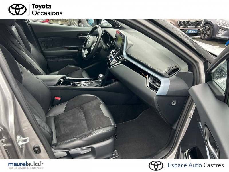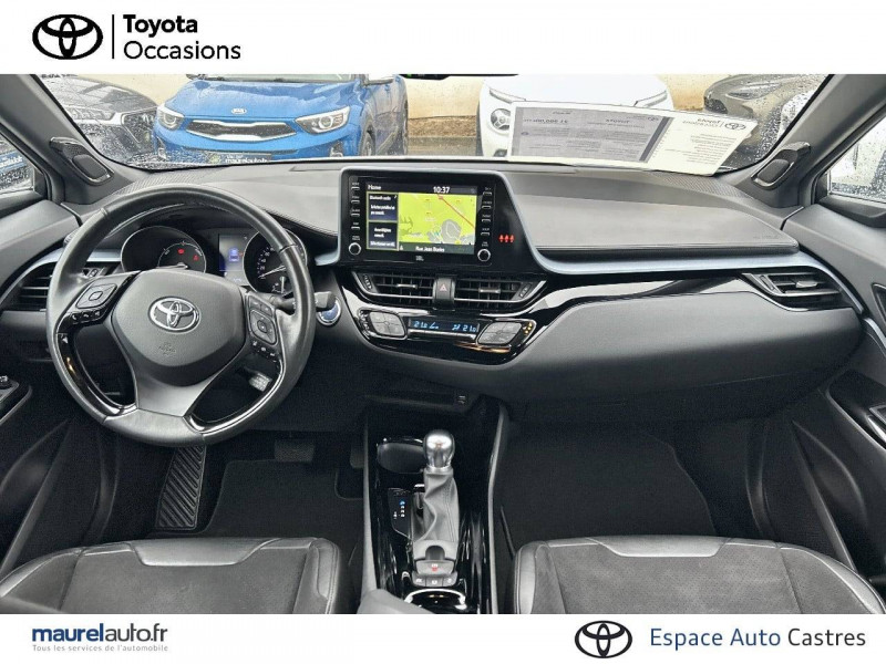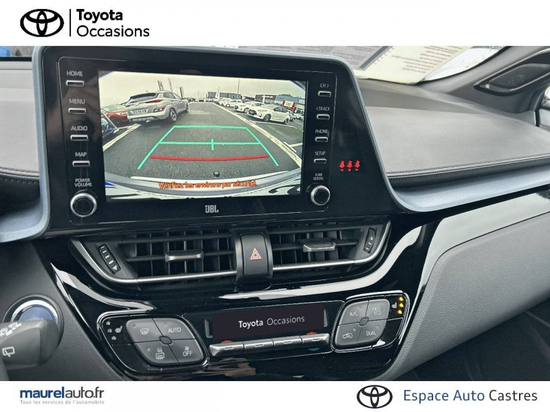 7 Airbags (frontaux et latéraux pour conducteur et passager AV, rideaux AV et AR et protège-genoux conducteur) / 9 HP / Accoudoir central avec compartiment de rangement / Antenne de toit type requin / Avertisseur d'angles morts (BSM) / Avertisseur de circulation AR+freinage / Becquet AV couleur carrosserie / Calculateur de temps de conduite en électrique / Carrosserie bi-ton avec toit noir / Coffre à double fond avec plancher surélevé / Commandes de boîte de vitesses séquentielle / Coques de rétroviseurs extérieurs noires / Déconnection de l'airbag passager / Eclairage d'accueil / Ecran couleur tactile multifonction 8" / Ecrous antivol / Essuie-glaces AV avec détecteur de pluie / Fermeture centralisée avec commande à distance / Feu de recul central à LED sur bouclier AR / Filet coffre / Follow me home (feux AV à extinction différée) / Frein de statlionnement électrique / Immobiliseur avec avertisseur sonore / Indicateur de sous-gonflage des pneus / Kit de réparation anti-crevaison / Kit de sécurité / Lignes de vitres chromées / Montant central (pilier B) noir laqué / Optiques AR LED avec clignotants séquentiels / Optiques AV LED avec signature lumineuse Premium / Ordinateur de bord avec écran TFT couleur 4.2" multifonctions / Ornementation de console centrale et de portières gris célestin / Ornement de pare-chocs AR chromé façon canules / Pare-chocs AV couleur caisse / Peinture bi-ton Blanc Nacré/Toit Noir / Peinture bi-ton Bleu Nebula/Toit Noir / Peinture bi-ton Gris Atlas/Toit Noir / Peinture bi-ton Gris Célestine/Toit Noir / Peinture bi-ton Gris Platinium/Toit Noir / Peinture bi-ton Rouge Intense/Toit Noir / Poches aumonières au dos des sièges AV / Poignées de portes extérieures couleur carroserie / Prises auxiliaire et USB / Projecteurs adaptatifs avec ajustement automatique de la hauteur des phares / Rétroviseur intérieur électrochromatique / Rétroviseurs extérieurs électriques, dégivrants et rabattables électriquement avec rappel de clignotants / Revêtement supérieur de planche de bord et d'accoudoir central noir / Sellerie en cuir Alcantara noir avec embossage Toyota C-HR / Siège conducteur électrique, réglable en hauteur avec réglage lombaire électrique / Siège passager réglable manuellement en hauteur / Sièges AV type sport avec maintiens latéraux / Système audio JBL Premium avec 9HP / Système d'accès (conducteur, passager et coffre) et de démarrage sans clé "Smart Entry & Start" / Système d'aide au stationnement intelligent S-IPA / Système d'appel d'urgence automatique "E-Call" / Système de connectivité smartphone Apple CarPlay / Android Auto / Système de contrôle de stabilité (VSC) + Système de contrôle de motricité (TRC) / Système de freinage antiblocage (ABS), BA et EBD / Système de téléphonie Bluetooth / Tapis de sol en velours AV/AR / Toyota Safety Sense Système de sécurité précollision avec détection des piétons, Alerte de franchissement de ligne et détecteur de fatigue, gestion automatique des feux de route, lecture des panneaux de signalisation, régulateur de vitesse adaptatif. / Toyota Touch & Go Plus 2 : système de navigation à écran tactile avec info trafic et cartographie européenne, reconnaissance vocale et vue 3D / Vitres électriques AV et AR avec descente et remontée à impulsion / Volant chauffant