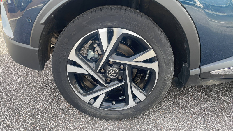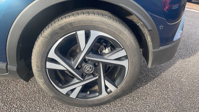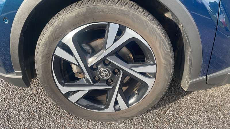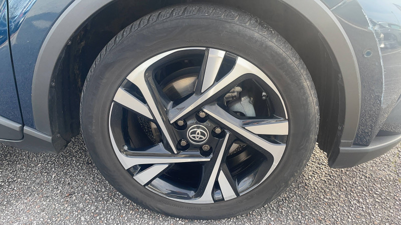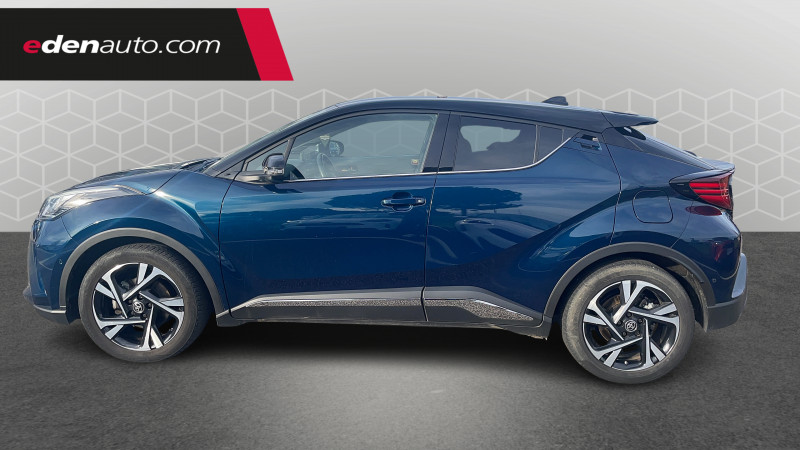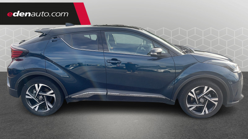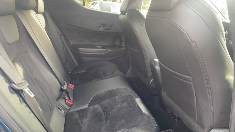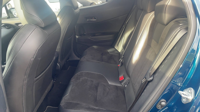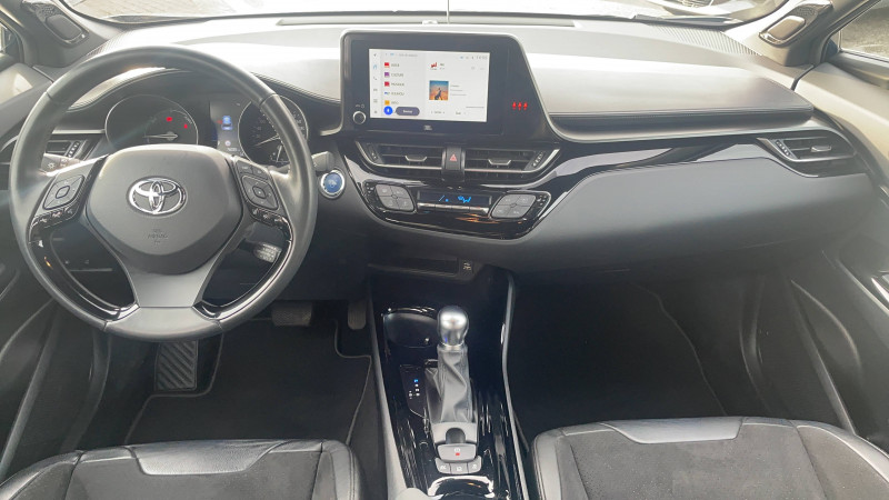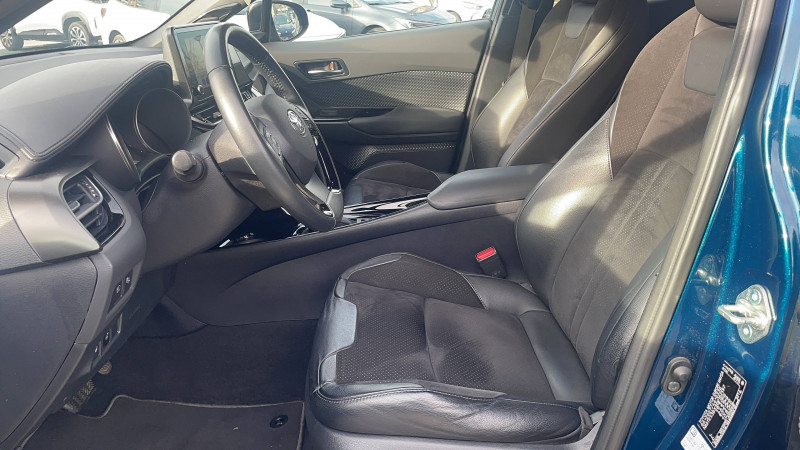 7 Airbags (frontaux, lateraux, rideaux et un protège-genoux conducteur) / 9 HP / Accoudoir central avec compartiment de rangement / Alarme avec fonction antidémarrage / Antenne de toit type requin / Avertisseurs d'angles morts et de circulation AR avec freinage d'urgence auto / Becquet AV couleur carrosserie / Calculateur de temps de conduite en électrique / Carrosserie bi-ton avec toit noir / Ciel de toit gris clair / Coffre à double fond avec plancher surélevé / Combiné d'instrumentation avec écran couleur TFT multifonction 4" / Commandes de boîte de vitesses séquentielle / Coques de rétroviseurs extérieurs noires / Eclairage d'accueil / Ecrous antivol / Fermeture centralisée avec commande à distance / Feu de recul central à LED sur bouclier AR / Feux AR à LED avec clignotants séquentiels / Filet coffre / Frein de stationnement électrique / Indicateur de sous-gonflage des pneus / Kit de réparation anti-crevaison / Kit de sécurité / Lignes de vitres chromées / Montant central (pilier B) noir laqué / Optiques AV LED avec signature lumineuse Premium / Ornement de pare-chocs AR chromé façon canules / Ornements de portière Bronze / Poches aumonières au dos des sièges AV / Poignées de portes et pare-chocs AV couleur carrosserie / Projecteurs adaptatifs avec ajustement automatique de la hauteur des phares / Rétroviseur intérieur électrochromatique / Rétroviseurs extérieurs avec projection au sol du logo Toyota C-HR / Rétroviseurs extérieurs électriques et dégivrants avec rappels de clignotants / Revêtement supérieur de planche de bord et d'accoudoir central noir / Sellerie en cuir Alcantara noir avec embossage Toyota C-HR / Siège conducteur à réglage lombaire électrique / Siège passager AV ajustable manuellement en hauteur / Sièges AV type sport avec maintiens latéraux / Système AVAS (Acoustic Vehicle Alerting System) / Système d'accès (conducteur, passager et coffre) et de démarrage sans clé "Smart Entry & Start" / Système d'aide au stationnement intelligent S-IPA / Système d'appel d'urgence automatique "E-Call" / Système de connectivité smartphone Apple CarPlay / Android Auto / Système de contrôle de motricité (TRC) / Système de contrôle de trajectoire (VSC) / Système de freinage antiblocage (ABS), BA et EBD / Système multimédia Toyota Touch avec radio DAB, écran couleur tactile 8'', bluetooth, USB / Tapis de sol en velours AV/AR / Toyota Safety Sense Système de sécurité précollision avec détection des piétons, Alerte de franchissement de ligne et détecteur de fatigue, gestion automatique des feux de route, lecture des panneaux de signalisation, régulateur de vitesse adaptatif. / Volant chauffant