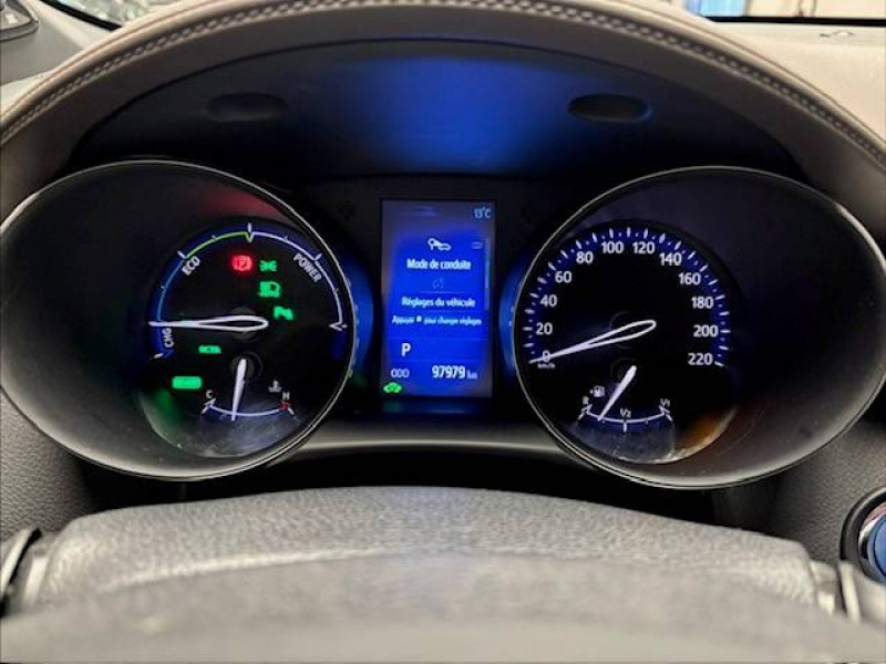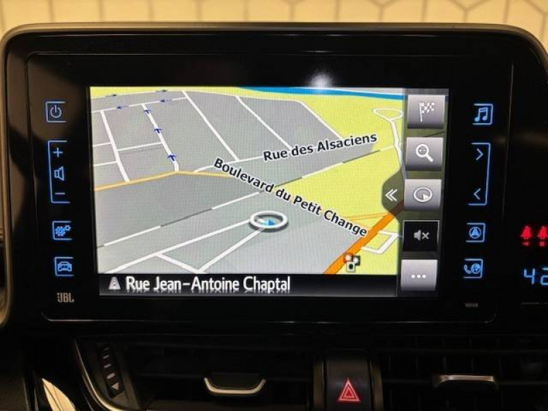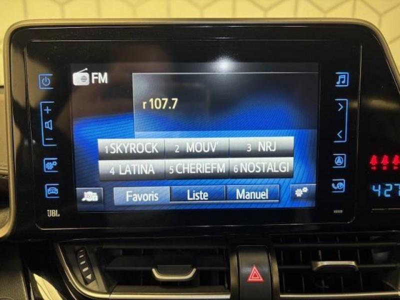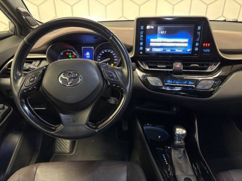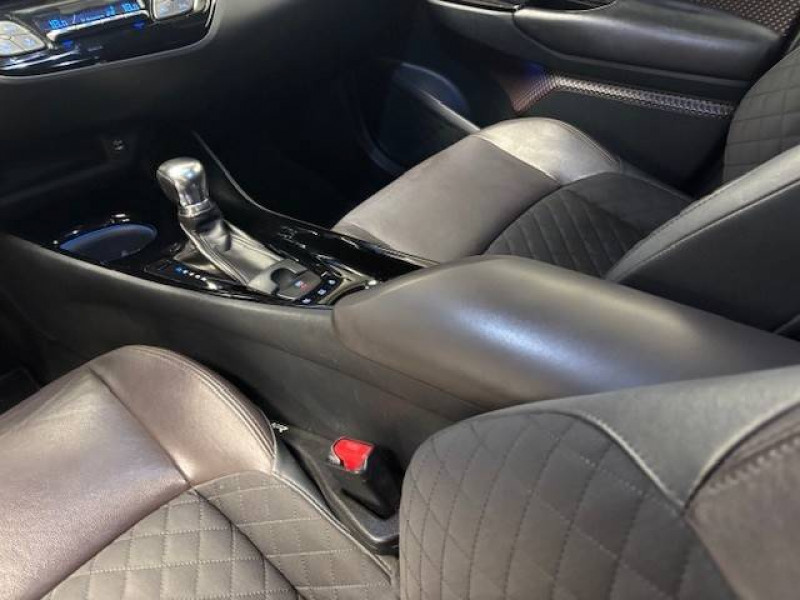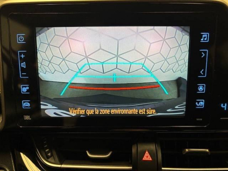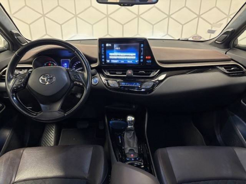 6 HP / 7 Airbags (frontaux et latéraux pour conducteur et passager AV, rideaux AV et AR et protège-genoux conducteur) / Antenne de toit type requin / Avertisseur d'angles morts (BSM) / Avertisseur de circulation AR (RCTA) / Console centrale noir laqué / Contre-portes avec inserts noirs laqués / Déconnection de l'airbag passager / Follow me home (feux AV à extinction différée) / Illumination des contre-portes / Indicateur de perte de pression des pneus / Jantes alliage 18" Distinctive / Kit de réparation anti-crevaison / Lignes de vitres chromées / Montant central (pilier B) noir laqué / Ordinateur de bord avec écran TFT couleur 4.2" multifonctions / Ornements intérieurs chocolat / Poches aumonières au dos des sièges AV / Prises auxiliaire et USB / Purificateur d'air ionique Nanoe / Réglages manuels du siège conducteur / Rétroviseur intérieur anti-éblouissement / Rétroviseurs extérieurs rabattables automatiquement avec projection au sol du logo Toyota C-HR / Sellerie mi-cuir chocolat et noir / Sièges AV type sport avec maintiens latéraux / Support lombaire du siège conducteur (électrique) / Système d'aide au stationnement intelligent IPA / Système de téléphone Bluetooth / Système d'ouverture/fermeture sans clé "Smart Entry" (conducteur, passager et coffre) / Système multimédia Toyota Touch 2 (Système audio avec radio) / Systèmes de contrôle de stabilité (VSC), de motricité (TRC) et direction assistée (EPS) / Systèmes de freinage antiblocage (ABS) et d'amplification de freinage d'urgence (BA) / Toyota Safety Sense Système de sécurité précollision avec détection des piétons, Alerte de franchissement de ligne et détecteur de fatigue, gestion automatique des feux de route, lecture des panneaux de signalisation, régulateur de vitesse adaptatif.
