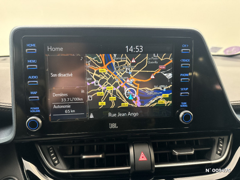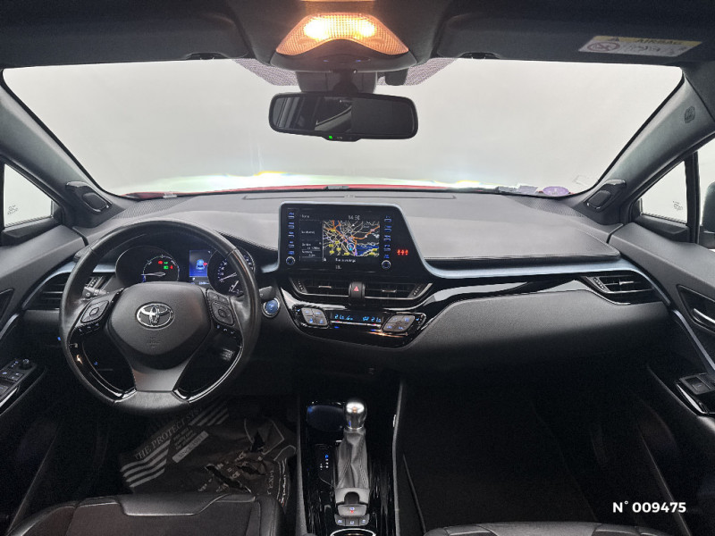 Rétroviseur intérieur électrochromatique / Rétroviseurs extérieurs avec projection au sol du logo Toyota C-HR / Rétroviseurs extérieurs électriques, dégivrants et rabattables électriquement avec rappel de clignotants / Rétroviseurs extérieurs électriques et dégivrants avec rappels de clignotants / Revêtement supérieur de planche de bord et d'accoudoir central noir / Sellerie en cuir Alcantara noir avec embossage Toyota C-HR / Coffre à double fond avec plancher surélevé / Combiné d'instrumentation avec écran couleur TFT multifonction 4" / Commandes de boîte de vitesses séquentielle / Coques de rétroviseurs extérieurs noires / Déconnection de l'airbag passager / Eclairage d'accueil / Ecran couleur tactile multifonction 8" / Ecrous antivol / Essuie-glaces AV avec détecteur de pluie / Fermeture centralisée avec commande à distance / Feu de recul central à LED sur bouclier AR / Feux AR à LED avec clignotants séquentiels / Filet coffre / Follow me home (feux AV à extinction différée) / Frein de stationnement électrique / Frein de statlionnement électrique / Immobiliseur avec avertisseur sonore / Indicateur de sous-gonflage des pneus / Kit de réparation anti-crevaison / Kit de sécurité / Lignes de vitres chromées / Montant central (pilier B) noir laqué / Optiques AR LED avec clignotants séquentiels / Optiques AV LED avec signature lumineuse Premium / Ordinateur de bord avec écran TFT couleur 4.2" multifonctions / Pare-chocs AV couleur caisse / Peinture bi-ton Bleu Nebula/Toit Noir / Siège passager AV ajustable manuellement en hauteur / Siège passager réglable manuellement en hauteur / Sièges AV type sport avec maintiens latéraux / Système audio JBL Premium avec 9HP / Système AVAS (Acoustic Vehicle Alerting System) / Système d'accès (conducteur, passager et coffre) et de démarrage sans clé "Smart Entry & Start" / Système d'aide au stationnement intelligent S-IPA / Système d'appel d'urgence automatique "E-Call" / Système de connectivité smartphone Apple CarPlay / Android Auto / Système de contrôle de motricité (TRC) / Système de contrôle de stabilité (VSC) + Système de contrôle de motricité (TRC) / Système de contrôle de trajectoire (VSC) / Accoudoir central avec compartiment de rangement / Alarme avec fonction antidémarrage / Antenne de toit type requin / Avertisseur d'angles morts (BSM) / Avertisseur de circulation AR+freinage / Avertisseurs d'angles morts et de circulation AR avec freinage d'urgence auto / Becquet AV couleur carrosserie / Calculateur de temps de conduite en électrique / Carrosserie bi-ton avec toit noir / Ciel de toit gris clair / 7 Airbags (frontaux et latéraux pour conducteur et passager AV, rideaux AV et AR et protège-genoux conducteur) / 7 Airbags (frontaux, lateraux, rideaux et un protège-genoux conducteur) / 9 HP / Ornement de pare-chocs AR chromé façon canules / Ornementation de console centrale et de portières gris célestin / Ornements de console centrale et de portières Gris Célestine / Siège conducteur électrique, réglable en hauteur avec réglage lombaire électrique / Système de freinage antiblocage (ABS), BA et EBD / Système de téléphonie Bluetooth / Système multimédia Toyota Touch avec radio DAB, écran couleur tactile 8'', bluetooth, USB / Système Toyota Touch & Go : système de navigation 3D à écran couleur tactile 8" avec reconnaissance vocale et 3 ans de mises à jour cartographiques et de services connectés inclus / Tapis de sol en velours AV/AR / Toyota Safety Sense Système de sécurité précollision avec détection des piétons, Alerte de franchissement de ligne et détecteur de fatigue, gestion automatique des feux de route, lecture des panneaux de signalisation, régulateur de vitesse adaptatif. / Toyota Touch & Go Plus 2 : système de navigation à écran tactile avec info trafic et cartographie européenne, reconnaissance vocale et vue 3D / Vitres électriques AV et AR avec descente et remontée à impulsion / Volant chauffant / Siège conducteur à réglage lombaire électrique / Poches aumonières au dos des sièges AV / Poignées de portes et pare-chocs AV couleur carrosserie / Poignées de portes extérieures couleur carroserie / Prises auxiliaire et USB / Projecteurs adaptatifs avec ajustement automatique de la hauteur des phares