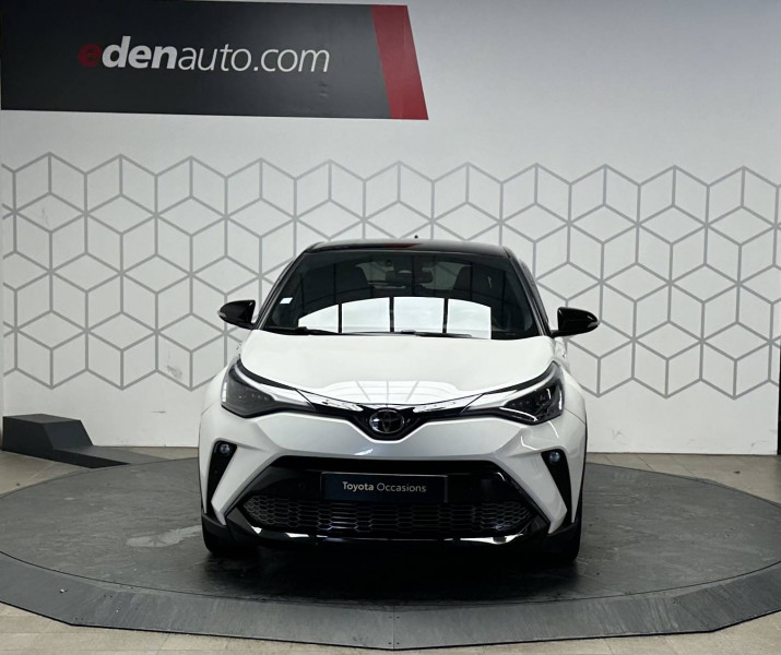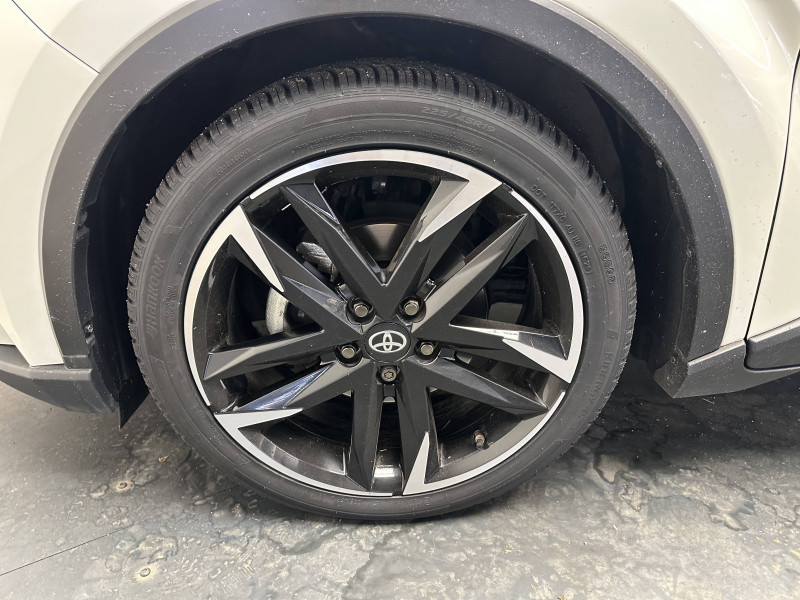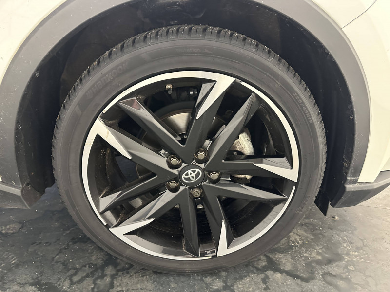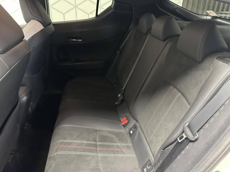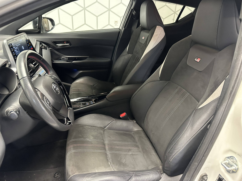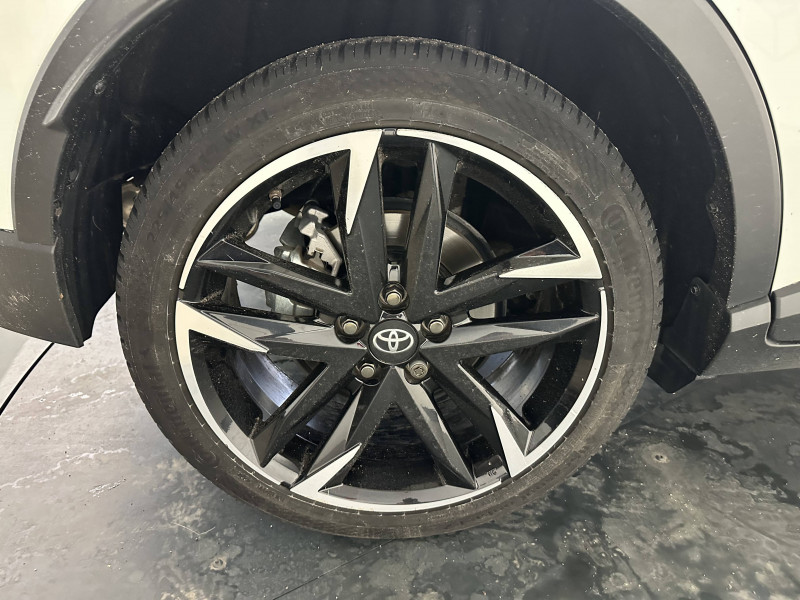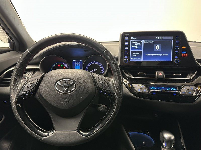 6 HP / 7 Airbags (frontaux, lateraux, rideaux et un protège-genoux conducteur) / Accoudoir central avec compartiment de rangement / Ajustement manuel de la hauteur des phares / Alarme avec fonction antidémarrage / Antenne de toit type requin / Avertisseurs d'angles morts et de circulation AR avec freinage d'urgence auto / Bouton de démarrage spécifique "GR SPORT" / Calculateur de temps de conduite en électrique / Carrosserie bi-ton avec toit noir / Ciel de pavillon noir / Combiné d'instrumentation avec écran couleur TFT multifonction 4" / Coques de rétroviseurs extérieurs noires / Eclairage d'accueil / Ecrous antivol / Fermeture centralisée avec commande à distance / Feu de recul central à LED sur bouclier AR / Feux AR à LED avec clignotants séquentiels / Filet coffre / Frein de stationnement électrique / Indicateur de sous-gonflage des pneus / Kit de réparation anti-crevaison / Kit de sécurité / Lignes de vitres noir laqué / Montant central (pilier B) noir laqué / Optiques AV LED avec signature lumineuse Premium / Ornements latéraux noirs / Poches aumonières au dos des sièges AV / Poignées de portes et pare-chocs AV couleur carrosserie / Purificateur d'air ionique Nanoe / Rétroviseur intérieur électrochromatique / Rétroviseurs extérieurs avec projection au sol du logo Toyota C-HR / Rétroviseurs extérieurs électriques et dégivrants avec rappels de clignotants / Revêtement supérieur de planche de bord et d'accoudoir central noir / Sellerie cuir et Alcantara noir avec surpiqûres grises et rouges et logo GR Sport / Seuils de portes GR Sport / Siège conducteur à réglage lombaire électrique / Siège passager AV ajustable manuellement en hauteur / Sièges AV type sport avec maintiens latéraux / Système AVAS (Acoustic Vehicle Alerting System) / Système d'accès (conducteur, passager et coffre) et de démarrage sans clé "Smart Entry & Start" / Système d'appel d'urgence automatique "E-Call" / Système de connectivité smartphone Apple CarPlay / Android Auto / Système de contrôle de motricité (TRC) / Système de contrôle de trajectoire (VSC) / Système de freinage antiblocage (ABS), BA et EBD / Système multimédia Toyota Touch avec radio DAB, écran couleur tactile 8'', bluetooth, USB / Tapis de sol en velours AV/AR / Toyota Safety Sense Système de sécurité précollision avec détection des piétons, Alerte de franchissement de ligne et détecteur de fatigue, gestion automatique des feux de route, lecture des panneaux de signalisation, régulateur de vitesse adaptatif. / Traitement spécifique des optiques AV / Volant et pommeau de levier de vitesse gainé cuir avec surpiqûres rouges