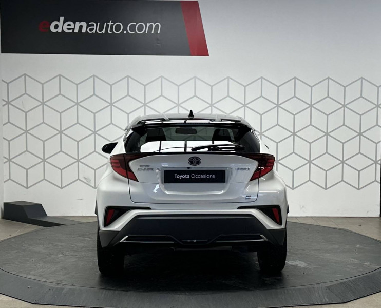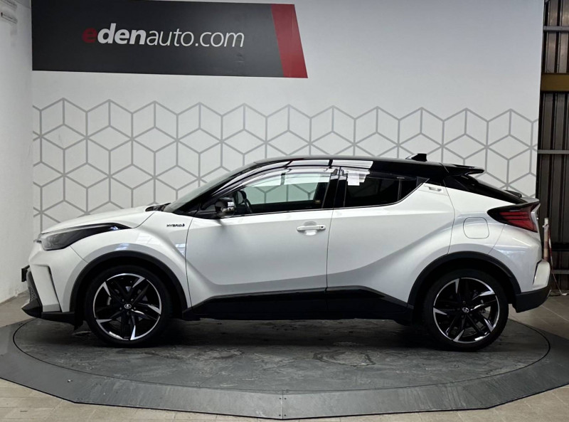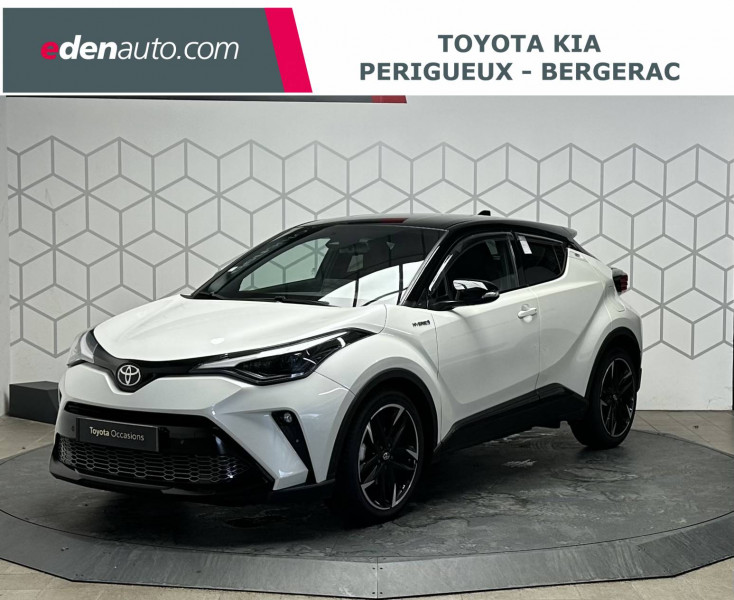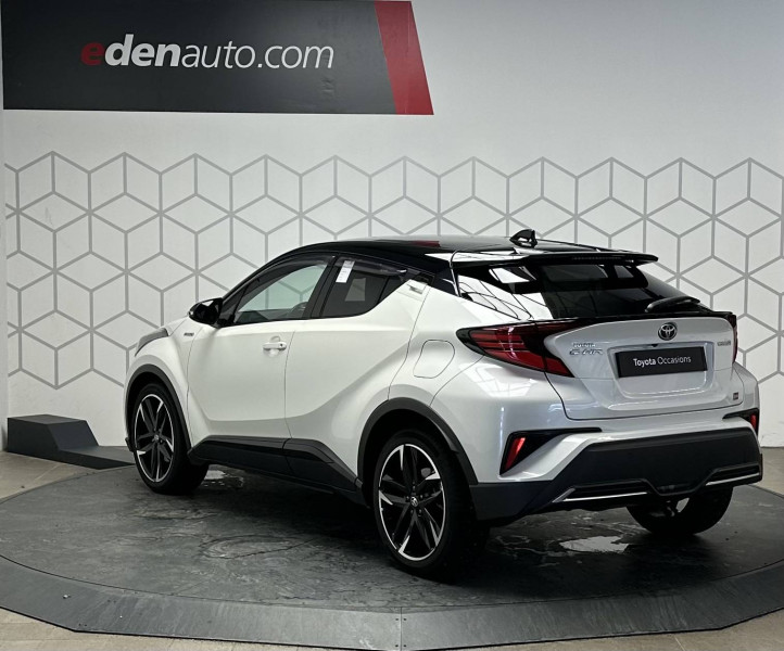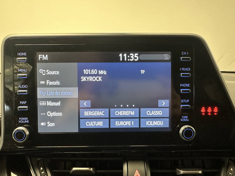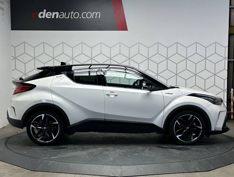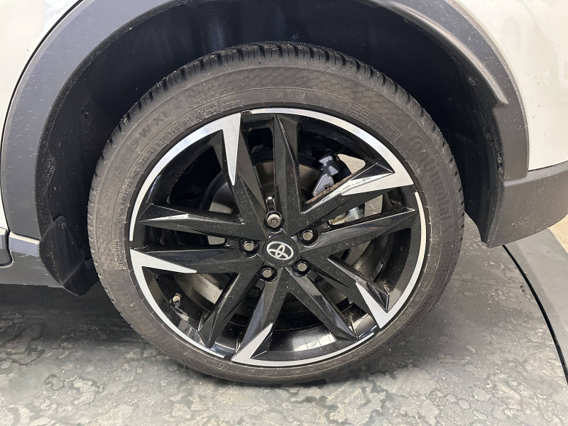 6 HP / 7 Airbags (frontaux, lateraux, rideaux et un protège-genoux conducteur) / Accoudoir central avec compartiment de rangement / Ajustement manuel de la hauteur des phares / Alarme avec fonction antidémarrage / Antenne de toit type requin / Avertisseurs d'angles morts et de circulation AR avec freinage d'urgence auto / Bouton de démarrage spécifique "GR SPORT" / Calculateur de temps de conduite en électrique / Carrosserie bi-ton avec toit noir / Ciel de pavillon noir / Combiné d'instrumentation avec écran couleur TFT multifonction 4" / Coques de rétroviseurs extérieurs noires / Eclairage d'accueil / Ecrous antivol / Fermeture centralisée avec commande à distance / Feu de recul central à LED sur bouclier AR / Feux AR à LED avec clignotants séquentiels / Filet coffre / Frein de stationnement électrique / Indicateur de sous-gonflage des pneus / Kit de réparation anti-crevaison / Kit de sécurité / Lignes de vitres noir laqué / Montant central (pilier B) noir laqué / Optiques AV LED avec signature lumineuse Premium / Ornements latéraux noirs / Poches aumonières au dos des sièges AV / Poignées de portes et pare-chocs AV couleur carrosserie / Purificateur d'air ionique Nanoe / Rétroviseur intérieur électrochromatique / Rétroviseurs extérieurs avec projection au sol du logo Toyota C-HR / Rétroviseurs extérieurs électriques et dégivrants avec rappels de clignotants / Revêtement supérieur de planche de bord et d'accoudoir central noir / Sellerie cuir et Alcantara noir avec surpiqûres grises et rouges et logo GR Sport / Seuils de portes GR Sport / Siège conducteur à réglage lombaire électrique / Siège passager AV ajustable manuellement en hauteur / Sièges AV type sport avec maintiens latéraux / Système AVAS (Acoustic Vehicle Alerting System) / Système d'accès (conducteur, passager et coffre) et de démarrage sans clé "Smart Entry & Start" / Système d'appel d'urgence automatique "E-Call" / Système de connectivité smartphone Apple CarPlay / Android Auto / Système de contrôle de motricité (TRC) / Système de contrôle de trajectoire (VSC) / Système de freinage antiblocage (ABS), BA et EBD / Système multimédia Toyota Touch avec radio DAB, écran couleur tactile 8'', bluetooth, USB / Tapis de sol en velours AV/AR / Toyota Safety Sense Système de sécurité précollision avec détection des piétons, Alerte de franchissement de ligne et détecteur de fatigue, gestion automatique des feux de route, lecture des panneaux de signalisation, régulateur de vitesse adaptatif. / Traitement spécifique des optiques AV / Volant et pommeau de levier de vitesse gainé cuir avec surpiqûres rouges