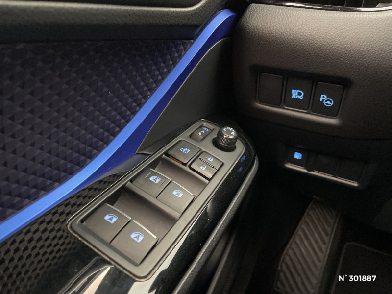 Sellerie tissu bleu et noir / Rétroviseurs extérieurs rabattables automatiquement avec projection au sol du logo Toyota C-HR / Sièges AV type sport avec maintiens latéraux / Support lombaire du siège conducteur (électrique) / Système d'aide au stationnement intelligent IPA / Système de sécurité précollision avec détection des piétons / Système de téléphone Bluetooth / Système d'ouverture/fermeture sans clé "Smart Entry" (conducteur, passager et coffre) / Système multimédia Toyota Touch 2 (Système audio avec radio) / Système multimédia Toyota Touch 2 (Système audio avec radio et DAB) / Systèmes de contrôle de stabilité (VSC), de motricité (TRC) et direction assistée (EPS) / Systèmes de freinage antiblocage (ABS) et d'amplification de freinage d'urgence (BA) / Toyota Safety Sense Système de sécurité précollision avec détection des piétons, Alerte de franchissement de ligne et détecteur de fatigue, gestion automatique des feux de route, lecture des panneaux de signalisation, régulateur de vitesse adaptatif. / 6 HP / 7 Airbags (frontaux et latéraux pour conducteur et passager AV, rideaux AV et AR et protège-genoux conducteur) / Alerte de franchissement de ligne avec aide au maintien dans la file et détecteur de fatigue / Antenne de toit type requin / "ATTENTION" - Equipements non communiqués / Avertisseur d'angles morts (BSM) / Avertisseur de circulation AR (RCTA) / Carrosserie bi-ton toit noir / Console centrale noir laqué / Contre-portes avec inserts noirs laqués / Déconnection de l'airbag passager / Follow me home (feux AV à extinction différée) / Gestion automatique des feux de route (AHB) / Illumination des contre-portes / Indicateur de perte de pression des pneus / Kit de réparation anti-crevaison / Lignes de vitres chromées / Montant central (pilier B) noir laqué / Ordinateur de bord avec écran TFT couleur 4.2" multifonctions / Ornements intérieurs bleus / Poches aumonières au dos des sièges AV / Prises auxiliaire et USB / Réglages manuels du siège conducteur / Rétroviseur intérieur anti-éblouissement