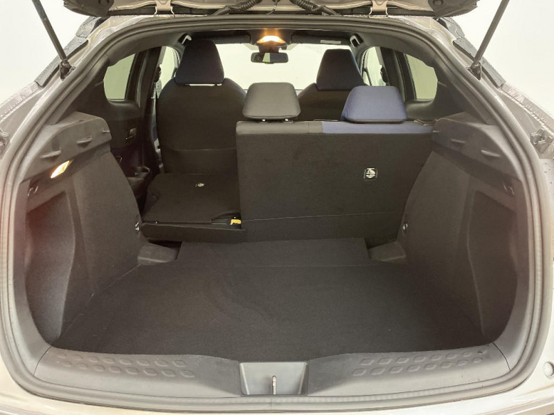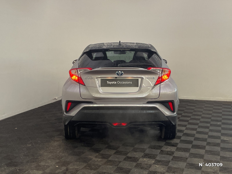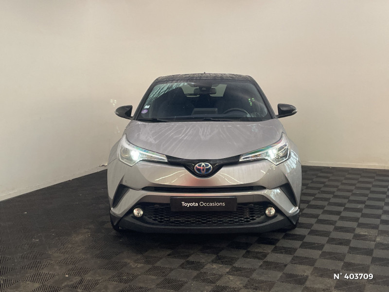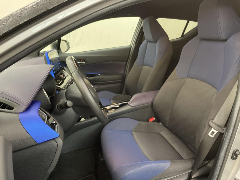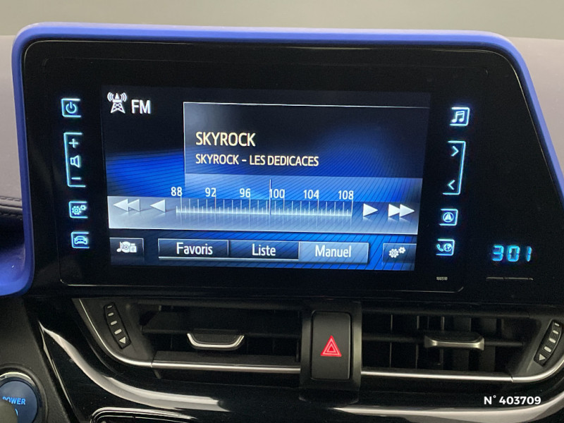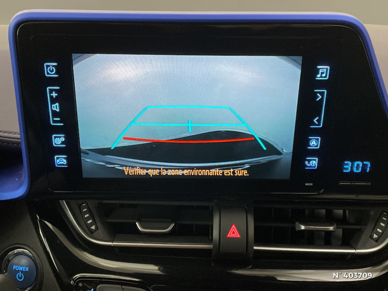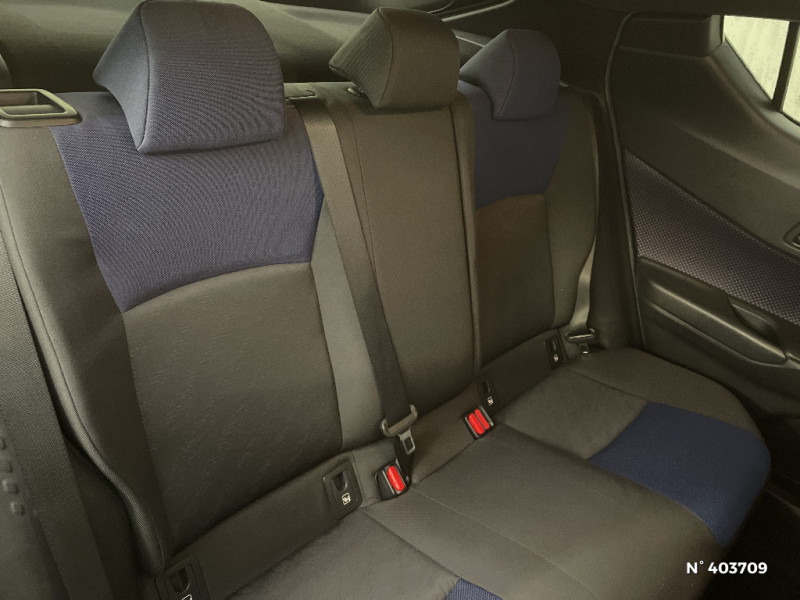 Alerte de franchissement de ligne avec aide au maintien dans la file et détecteur de fatigue / Antenne de toit type requin / "ATTENTION" - Equipements non communiqués / Avertisseur d'angles morts (BSM) / Avertisseur de circulation AR (RCTA) / Carrosserie bi-ton toit noir / Console centrale noir laqué / Contre-portes avec inserts noirs laqués / Déconnection de l'airbag passager / Follow me home (feux AV à extinction différée) / Gestion automatique des feux de route (AHB) / Illumination des contre-portes / Indicateur de perte de pression des pneus / Kit de réparation anti-crevaison / Lignes de vitres chromées / Montant central (pilier B) noir laqué / Ordinateur de bord avec écran TFT couleur 4.2" multifonctions / Ornements intérieurs bleus / Poches aumonières au dos des sièges AV / Prises auxiliaire et USB / Réglages manuels du siège conducteur / Rétroviseur intérieur anti-éblouissement / Rétroviseurs extérieurs rabattables automatiquement avec projection au sol du logo Toyota C-HR / Sellerie tissu bleu et noir / Sièges AV type sport avec maintiens latéraux / Support lombaire du siège conducteur (électrique) / Système d'aide au stationnement intelligent IPA / Système de sécurité précollision avec détection des piétons / Système de téléphone Bluetooth / Système d'ouverture/fermeture sans clé "Smart Entry" (conducteur, passager et coffre) / Système multimédia Toyota Touch 2 (Système audio avec radio) / Système multimédia Toyota Touch 2 (Système audio avec radio et DAB) / Systèmes de contrôle de stabilité (VSC), de motricité (TRC) et direction assistée (EPS) / Systèmes de freinage antiblocage (ABS) et d'amplification de freinage d'urgence (BA) / Toyota Safety Sense Système de sécurité précollision avec détection des piétons, Alerte de franchissement de ligne et détecteur de fatigue, gestion automatique des feux de route, lecture des panneaux de signalisation, régulateur de vitesse adaptatif. / 6 HP / 7 Airbags (frontaux et latéraux pour conducteur et passager AV, rideaux AV et AR et protège-genoux conducteur)