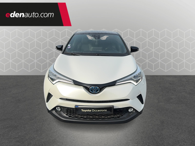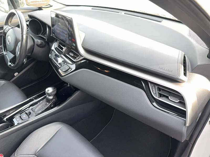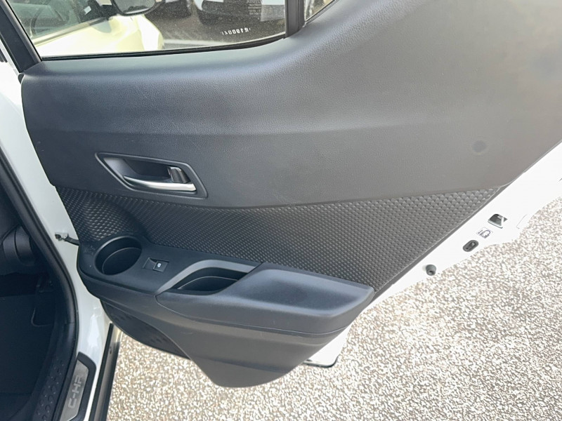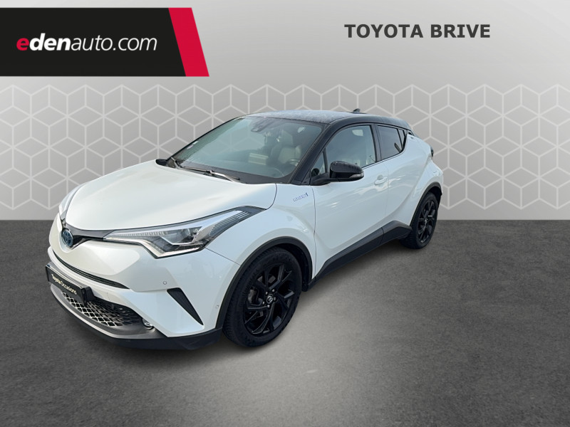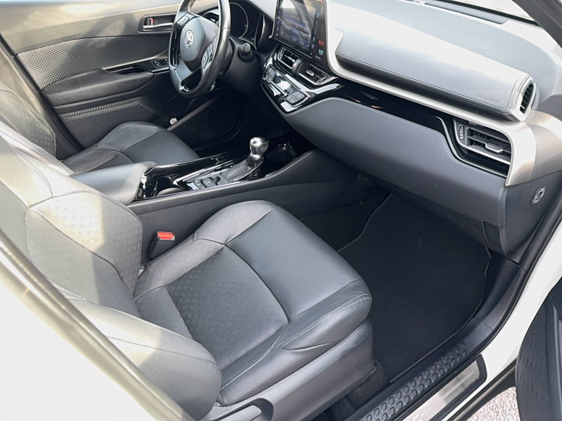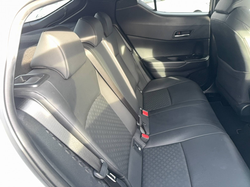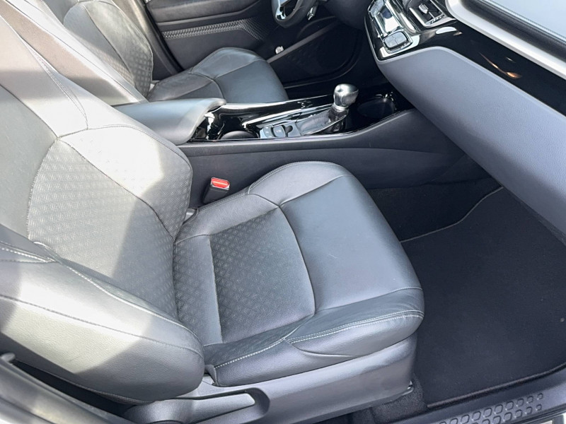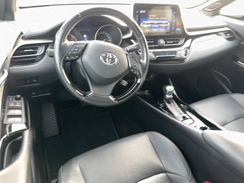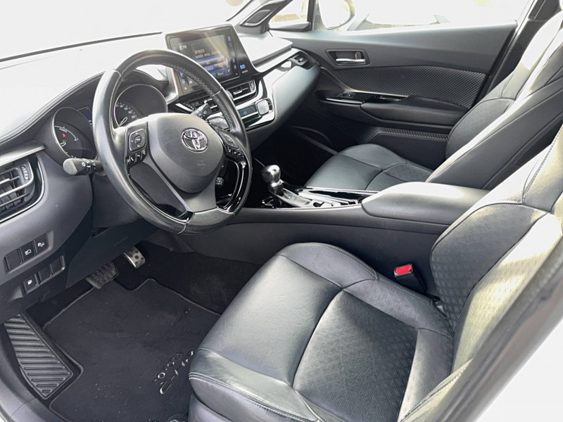 6 HP / 7 Airbags (frontaux et latéraux pour conducteur et passager AV, rideaux AV et AR et protège-genoux conducteur) / Antenne de toit type requin / Avertisseur d'angles morts (BSM) / Avertisseur de circulation AR (RCTA) / Carrosserie bi-ton toit noir / Console centrale noir laqué / Contre-portes avec inserts noirs laqués / Déconnection de l'airbag passager / Follow me home (feux AV à extinction différée) / Illumination des contre-portes / Indicateur de perte de pression des pneus / Kit de réparation anti-crevaison / Lignes de vitres chromées / Montant central (pilier B) noir laqué / Ordinateur de bord avec écran TFT couleur 4.2" multifonctions / Ornements intérieurs bleus / Poches aumonières au dos des sièges AV / Prises auxiliaire et USB / Réglages manuels du siège conducteur / Rétroviseur intérieur anti-éblouissement / Rétroviseurs extérieurs rabattables automatiquement avec projection au sol du logo Toyota C-HR / Sellerie tissu bleu et noir / Sièges AV type sport avec maintiens latéraux / Support lombaire du siège conducteur (électrique) / Système d'aide au stationnement intelligent IPA / Système de téléphone Bluetooth / Système d'ouverture/fermeture sans clé "Smart Entry" (conducteur, passager et coffre) / Système multimédia Toyota Touch 2 (Système audio avec radio) / Systèmes de contrôle de stabilité (VSC), de motricité (TRC) et direction assistée (EPS) / Systèmes de freinage antiblocage (ABS) et d'amplification de freinage d'urgence (BA) / Toyota Safety Sense Système de sécurité précollision avec détection des piétons, Alerte de franchissement de ligne et détecteur de fatigue, gestion automatique des feux de route, lecture des panneaux de signalisation, régulateur de vitesse adaptatif.