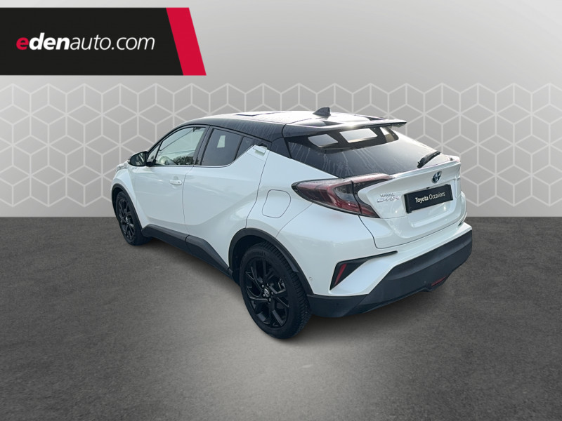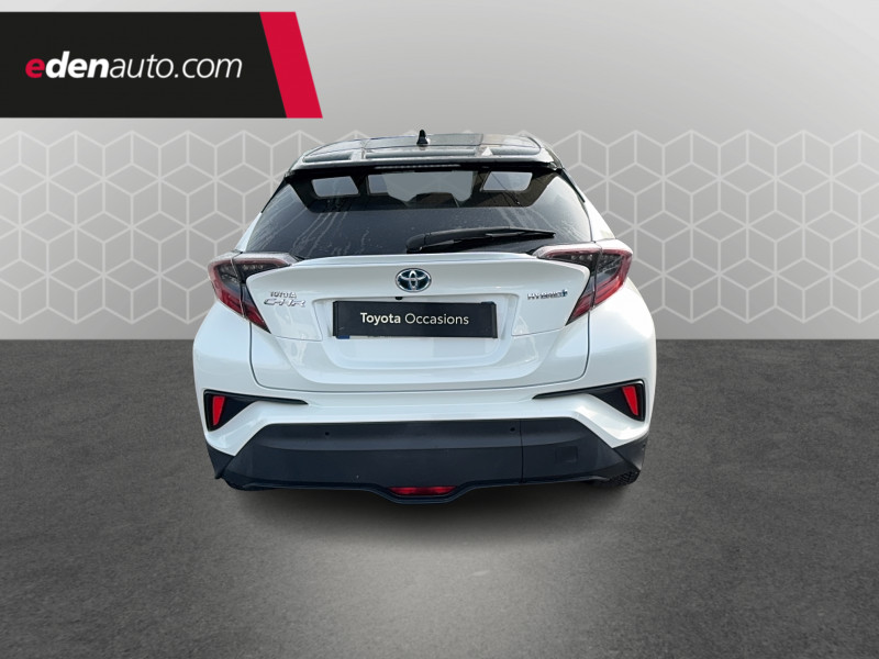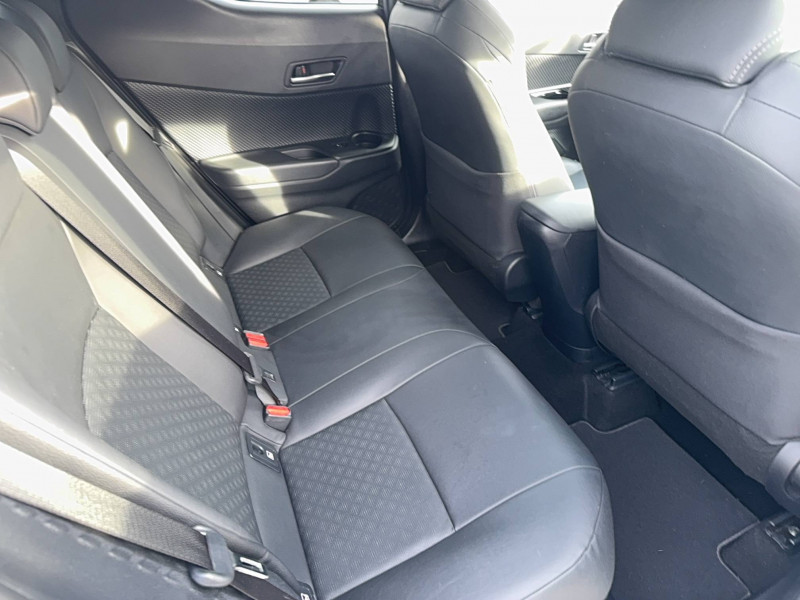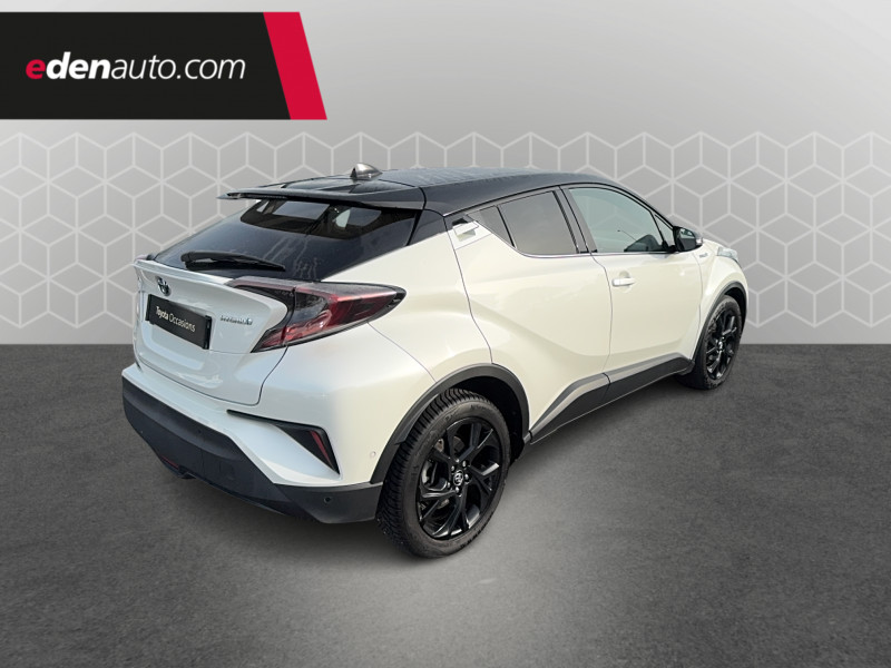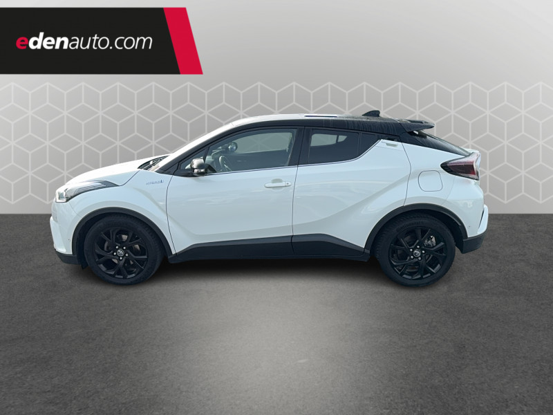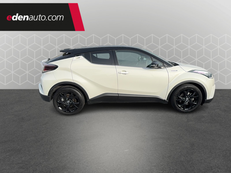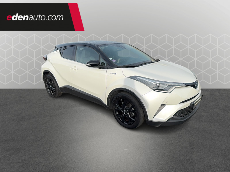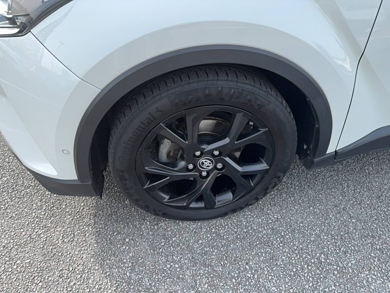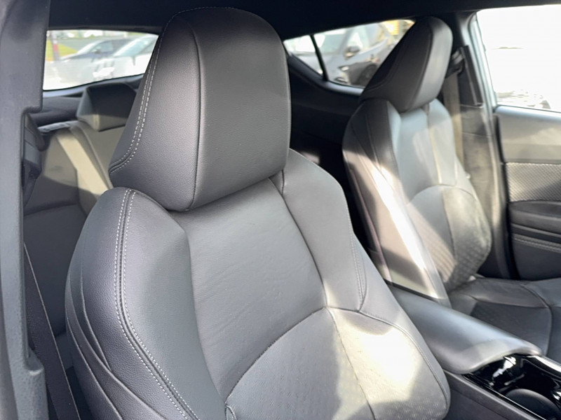 6 HP / 7 Airbags (frontaux et latéraux pour conducteur et passager AV, rideaux AV et AR et protège-genoux conducteur) / Antenne de toit type requin / Avertisseur d'angles morts (BSM) / Avertisseur de circulation AR (RCTA) / Carrosserie bi-ton toit noir / Console centrale noir laqué / Contre-portes avec inserts noirs laqués / Déconnection de l'airbag passager / Follow me home (feux AV à extinction différée) / Illumination des contre-portes / Indicateur de perte de pression des pneus / Kit de réparation anti-crevaison / Lignes de vitres chromées / Montant central (pilier B) noir laqué / Ordinateur de bord avec écran TFT couleur 4.2" multifonctions / Ornements intérieurs bleus / Poches aumonières au dos des sièges AV / Prises auxiliaire et USB / Réglages manuels du siège conducteur / Rétroviseur intérieur anti-éblouissement / Rétroviseurs extérieurs rabattables automatiquement avec projection au sol du logo Toyota C-HR / Sellerie tissu bleu et noir / Sièges AV type sport avec maintiens latéraux / Support lombaire du siège conducteur (électrique) / Système d'aide au stationnement intelligent IPA / Système de téléphone Bluetooth / Système d'ouverture/fermeture sans clé "Smart Entry" (conducteur, passager et coffre) / Système multimédia Toyota Touch 2 (Système audio avec radio) / Systèmes de contrôle de stabilité (VSC), de motricité (TRC) et direction assistée (EPS) / Systèmes de freinage antiblocage (ABS) et d'amplification de freinage d'urgence (BA) / Toyota Safety Sense Système de sécurité précollision avec détection des piétons, Alerte de franchissement de ligne et détecteur de fatigue, gestion automatique des feux de route, lecture des panneaux de signalisation, régulateur de vitesse adaptatif.