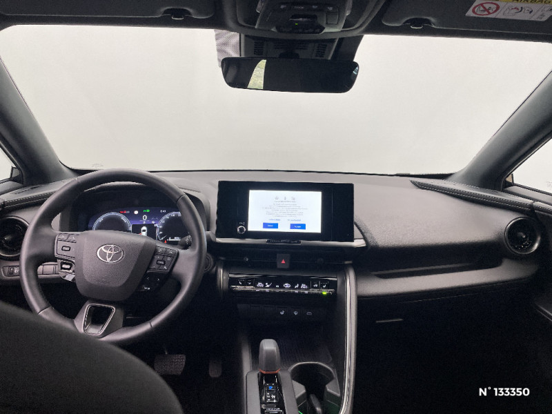 Aide à la sortie sécurisée (SEA) Le système vous aide à prévenir les accidents en surveillant les autres usagers de la route qui s¿approchent par l¿arrière. Lorsqu¿il détecte la présence d¿un cycliste ou d¿un véhicule, un indicateur lumineux s¿affiche dans les rétroviseurs extérieurs et sur l¿écran multi-informations et une alarme sonore alerte les occupants. / Alarme avec fonction antidémarrage / Assistant visuel de conduite (DMC) Ce système utilise une caméra située audessus du volant pour surveiller le niveau d¿alerte et l¿état du conducteur. Le système envoie un avertissement s¿il détecte un état anormal, comme de la fatigue. Ces activités sont utilisées pour améliorer la performance du système d¿arrêt d¿urgence autonome (EDSS) à travers la détection précoce de la distraction. / Avertisseur d'angles morts (BSM) Lorsque les capteurs détectent un véhicule dans votre angle mort latéral, un indicateur lumineux s¿éclaire sur le rétroviseur extérieur correspondant. Si vous mettez votre clignotant afin d¿indiquer un changement de voie alors qu¿un véhicule est dans votre angle mort, un indicateur lumineux apparaît dans le rétroviseur correspondant pour vous avertir du danger. / Avertisseur de circulation AR (RCTA) Cet avertisseur vous permet grâce aux capteurs d¿angles morts de repérer un véhicule arrivant de côté quand vous sortez en marche AR d¿une place de parking. S¿il détecte un risque de collision, le système freine automatiquement et stoppe le véhicule. / Boîte automatique à variation continue / Carrosserie monoton / Compteur numérique personnalisable 12,3" / Contrôle de traction (TCS) / Eclairage d'ambiance intérieur monochrome éclairage non personnalisable et non interactif : cave à pieds / rangement passager / Ecrous antivol / Electrostabilisateur programmé (ESP) / Essuie-glaces AV avec détecteur de pluie / Feux Full LED (AV/AR et antibrouillard) / Filet coffre / Jantes en alliage 18" bi-ton gris anthracite mat et aluminium / Kit de réparation anti-crevaison / Kit de sécurité / Montants B de portes noir laqué / Optiques AV full-LED / Pare-brise chauffant (sous les essuie-glaces uniquement) / Poignées de portes affleurantes / Radars de stationnement AV et AR (PKSB) Lorsque vous roulez à basse vitesse ou en marche AR, les radars permettent de détecter des objets statiques (obstacles, murs...) ou en mouvement (véhicules traversant à l¿AR), le système de freinage de l¿aide au stationnement fournit alors une assistance pour réduire l¿impact. / Rétroviseur intérieur électrochromatique / Rétroviseurs extérieurs avec éclairage au sol / Sellerie tissu bi-ton gris anthracite avec surpiqûres blanches / Services connectés de contrôle à distance MyToyota (inclus 4 ans) / Services connectés standards MyToyota (inclus 10 ans) / Seuils de portes en aluminium / Siège conducteur avec support lombaire électrique / Siège passager réglable manuellement en hauteur / Système d'appel d'urgence automatique "E-Call" / Système de rappel pour les sièges AR (RSRS) / Système d'ouverture/fermeture et démarrage sans clé "Smart Entry & Start" / Système multimédia Toyota Smart Connect : Écran couleur tactile 8 haute définition, Connectivité Bluetooth, USB et radio, FM et DAB (digitale), Système de connectivité smartphone Apple CarPlay et Android Auto (sans fil), Services intelligents dont navigation connectée avec infotrafic en temps réel, mises à jour cartographiques, assitant vocal Hey Toyota et recherche de points d¿intérêts (inclus 4 ans) / Toyota Safety Sense : Système de sécurité précollision avec détection des véhicules, piétons (jour/nuit) et cyclistes, actif également dans les intersections (PCS), Alerte de franchissement de ligne avec aide au maintien dans la file, assistant de trajectoire et détecteur de fatigue (LTA), Régulateur de vitesse adaptatif intelligent allant jusqu'à l'arrêt (ACC), Lecture des panneaux de signalisation avec limiteur de vitesse (RSA) et Gestion automatique des feux de route (AHB), Système d¿arrêt d¿urgence autonome (EDSS) / Volant chauffant / Volant gainé de matière synthétique / 6 HP / Activation automatique des feux de détresse AR (FHL)