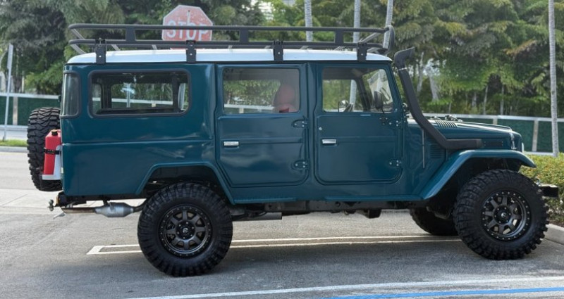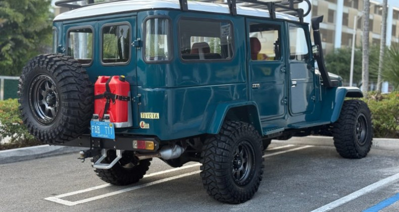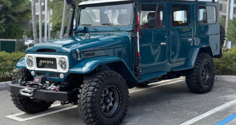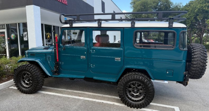 1983 Toyota Land Cruiser FJ45 • Deep teal/blue exterior • Red leather interior • Toyota TRD 4.0L V6 (1GR-FE) engine • Automatic transmission • Gated shifter • Heavy-duty off-road suspension • Large mud-terrain tires & black alloy wheels • Front steel bumper with WARN winch • Full-length expedition roof rack • Snorkel intake • Updated LED headlights • 4-door extended cabin configuration • Steel front bumper • Warn winch with synthetic line • Snorkel air intake • LED headlights and auxiliary lighting • Black tubular roof rack • Mud-terrain tires with aggressive tread • High-clearance fenders • TRD-branded 4.0L V6 • Automatic transmission with selectable gear modes • Updated cooling system • Modern wiring and electronics integration • 938 km odometer since restoration. Provenance : Florida. Disponibilité : environ 7 semaines, clés en main. 58 500 € tout compris (importation, taxes, procédure d'immatriculation). Annonce publiée le 28/11/2025