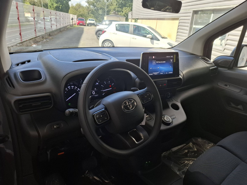 6 anneaux d'arrimage universels sur la planche de la zone de chargement / Baguettes latérales de protection noires / Banquette passager 2 places avec système Moduwork / Capucine de rangement supérieure / Charge utile 650 kg / Cloison pleine tôlée fixe avec crochet porte-habits / Cloison semi-vitrée fixe / Coques de rétroviseurs extérieurs noires / E-call / Essuie-vitre AV manuel / Frein à main électrique / Indicateur de perte de pression des pneus / Jantes en acier 16" avec enjoliveurs / Pare-chocs AV/AR en plastique noir / Peinture opaque / Plafonniers dans l'habitacle et dans l'espace de chargement / Poignées des portes extérieures noires / Portes AR battantes tôlées 60/40 avec ouverture à 180° / Revêtement de l'espace de chargement en plastique (TPO) / Siège conducteur "Confort" avec réglage longuer, hauteur, inclinaison du dossier et réglage lombaire manuel / Système de contrôle de la trajectoire (ESC) / Système de freinage antiblocage (ESP) / Système de navigation Toyota Pro-Touch avec écran 8" et connectivité smartphone (Mirror Link, Apple CarPlay, Android Auto) / Système radio numérique (DAB) Bluetooth, prises USB et prise jack / Tapis de sol AV / Verrouillage centraliséà distance (1 clé télécommande + 1 clé mécanique)