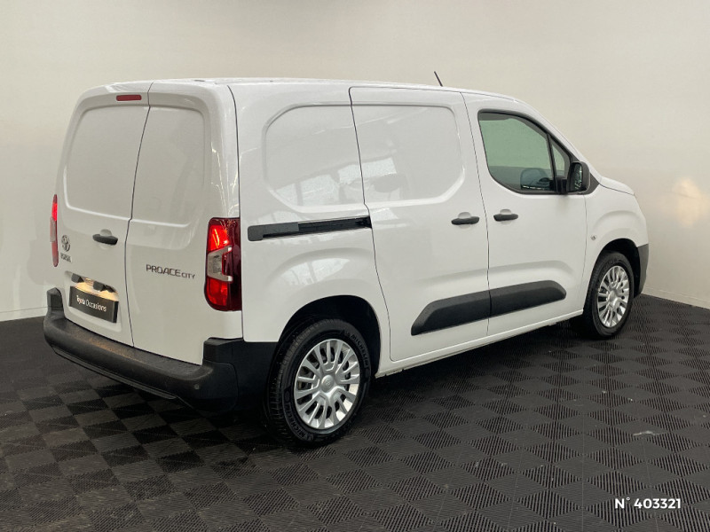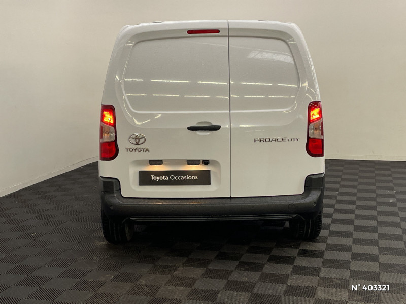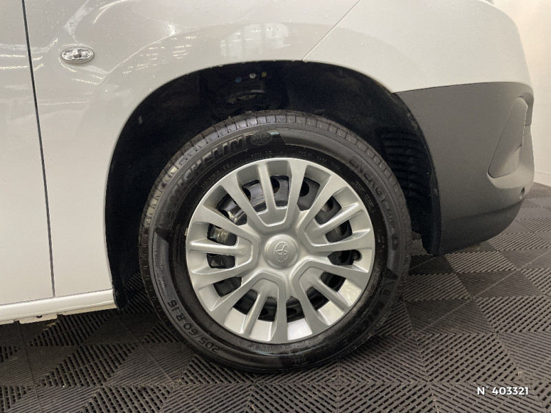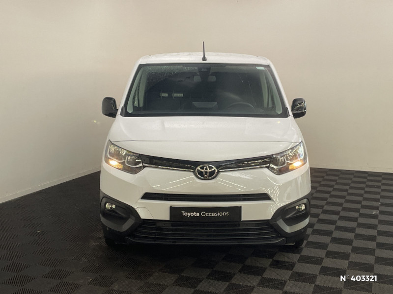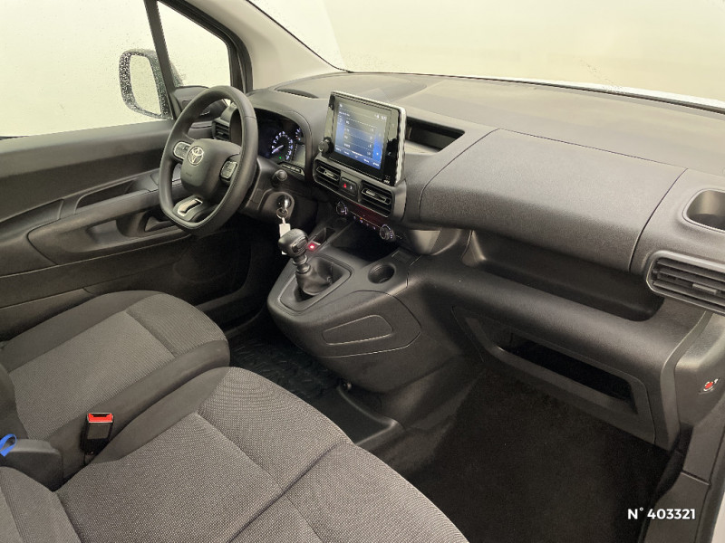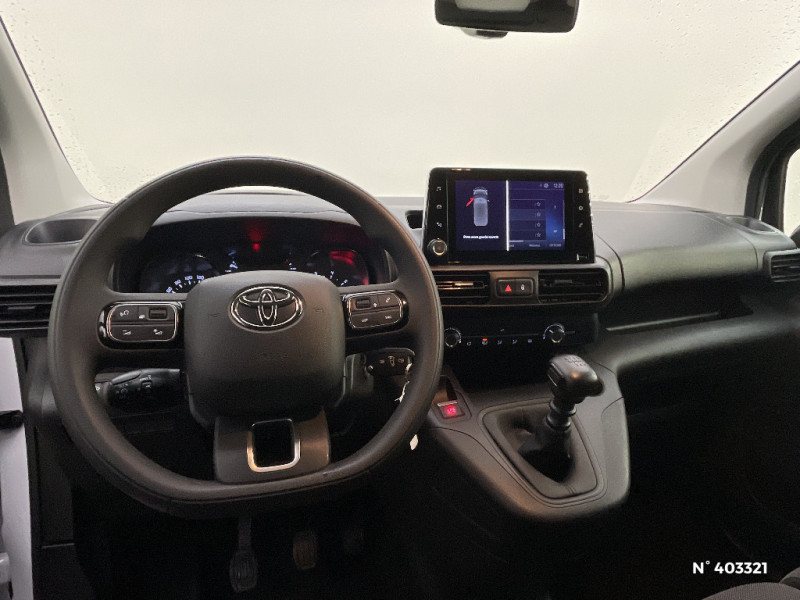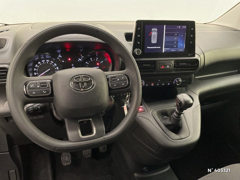 Coques de rétroviseurs extérieurs noires / Essuie-vitre AV manuel / Frein de stationnement électrique / Indicateur de perte de pression des pneus / Jantes en acier 15" grises avec cabochons / Kit de produits d'entretien "Toyota Car Care" / Kit de sécurité / Marteau de sécurité brise-vitre / Pare-chocs AV/AR en plastique noir / Peinture opaque / Plafonniers AV / Plancher en bois dans la zone de chargement / Pneus 195/65 R15 91H / Poignées de portes interieures noires / Poignées des portes extérieures en plastique noires / Portes AR battantes tôlées 60/40 avec ouverture à 180° / Prédispositif barres de toit / Programme Toyota Expérience Dimininution de la sinistralité, Réduction de l´empreinte carbone, Réduction de la consommation, Optimisation des coûts, Sécurisaton et gestion des charges, Aide à la prise en main d´un véhicule électrique / Protections latérales en plastique noir / Sellerie tissu Gris / Siège conducteur avec réglage manuel longueur, hauteur et inclinaison du dossier, avec support lombaire et accoudoir / Siège passager individuel ajustable manuellement / Système d'appel d'urgence automatique E-Call / Système de freinage antiblocage (ESP) / Système de sécurité Toyota Safety Sense / Système radio AM, FM et numérique (DAB) avec écran tactile monochrome 5", connectivité connectivité Bluetooth et commandes audio au volant et 4 hp / Tapis de sol AV caoutchouc / Toyota Safety Sense Système de sécurité précollision, Lecture des panneaux de signalisation, Détecteur d'attention du conducteur, Aide au maintien dans la voie avec correction de la direction, Gestion automatique des feux de route. / Volant et levier de vitesses en uréthane / 2 clés télcommandes / 2 places / 6 anneaux d'arrimage universels sur la planche de la zone de chargement / Airbags conducteur et passagers frontaux, rideaux et latéraux / Boîte à gants inférieure ouverte côté passager / Boîte manuelle à 6 vitesse / Capucine de rangement supérieure / Charge utile jusqu'à 850 kg / Cloison pleine tôlée fixe / Combiné d'instrumentation monochrome standard / Contrôle de la traction (TCS) / Eclairage dans la zone de chargement