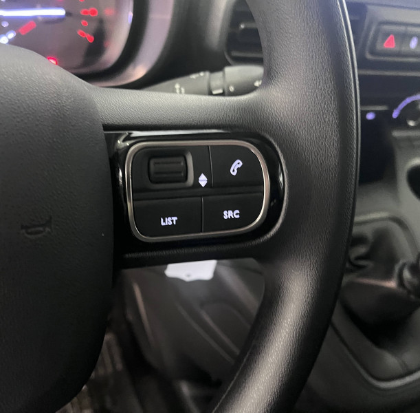 6 anneaux d'arrimage universels sur la planche de la zone de chargement / Baguettes latérales de protection noires / Banquette passager 2 places avec système Moduwork / Capucine de rangement supérieure / Charge utile 650 kg / Cloison pleine tôlée fixe avec crochet porte-habits / Cloison semi-vitrée fixe / Coques de rétroviseurs extérieurs noires / E-call / Essuie-vitre AV manuel / Frein à main électrique / Indicateur de perte de pression des pneus / Jantes en acier 15" grises avec cabochons / Pack Carrossier / Pare-chocs AV/AR en plastique noir / Plafonniers dans l'habitacle et dans l'espace de chargement / Poignées des portes extérieures noires / Portes AR battantes tôlées 60/40 avec ouverture à 180° / Pré-équipement attelage / Prise 12V sur le tableau de bord / Revêtement de l'espace de chargement en plastique (TPO) / Siège conducteur "Confort" avec réglage longuer, hauteur, inclinaison du dossier et réglage lombaire manuel / Système de contrôle de la trajectoire (ESC) / Système de freinage antiblocage (ESP) / Système radio numérique (DAB) Bluetooth, prises USB et prise jack