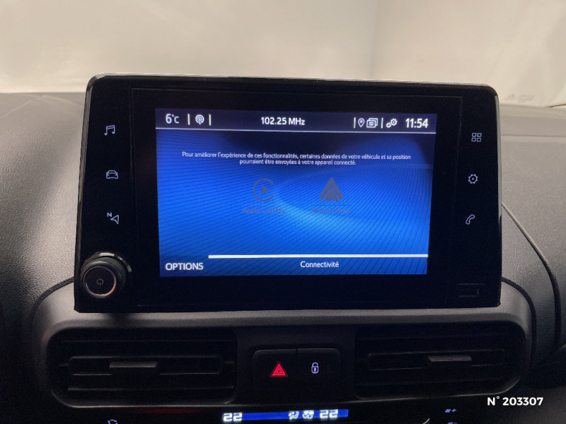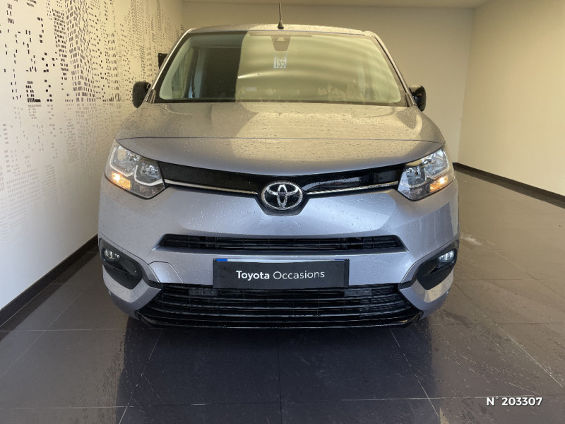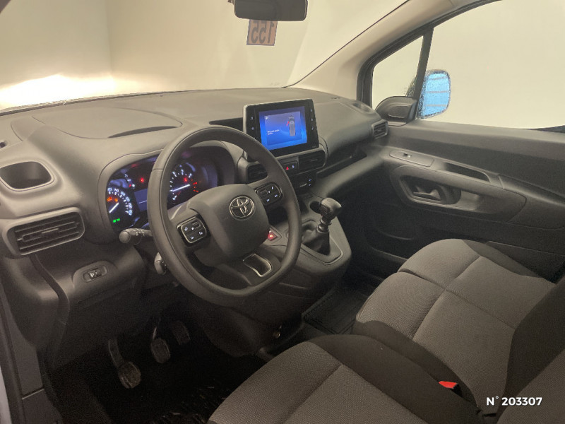 Cloison pleine tôlée fixe avec crochet porte-habits / Cloison semi-vitrée fixe / Portes AR battantes tôlées 60/40 avec ouverture à 180° / Revêtement de l¿espace de chargement en plastique (TPO) / Siège conducteur "Confort" avec réglage longuer, hauteur, inclinaison du dossier et réglage lombaire manuel / Système de navigation Toyota Pro-Touch avec écran 8" et connectivité smartphone (Mirror Link, Apple CarPlay, Android Auto) / Système radio numérique (DAB) Bluetooth, prises USB et prise jack / Tapis de sol AV / Verrouillage centraliséà distance (1 clé télécommande + 1 clé mécanique) / 6 anneaux d'arrimage universels sur la planche de la zone de chargement / Système de contrôle de la trajectoire (ESC) / Système de freinage antiblocage (ESP) / Coques de rétroviseurs extérieurs noires / E-call / Essuie-vitre AV manuel / Frein à main électrique / Indicateur de perte de pression des pneus / Jantes en acier 16" avec enjoliveurs / Pare-chocs AV/AR en plastique noir / Peinture Blanc Banquise / Plafonniers dans l'habitacle et dans l'espace de chargement / Poignées des portes extérieures noires / Baguettes latérales de protection noires / Banquette passager 2 places avec système Moduwork / Capucine de rangement supérieure / Charge utile renforcée 950 kg