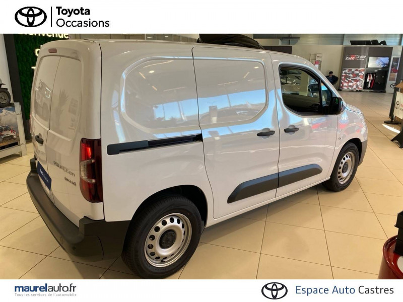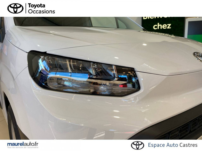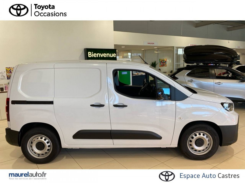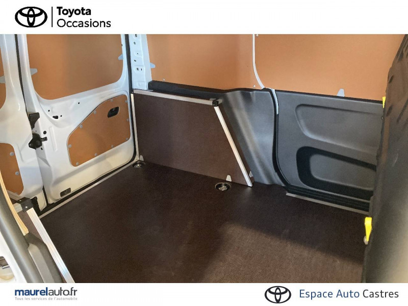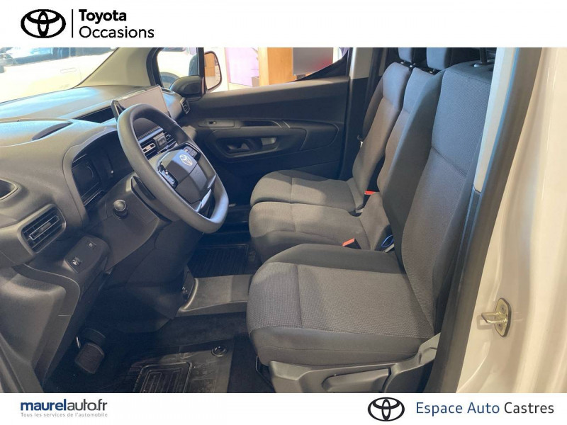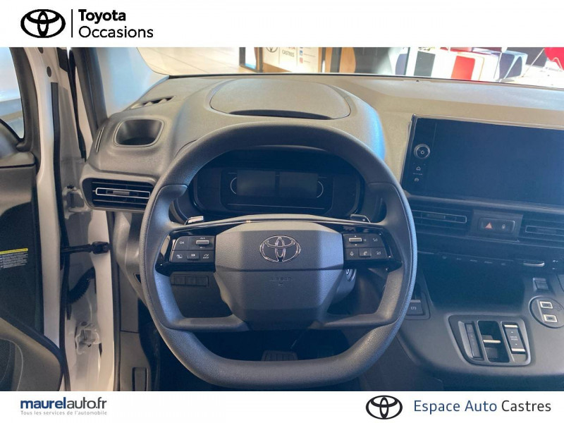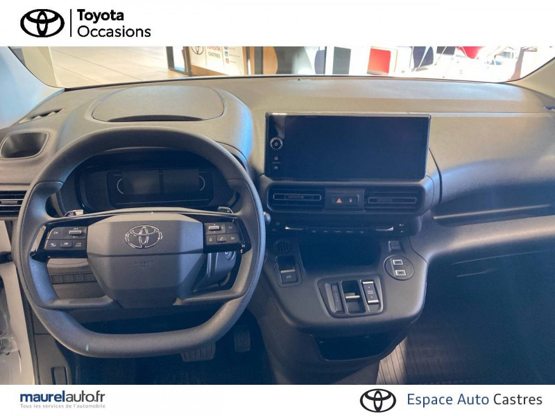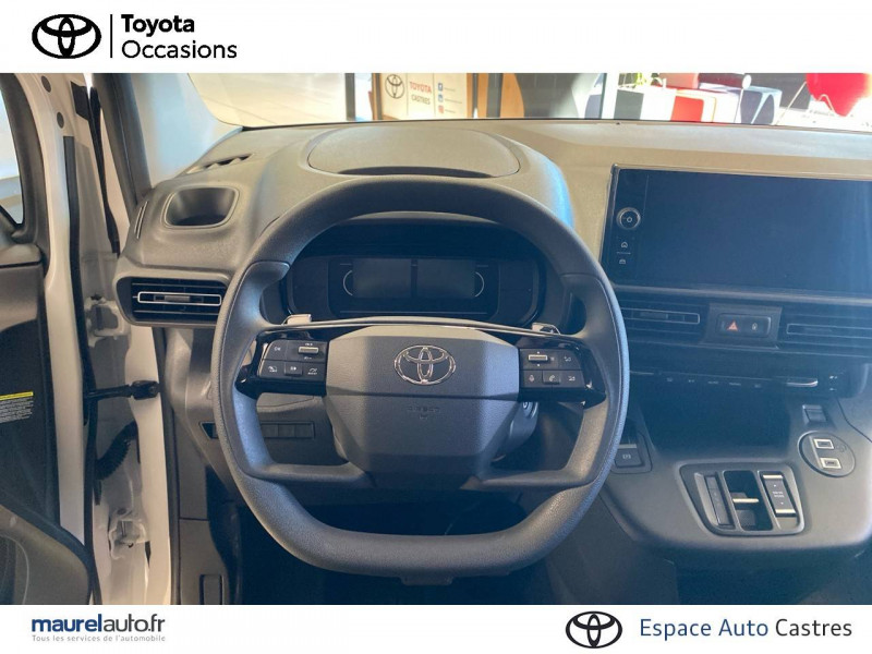 2 clés télcommandes / 2 places / 2 USB-C (charge), 1 USB-A (données + charge) / 6 crochets d'arrimage dans l'espace de chargement / ABS, ESP, TCS / Airbags conducteur et passagers frontaux, rideaux et latéraux / Boîte à gants inférieure ouverte côté passager / Boîte automatisée à variation continue / Câble de recharge Mode 2 pour prise domestique - 6 m / Câble de recharge Mode 3 pour borne électrique - 7,5 m / Capucine de rangement supérieure / Chargeur embarqué 11 kW / Charge utile 800 kg / Cloison pleine tôlée fixe / Combiné d'instrumentation monochrome standard / Coques de rétroviseurs extérieurs noires / Eclairage dans la zone de chargement / Essuie-vitre AV manuel / E-toggle / Frein de stationnement électrique / Indicateur de perte de pression des pneus / Jantes en acier 16" grises avec cabochons / Kit de produits d'entretien "Toyota Car Care" / Kit de sécurité / Marteau de sécurité brise-vitre / Pare-chocs AV/AR en plastique noir / Peinture opaque / Plafonniers AV / Plancher en bois dans la zone de chargement / Pneumatiques 215/65 R16 102H / Poignées de portes interieures noires / Poignées des portes extérieures en plastique noires / Portes AR battantes tôlées 60/40 avec ouverture à 180° / Prédispositif barres de toit / Programme Toyota Expérience Dimininution de la sinistralité, Réduction de l´empreinte carbone, Réduction de la consommation, Optimisation des coûts, Sécurisaton et gestion des charges, Aide à la prise en main d´un véhicule électrique / Protections latérales en plastique noir / Sac de rangement pour câbles de recharge / Sellerie tissu Gris / Siège conducteur avec réglage manuel longueur, hauteur et inclinaison du dossier, avec support lombaire et accoudoir / Siège passager individuel ajustable manuellement / Système d'appel d'urgence automatique E-Call / Système de sécurité Toyota Safety Sense / Système radio AM, FM et numérique (DAB) avec écran tactile monochrome 5", connectivité Bluetooth et commandes audio au volant et 4 hp / Tapis de sol AV caoutchouc / Toyota Safety Sense Système de sécurité précollision, Lecture des panneaux de signalisation, Détecteur d'attention du conducteur, Aide au maintien dans la voie avec correction de la direction, Gestion automatique des feux de route. / Volant et levier de vitesses en uréthane
