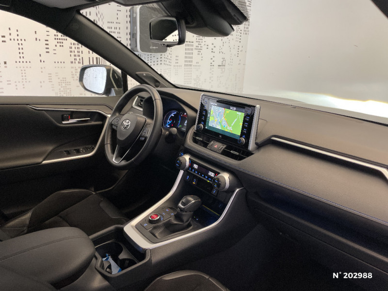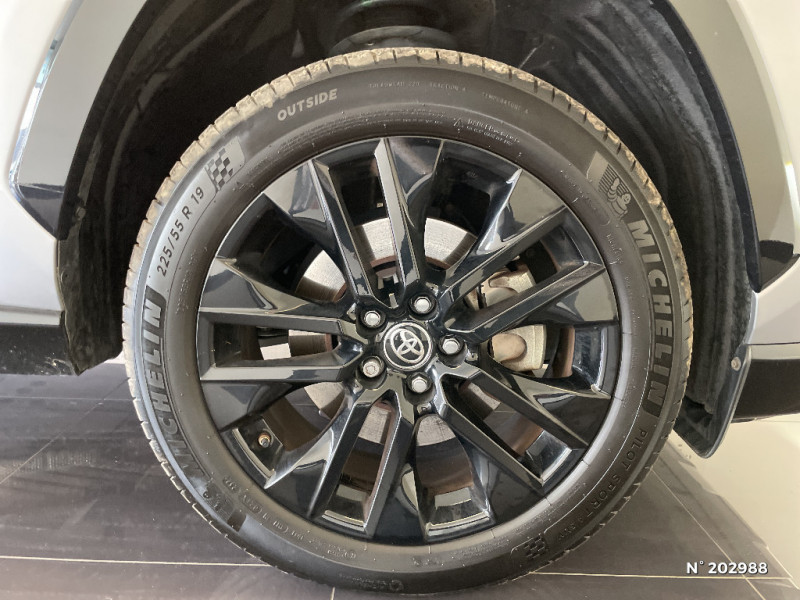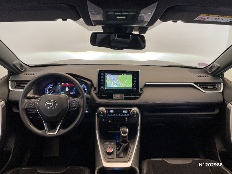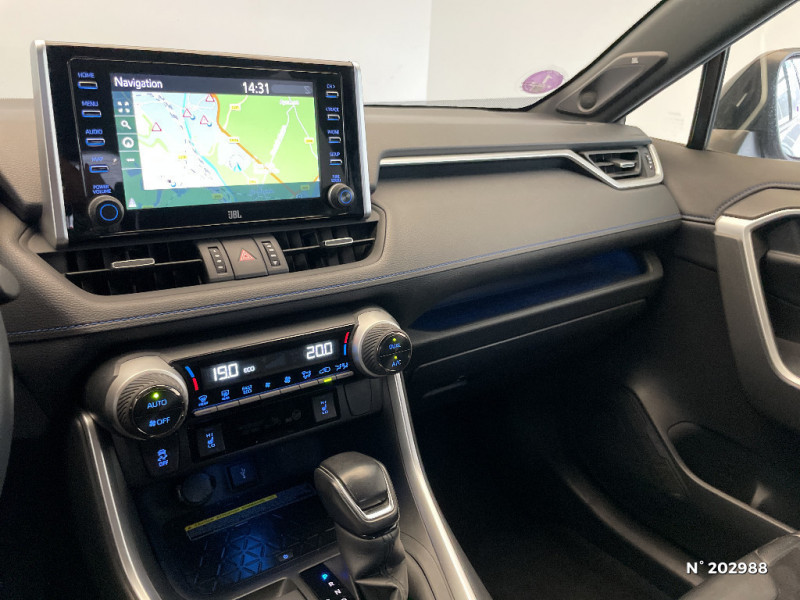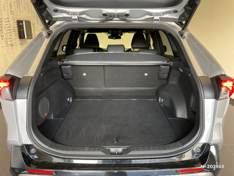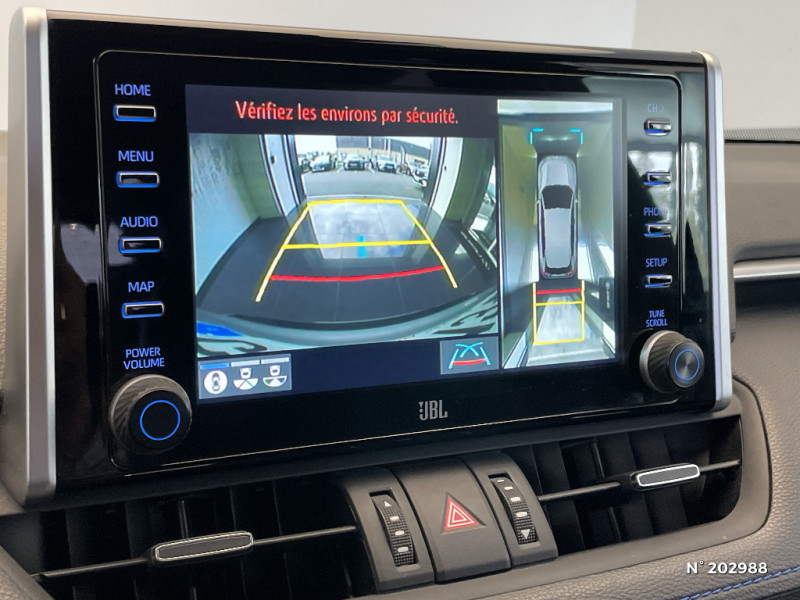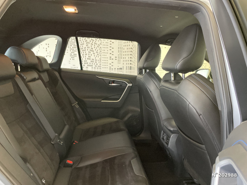 Système anti-démarrage avec fonction double verrouillage / Système audio Toyota Touch avec écran couleur tactile 8" multifonction, connectique auxiliaire/USB et radio digitale (DAB) / Système audio Toyota Touch avec écran couleur tactile 8" multifonction, lecteur CD, système de téléphonie Bluetooth, connectique auxiliaire/USB, 6 haut-parleurs et antenne DAB. / Système AVAS (Acoustic Vehicle Alerting System) / Système d'appel d'urgence automatique "E-Call" / Système de connectivité smartphone Apple CarPlay / Android Auto / Système de téléphone Bluetooth / Système d'ouverture/fermeture des portes et démarrage sans clé "Smart Entry & Start" / Système intelligent de plancher plat Toyota Easy Flat System / Systèmes de contrôle de motricité (TRC) et de stabilité (TSC) / Systèmes de freinage antiblocage (ABS) et d'amplification de freinage d'urgence (BA) + EBD / Tapis de sol RAV4 Hybrid en velours, AV et AR / Essuie-glaces AV avec détecteur de pluie / Espace de rangement latéral dans le coffre / Ecrous antivol / Eléments de carrosserie de couleur Noir Laqué / Accoudoir central AV avec compartiment de rangement / Accoudoir central AV avec compartiment de rangement rétroéclairé / Fermeture centralisée avec commande à distance et verrouillage des ouvrants en roulant / Toyota Touch & Go : système de navigation à écran tactile 8" avec info trafic et cartographie européenne / Alerte d'oubli de ceinture et de lumière / Antenne de toit type requin / Appuis-tête AV réglables en hauteur et en inclinaison réglables / "ATTENTION" - Equipements non communiqués / Avertisseur de circulation AR avec freinage d'urgence automatique (PKSB) / Badge AWD-i sur hayon / Barres de toit longitudinales / Cache-bagages / Carrosserie bi-ton avec toit et piliers peints en Noir Attitude / Ciel de pavillon noir / Clé sécurisée contre les attaques par relais / Coffre à ouverture et fermeture électriques / Combiné d'instrumentation avec écran couleur TFT 8" / Commande de blocage de différentiel "Trail" / Contreportes en cuir synthétique / Crochets porte-manteaux x2 / Double sortie d'echappement ovale / Vitres électriques AV et AR à fonction anti-pincement avec descente et remontée à impulsion / Volant et levier de vitesse gainés cuir / Volant multifonction 3 branches, réglable manuellement en hauteur et profondeur / 7 Airbags (frontaux et latéraux pour conducteur et passager AV, rideaux AV et AR et protège-genoux conducteur) / 9 HP / Toyota Safety Sense Système de sécurité précollision avec détection des piétons, Alerte de franchissement de ligne et détecteur de fatigue, gestion automatique des feux de route, lecture des panneaux de signalisation, régulateur de vitesse adaptatif. / Feux clignotants à halogène / Feux stop à halogène / Filet coffre / Frein de stationnement électrique / Grille de calandre couleur acier / Indicateur de perte de pression des pneus / Jantes en alliage 19" Mojave Noir / Kit de réparation anti-crevaison / Kit de sécurité / Optiques AV et AR à LED / Optiques AV full-LED Premium / Optiques AV LED avec signature lumineuse Premium / Peinture bi-ton Blanc Nacré/Noir Attitude / Plancher de coffre réversible avec revers imperméable / Poignées de portes extérieures couleur carroserie / Porte-gobelets rétroéclairés / Protections de soubassement AV et AR grises / Rétroviseur intérieur électrochromatique / Rétroviseurs extérieurs couleur carrosserie / Rétroviseurs extérieurs électriques, dégivrants et rabattables électriquement avec rappel de clignotants / Sélection mode de conduite : ECO, NORMAL, SPORT, EV / Sellerie en cuir Alcantara noir avec embossage "RAV4" / Séparateur de coffre / Seuils des portes aluminium siglés RAV4 / Siège conducteur à réglage lombaire électrique