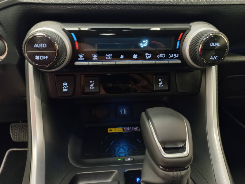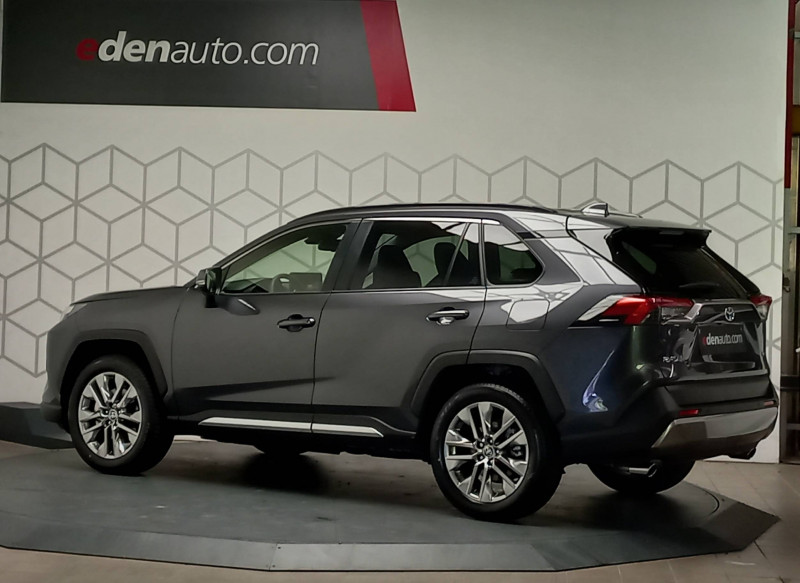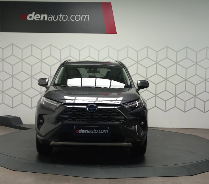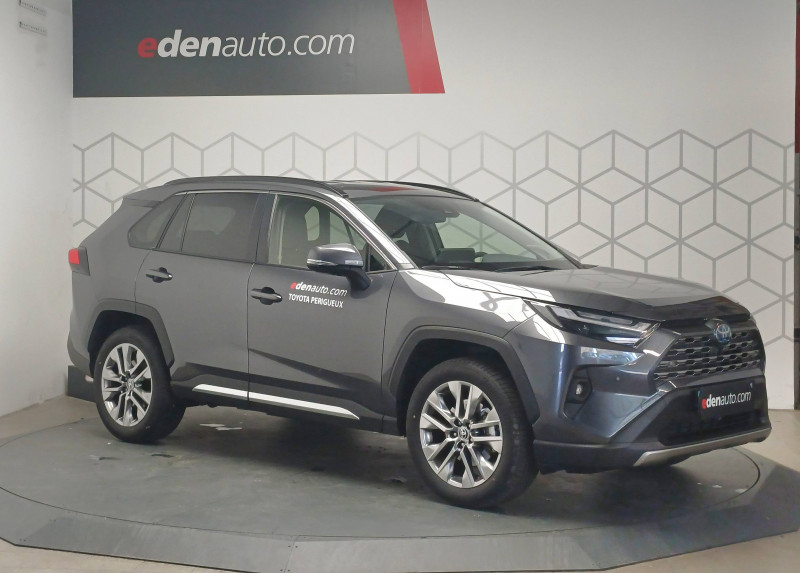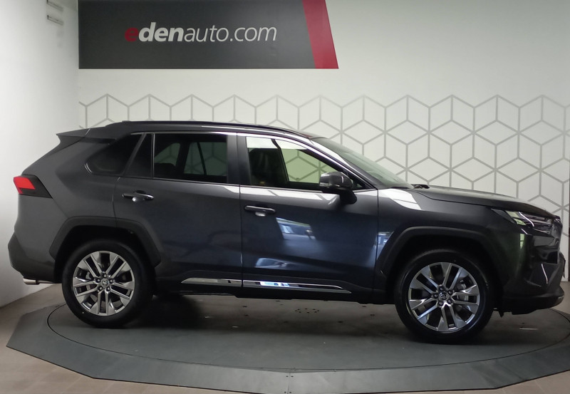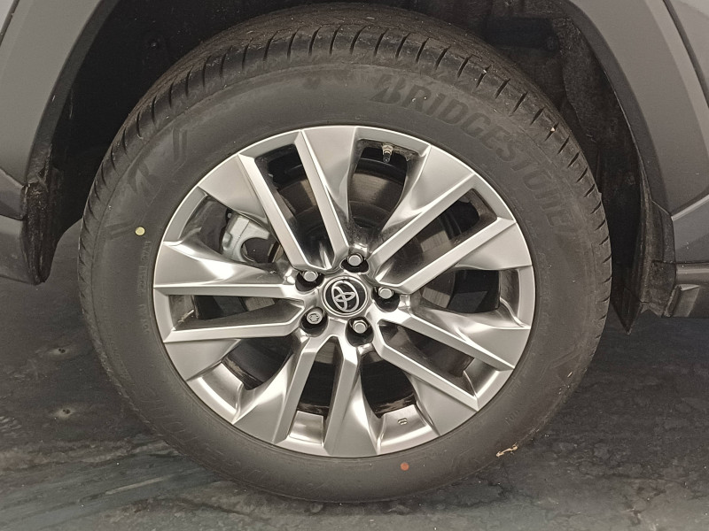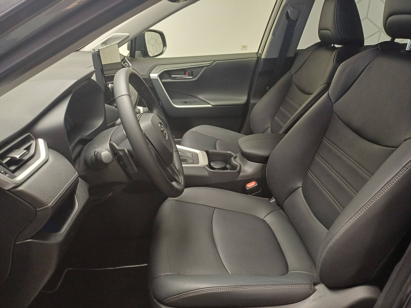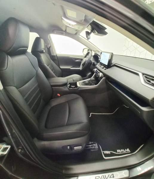 7 Airbags (frontaux et latéraux pour conducteur et passager AV, rideaux AV et AR et protège-genoux conducteur) / Accoudoir central AV avec compartiment de rangement rétroéclairé / Alerte d'oubli de ceinture et de lumière / Antenne de toit type requin / Appuis-tête AV réglables en hauteur et en inclinaison réglables / Avertisseur de circulation AR avec freinage d'urgence automatique (PKSB) / Barres de toit longitudinales / Ciel de pavillon gris / Clé sécurisée contre les attaques par relais / Coffre à ouverture et fermeture électriques / Combiné d'instrumentation avec écran couleur TFT 8" / Compteur numérique personnalisable 12,3" / Contreportes en cuir synthétique / Crochets porte-manteaux x2 / Double sortie d'echappement ovale / Ecrous antivol / Espace de rangement latéral dans le coffre / Essuie-glaces AV avec détecteur de pluie / Fermeture centralisée avec commande à distance et verrouillage des ouvrants en roulant / Feux clignotants à halogène / Feux stop à halogène / Filet coffre / Frein de stationnement électrique / Grille de calandre couleur acier / Indicateur de perte de pression des pneus / Kit de réparation anti-crevaison / Kit de sécurité / Navigation connectée / Optiques AV et AR à LED / Optiques AV LED avec signature lumineuse Premium / Pack Design / Plancher de coffre réversible avec revers imperméable / Poignées de portes extérieures couleur carroserie avec insert chromé / Porte-gobelets rétroéclairés / Protections de soubassement AV et AR grises / Rétroviseur intérieur électrochromatique / Rétroviseurs extérieurs couleur carrosserie / Rétroviseurs extérieurs électriques, dégivrants et rabattables électriquement avec rappel de clignotants / Sélection mode de conduite : ECO, NORMAL, SPORT, EV / Siège conducteur à réglage lombaire électrique / Siège conducteur à réglages électriques avec mémorisation / Système AVAS (Acoustic Vehicle Alerting System) / Système d'appel d'urgence automatique "E-Call" / Système de connectivité smartphone Apple CarPlay / Android Auto / Système de téléphone Bluetooth / Système d'ouverture/fermeture des portes et démarrage sans clé "Smart Entry & Start" / Système intelligent de plancher plat Toyota Easy Flat System / Système multimédia Toyota Smart Connect et Smart Connect Plus avec écran central 10.5, Apple CarPlay sans fil et reconnaissance vocale avancée / Systèmes de contrôle de motricité (TRC) et de stabilité (TSC) / Systèmes de freinage antiblocage (ABS) et d'amplification de freinage d'urgence (BA) + EBD / Tapis de sol RAV4 Hybrid en velours, AV et AR / Toyota Safety Sense Système de sécurité précollision avec détection des piétons, Alerte de franchissement de ligne et détecteur de fatigue, gestion automatique des feux de route, lecture des panneaux de signalisation, régulateur de vitesse adaptatif. / Vitres électriques AV et AR à fonction anti-pincement avec descente et remontée à impulsion / Volant et levier de vitesse gainés cuir / Volant multifonction 3 branches, réglable manuellement en hauteur et profondeur