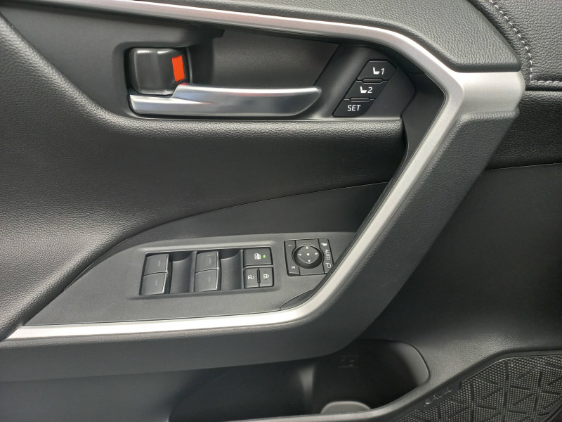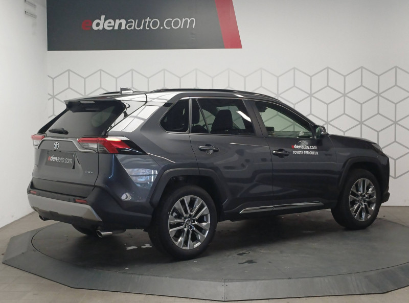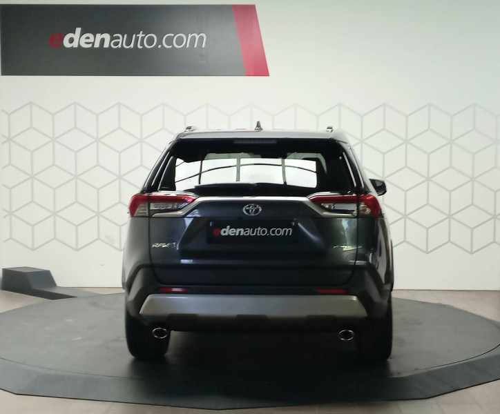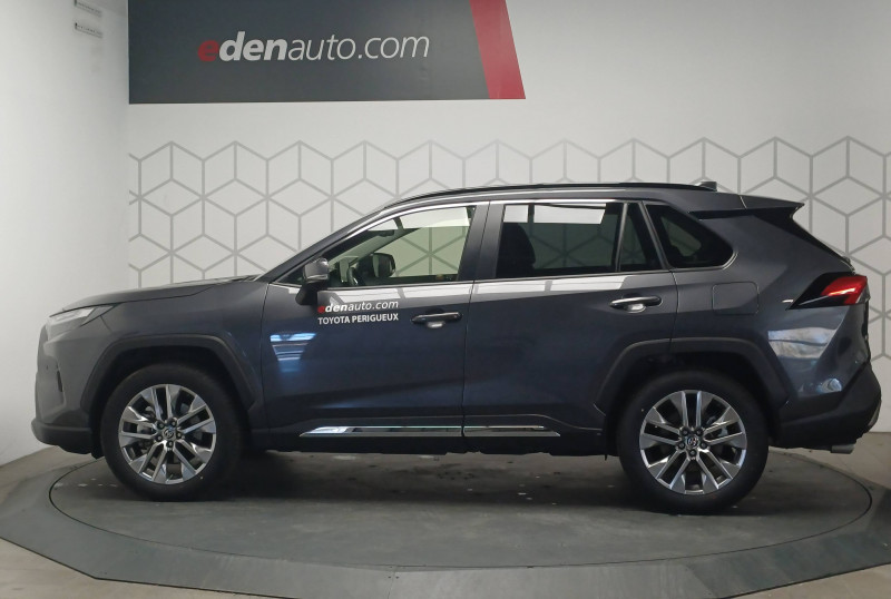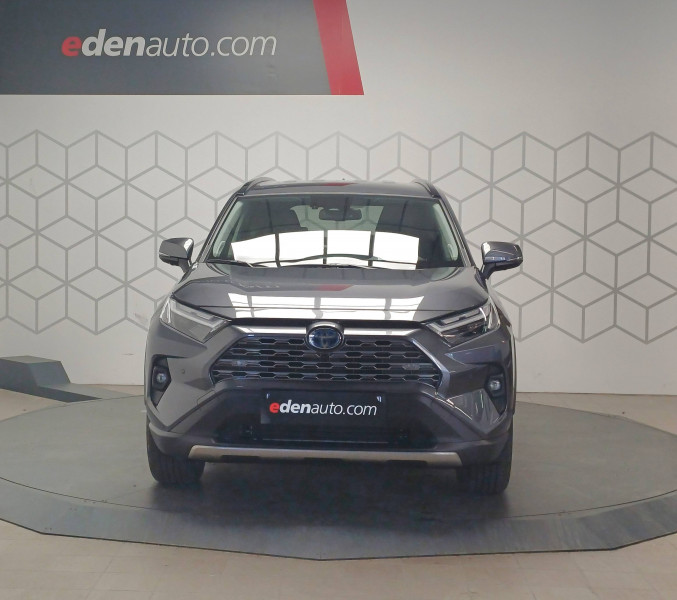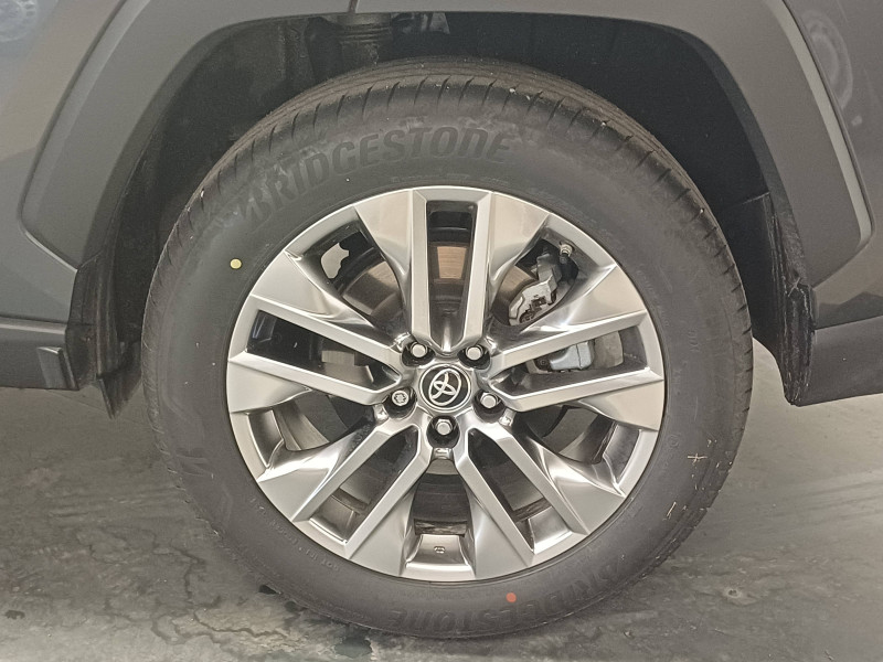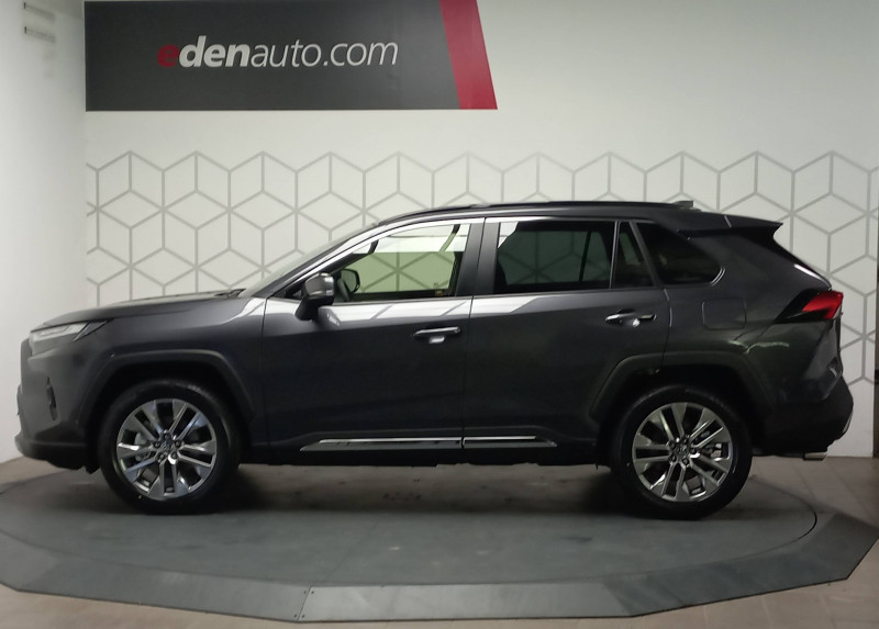 7 Airbags (frontaux et latéraux pour conducteur et passager AV, rideaux AV et AR et protège-genoux conducteur) / Accoudoir central AV avec compartiment de rangement rétroéclairé / Alerte d'oubli de ceinture et de lumière / Antenne de toit type requin / Appuis-tête AV réglables en hauteur et en inclinaison réglables / Avertisseur de circulation AR avec freinage d'urgence automatique (PKSB) / Barres de toit longitudinales / Ciel de pavillon gris / Clé sécurisée contre les attaques par relais / Coffre à ouverture et fermeture électriques / Combiné d'instrumentation avec écran couleur TFT 8" / Compteur numérique personnalisable 12,3" / Contreportes en cuir synthétique / Crochets porte-manteaux x2 / Double sortie d'echappement ovale / Ecrous antivol / Espace de rangement latéral dans le coffre / Essuie-glaces AV avec détecteur de pluie / Fermeture centralisée avec commande à distance et verrouillage des ouvrants en roulant / Feux clignotants à halogène / Feux stop à halogène / Filet coffre / Frein de stationnement électrique / Grille de calandre couleur acier / Indicateur de perte de pression des pneus / Kit de réparation anti-crevaison / Kit de sécurité / Navigation connectée / Optiques AV et AR à LED / Optiques AV LED avec signature lumineuse Premium / Pack Design / Plancher de coffre réversible avec revers imperméable / Poignées de portes extérieures couleur carroserie avec insert chromé / Porte-gobelets rétroéclairés / Protections de soubassement AV et AR grises / Rétroviseur intérieur électrochromatique / Rétroviseurs extérieurs couleur carrosserie / Rétroviseurs extérieurs électriques, dégivrants et rabattables électriquement avec rappel de clignotants / Sélection mode de conduite : ECO, NORMAL, SPORT, EV / Siège conducteur à réglage lombaire électrique / Siège conducteur à réglages électriques avec mémorisation / Système AVAS (Acoustic Vehicle Alerting System) / Système d'appel d'urgence automatique "E-Call" / Système de connectivité smartphone Apple CarPlay / Android Auto / Système de téléphone Bluetooth / Système d'ouverture/fermeture des portes et démarrage sans clé "Smart Entry & Start" / Système intelligent de plancher plat Toyota Easy Flat System / Système multimédia Toyota Smart Connect et Smart Connect Plus avec écran central 10.5, Apple CarPlay sans fil et reconnaissance vocale avancée / Systèmes de contrôle de motricité (TRC) et de stabilité (TSC) / Systèmes de freinage antiblocage (ABS) et d'amplification de freinage d'urgence (BA) + EBD / Tapis de sol RAV4 Hybrid en velours, AV et AR / Toyota Safety Sense Système de sécurité précollision avec détection des piétons, Alerte de franchissement de ligne et détecteur de fatigue, gestion automatique des feux de route, lecture des panneaux de signalisation, régulateur de vitesse adaptatif. / Vitres électriques AV et AR à fonction anti-pincement avec descente et remontée à impulsion / Volant et levier de vitesse gainés cuir / Volant multifonction 3 branches, réglable manuellement en hauteur et profondeur