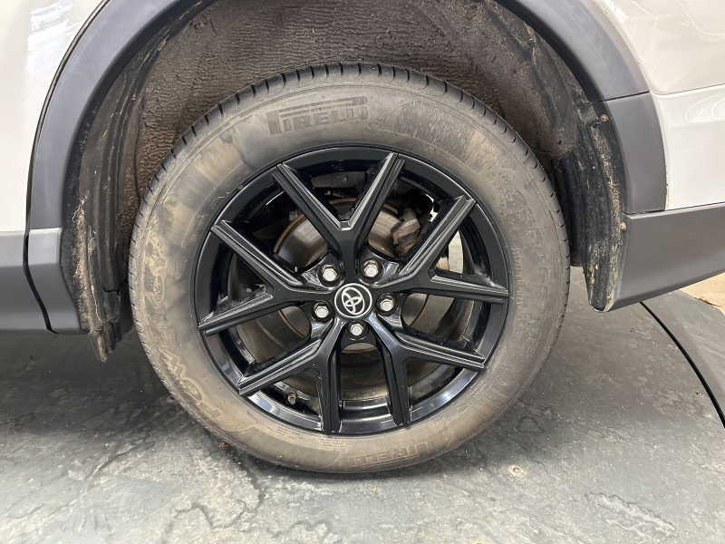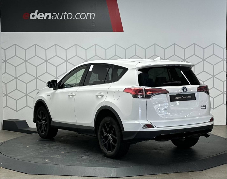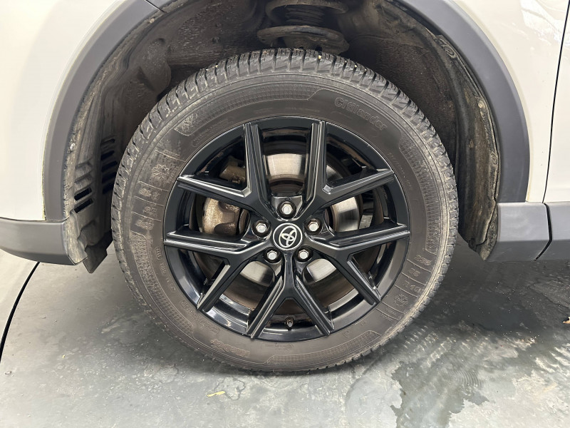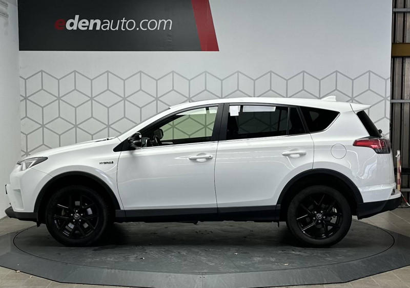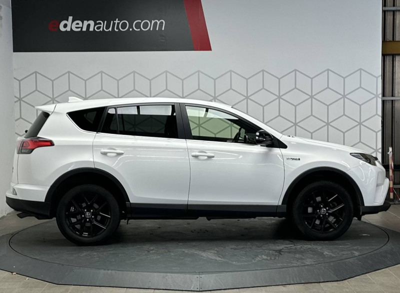 Accoudoir central AV avec compartiment de rangement / Airbags protège-genoux conducteur / Antenne type requin / Badge spécifique "Black Edition" / Bandeau de planche de bord gainé de cuir noir / Ceintures de sécurité avant réglables en hauteur, avec prétensionneurs et limiteurs de force / Ciel de pavillon gris / Ciel de pavillon noir / Climatisation à régulation automatique et à réglages séparés bi-zone / Coques de rétroviseurs noires / Direction assistée électrique (EPS) / Ecran couleur multifonctions TFT 4.1" / Essuie-glaces AV à détecteur de pluie / Fermeture centralisée avec commande à distance / Indicateur de sous-gonflage des pneus / Indicateur de température extérieure / Jantes alliage 18" Tanami noires / Poignées de portes et rétroviseurs extérieurs couleur carrosserie / Protections de soubassement AV et AR noires / Rétroviseur intérieur électrochromatique (position jour/nuit automatique) / Rétroviseurs extérieurs électriques et dégivrants avec rappels de clignotants intégrés / Système audio Toyota Touch 2: Ecran couleur tactile 7" multifonction, système de téléphonie Bluetooth, connectique auxiliaire/USB compatible iPod et 6HP / Système de contrôle de la motricité (TRC) et de stabilité (VSC) / Système de freinage antiblocage ABS + BA + EBD / Système d'ouverture et de démarrage sans clé (Smart Entry & Start) / Système intelligent de plancher plat / Tapis de sol AV et AR en velours RAV4 Hybrid / Toit ouvrant électrique en verre / Toyota Safety Sense / Vitres AV et AR électriques à fonction antipincement + descente et remontée à impulsion pour le conducteur